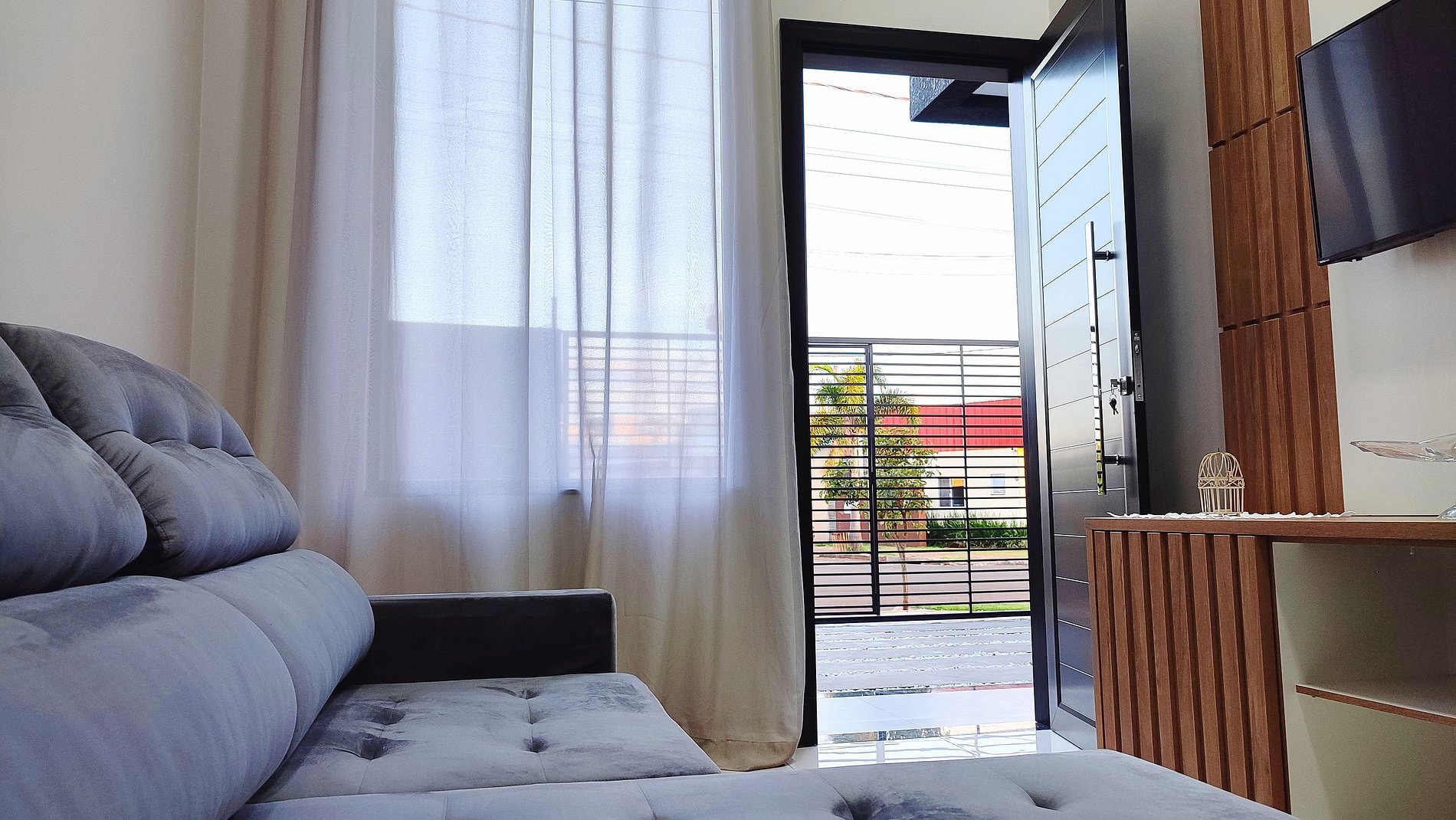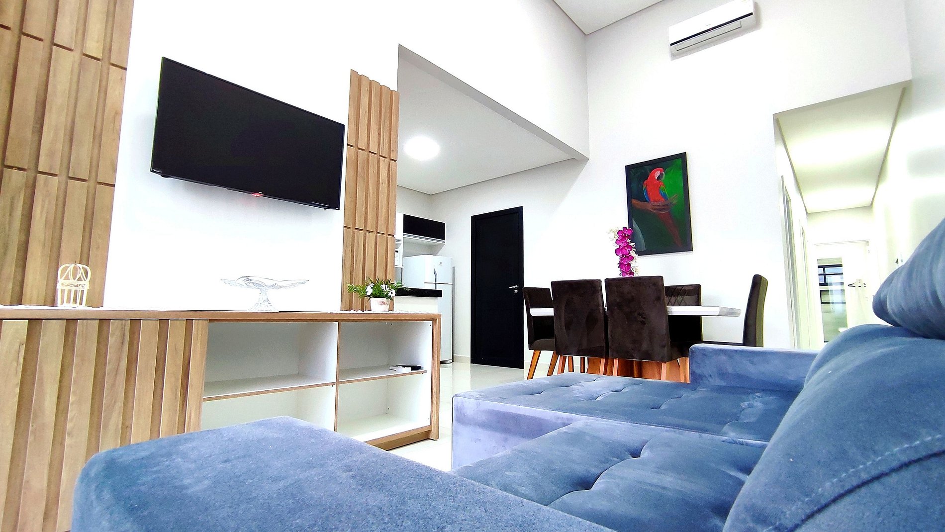 Sala de estar com o sofá cama e smartTV (sofá cama quando 8 hospedes, deixamos a roupa de cama e travesseiros)