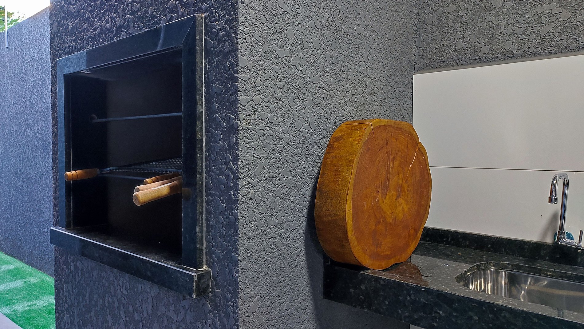 Churrasqueira com grelha e espetos.