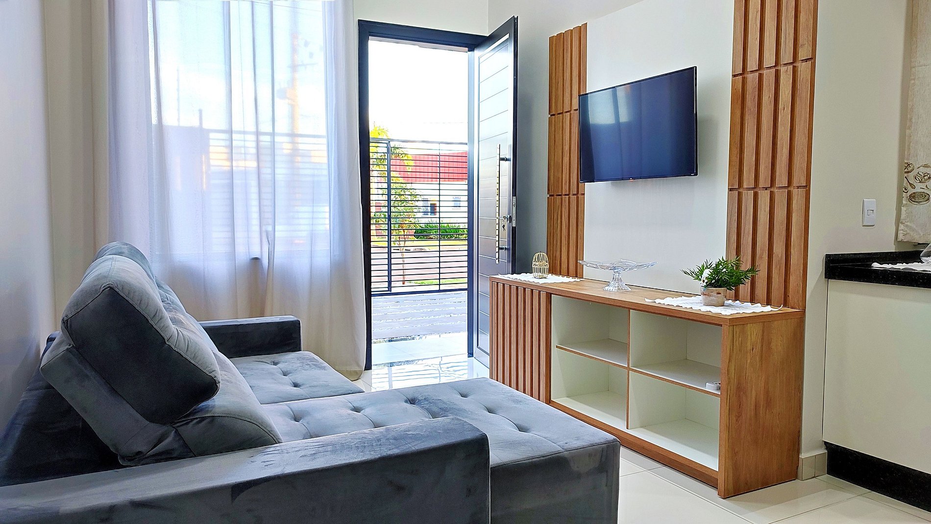 Sala de estar com o sofá cama e smartTV (sofá cama quando 8 hospedes, deixamos a roupa de cama e travesseiros)