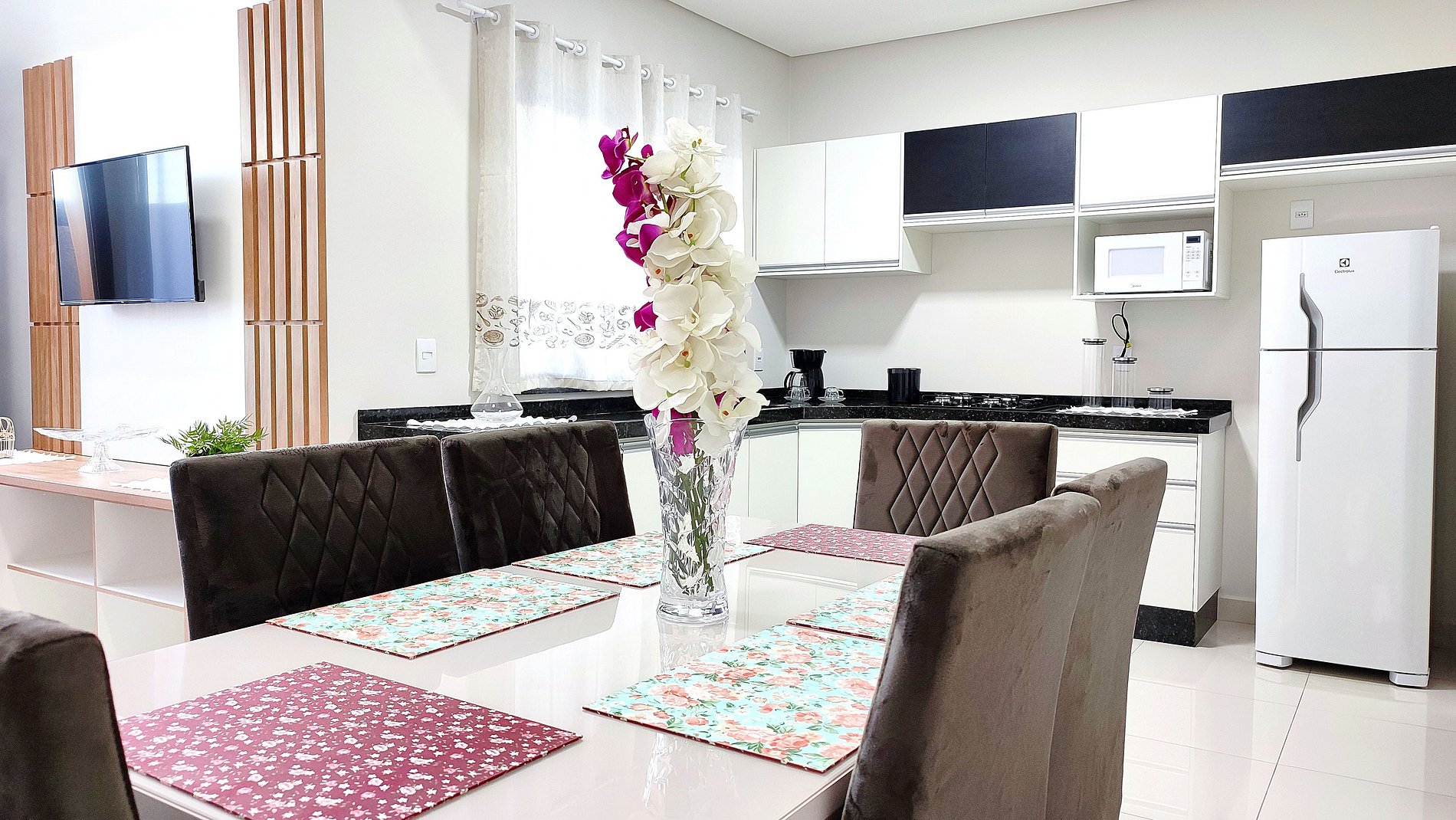Cozinha completa com todos os utensílios domésticos, cafeteira elétrica, sanduicheira, microondas...