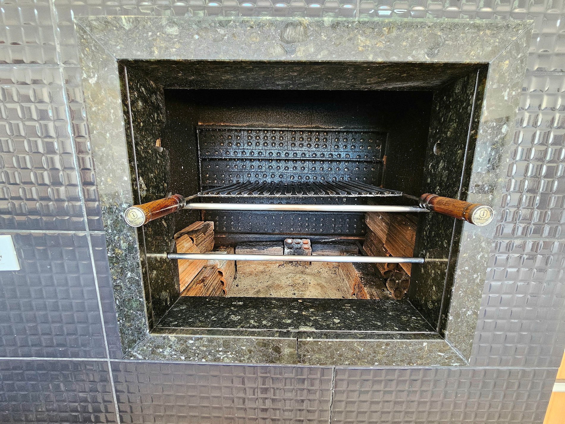 Churrasqueira com espetos e grelhas.