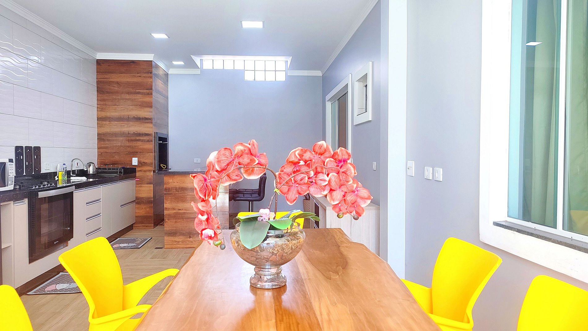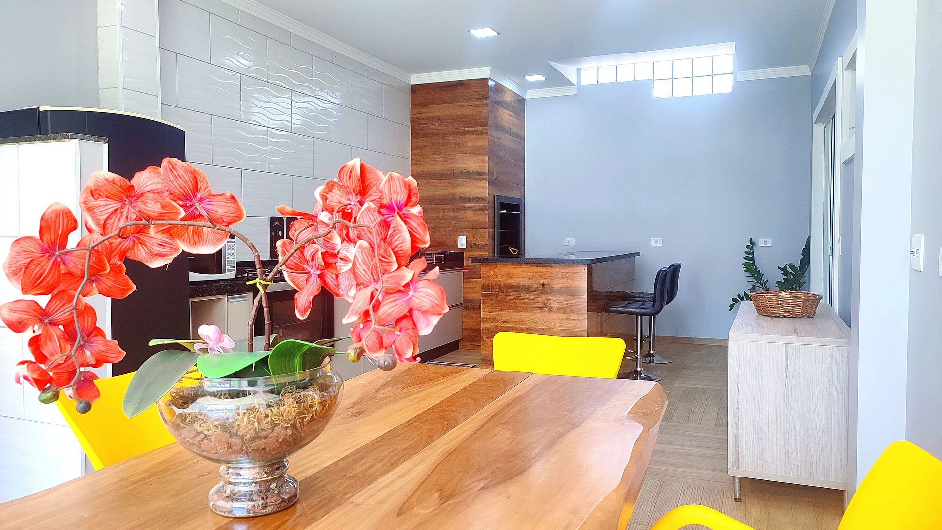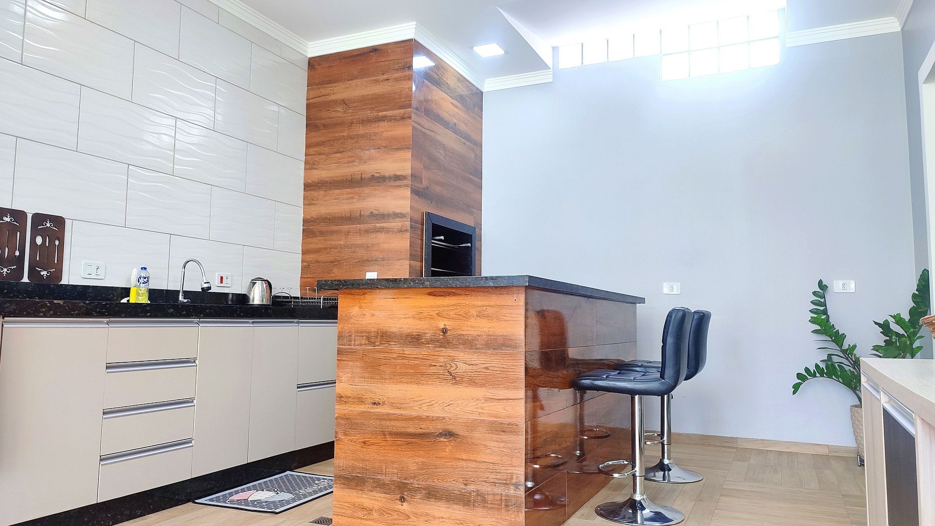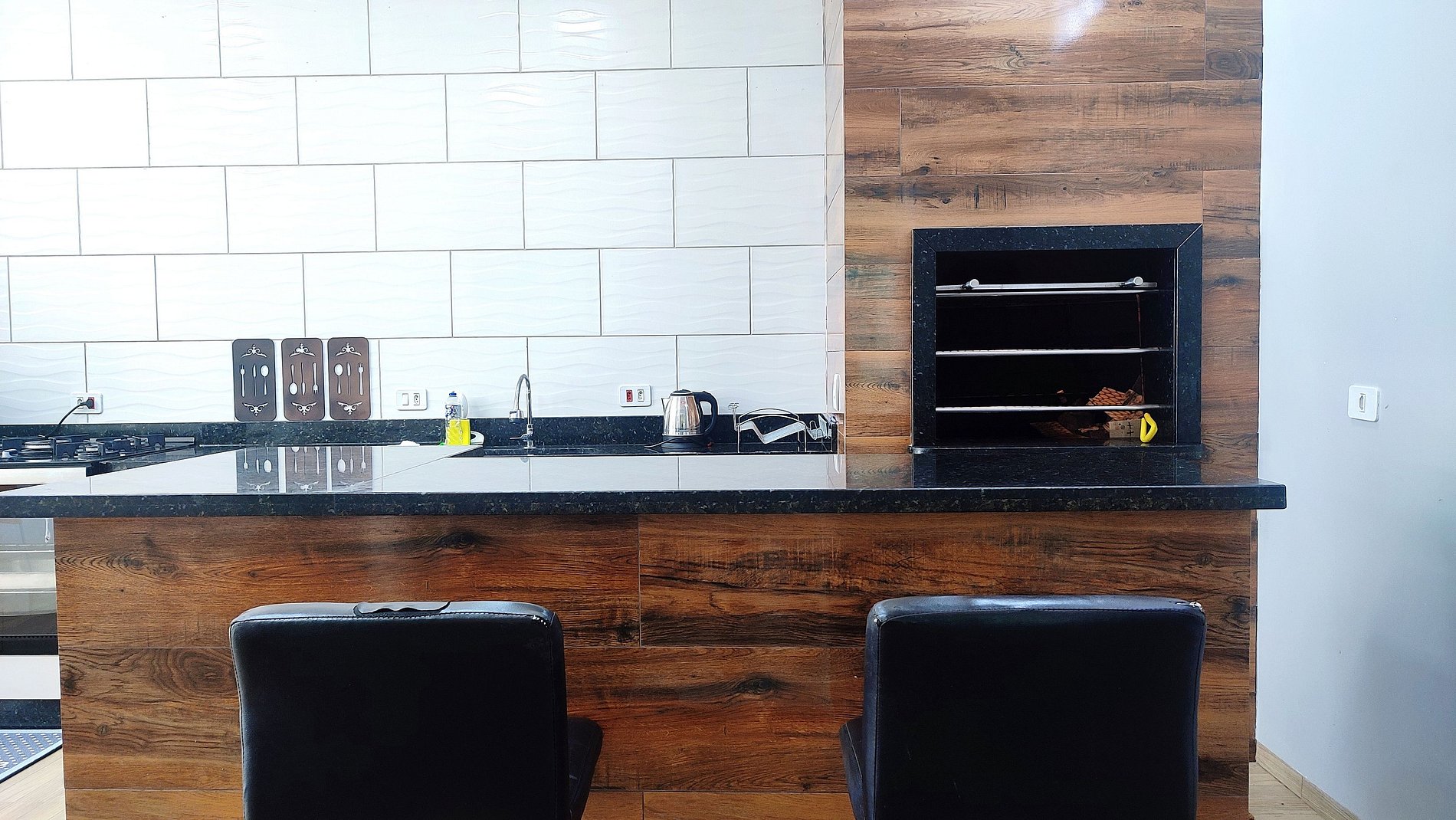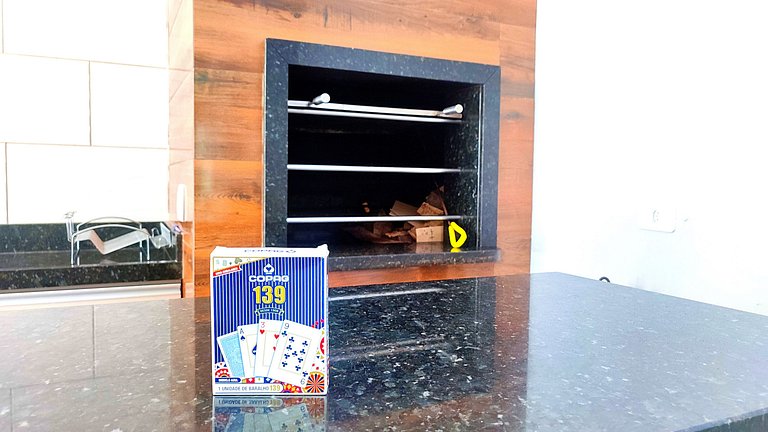 > Linda area gourmet com churrasqueira equipada com os espetos + geladeira, fogão com forno, microondas, e todos os utensílios para cozinhar, e as louças para as refeições.