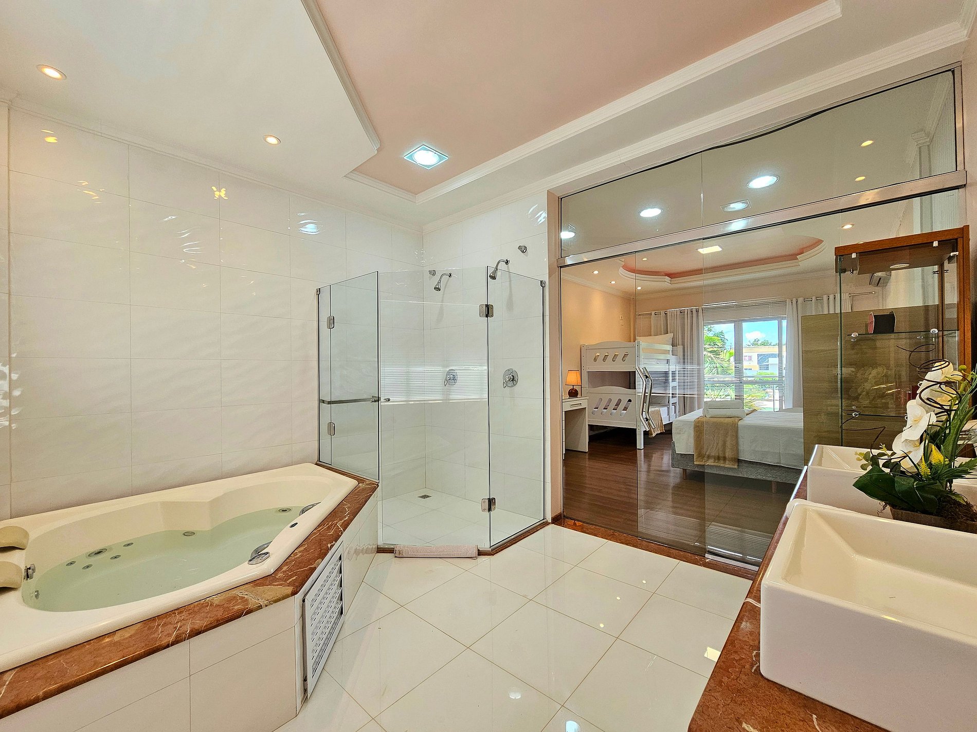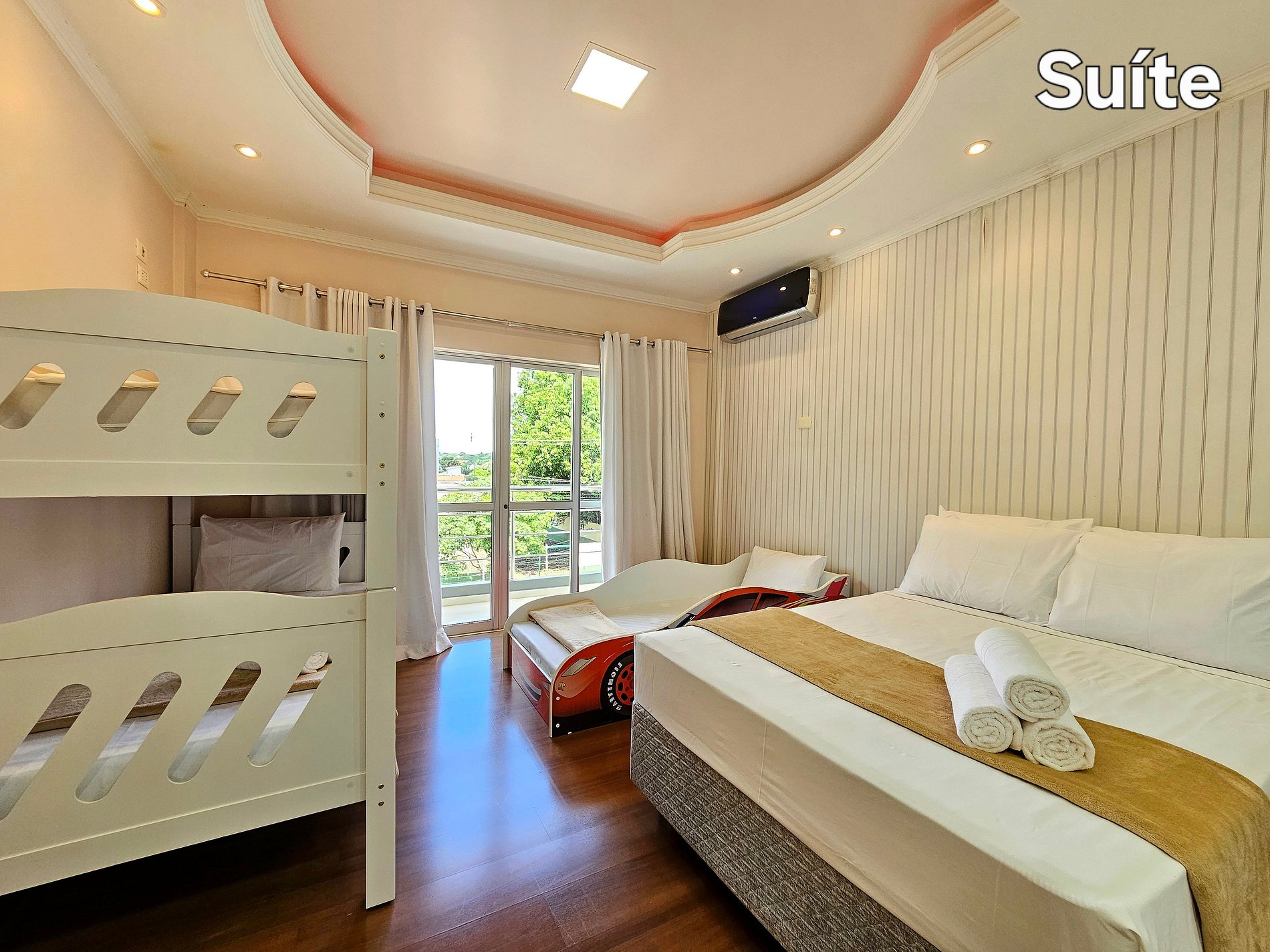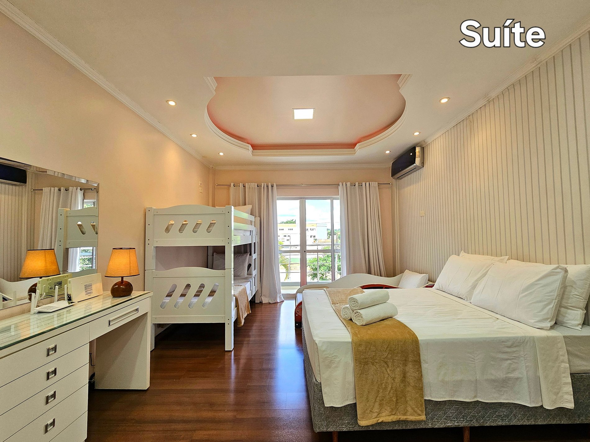01 suite: 01 cama casal + 01 cama solteiro + 01 beliche para 2, com banheiro e banheira de hidromassagem