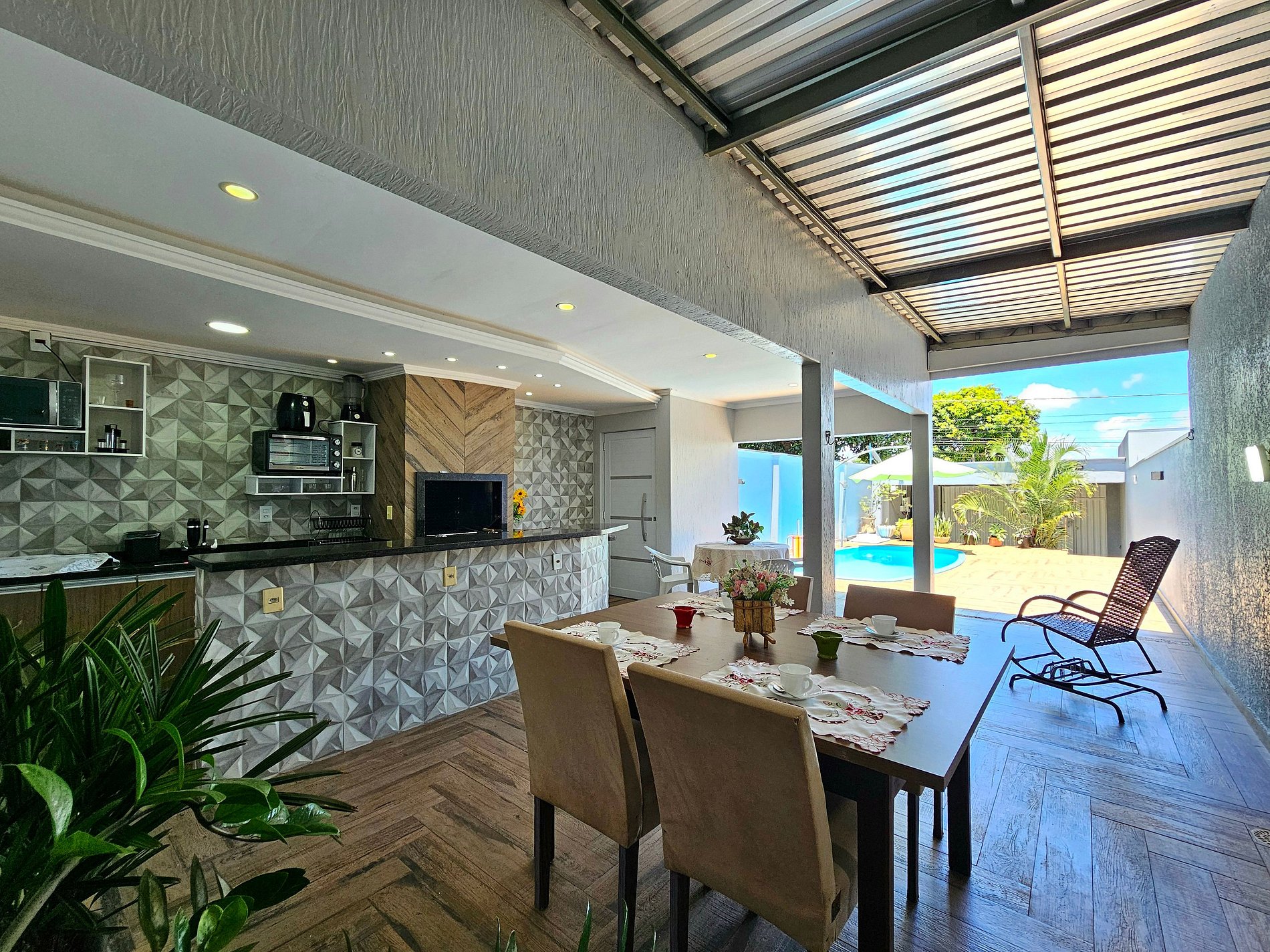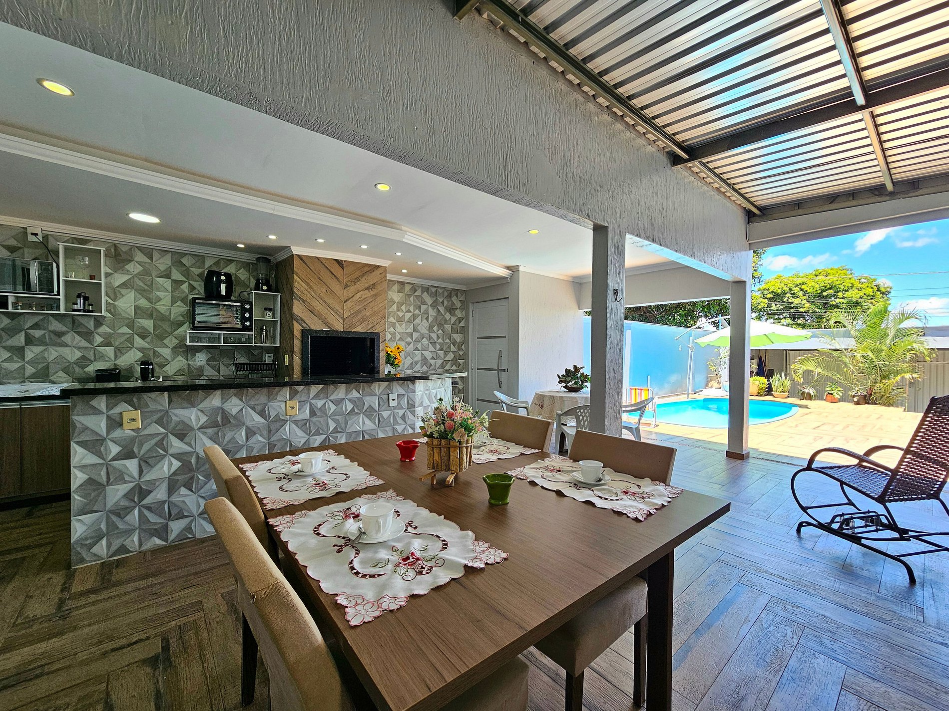 > Area Gourmet com piscina e Churrasqueira com os utensílios para churrasco.