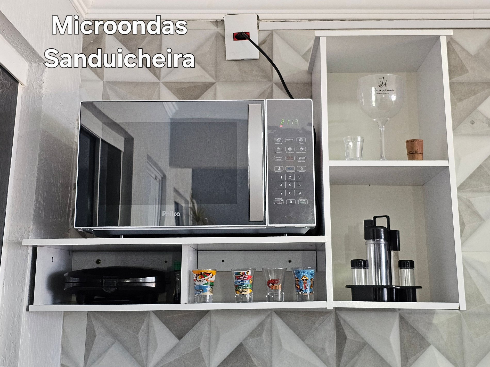 > 2 Cozinhas interna e externa com geladeira, fogão, forno, microondas, e todos os utensílios para cozinhar, e as louças para as refeições. Sanduicheira e cafeteira eletrica.