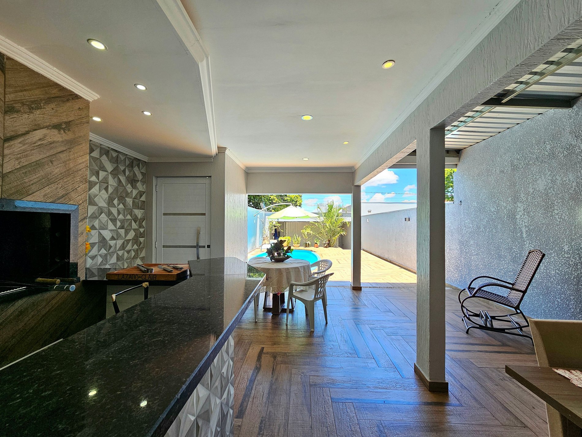 > Area Gourmet com piscina e Churrasqueira com os utensílios para churrasco.