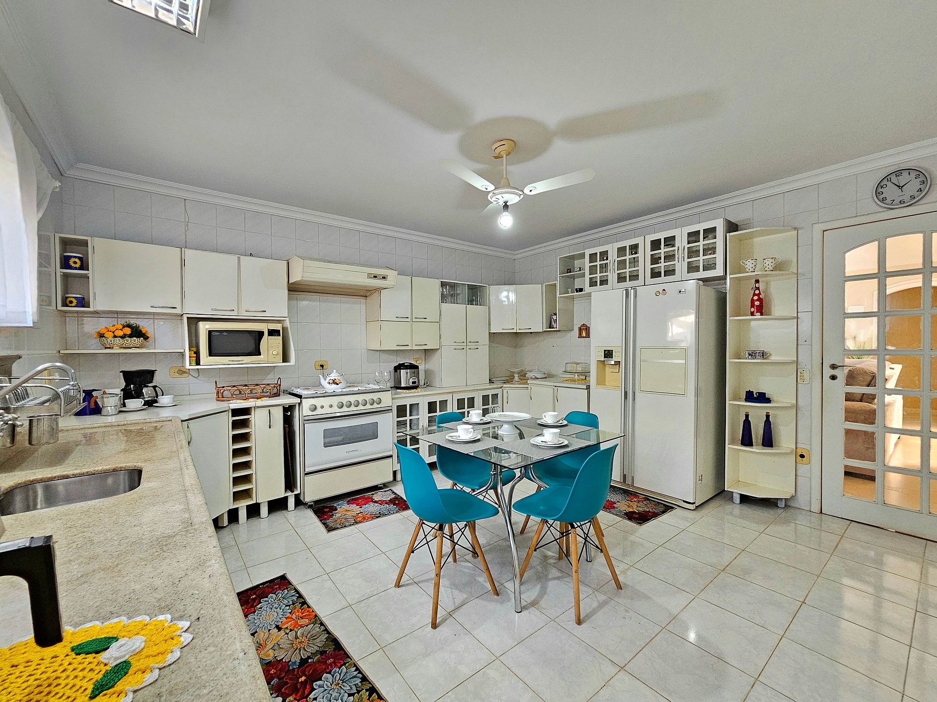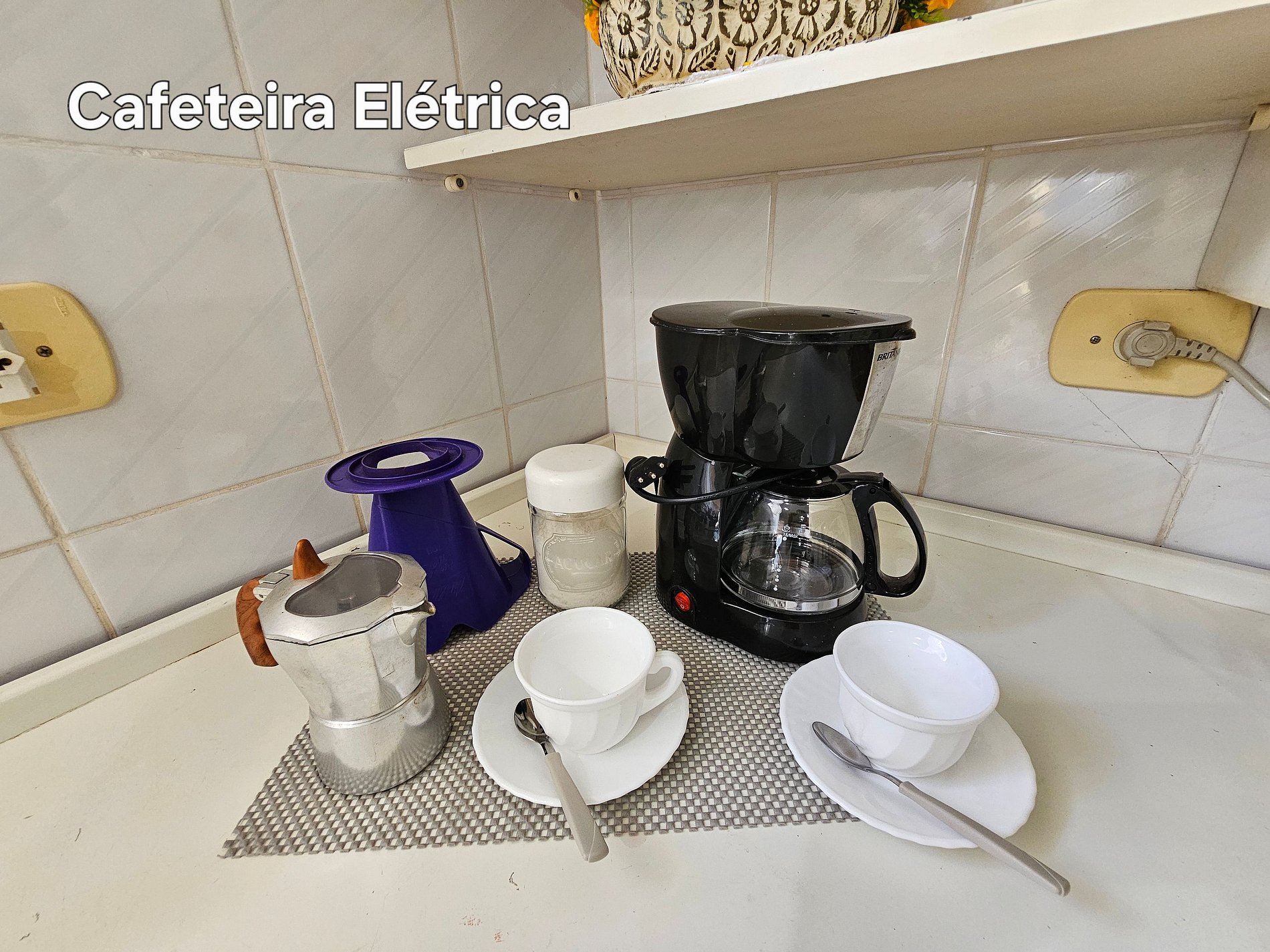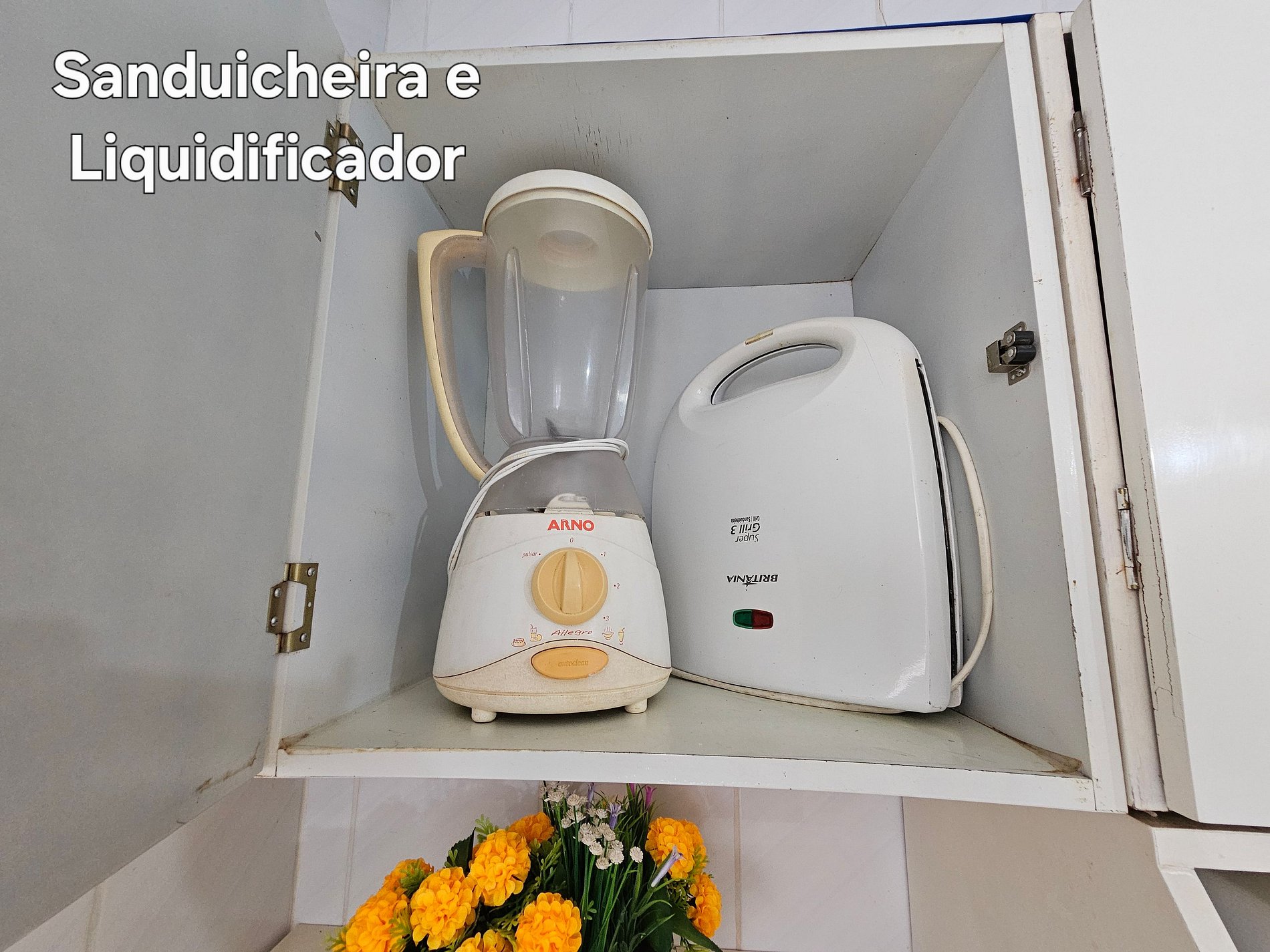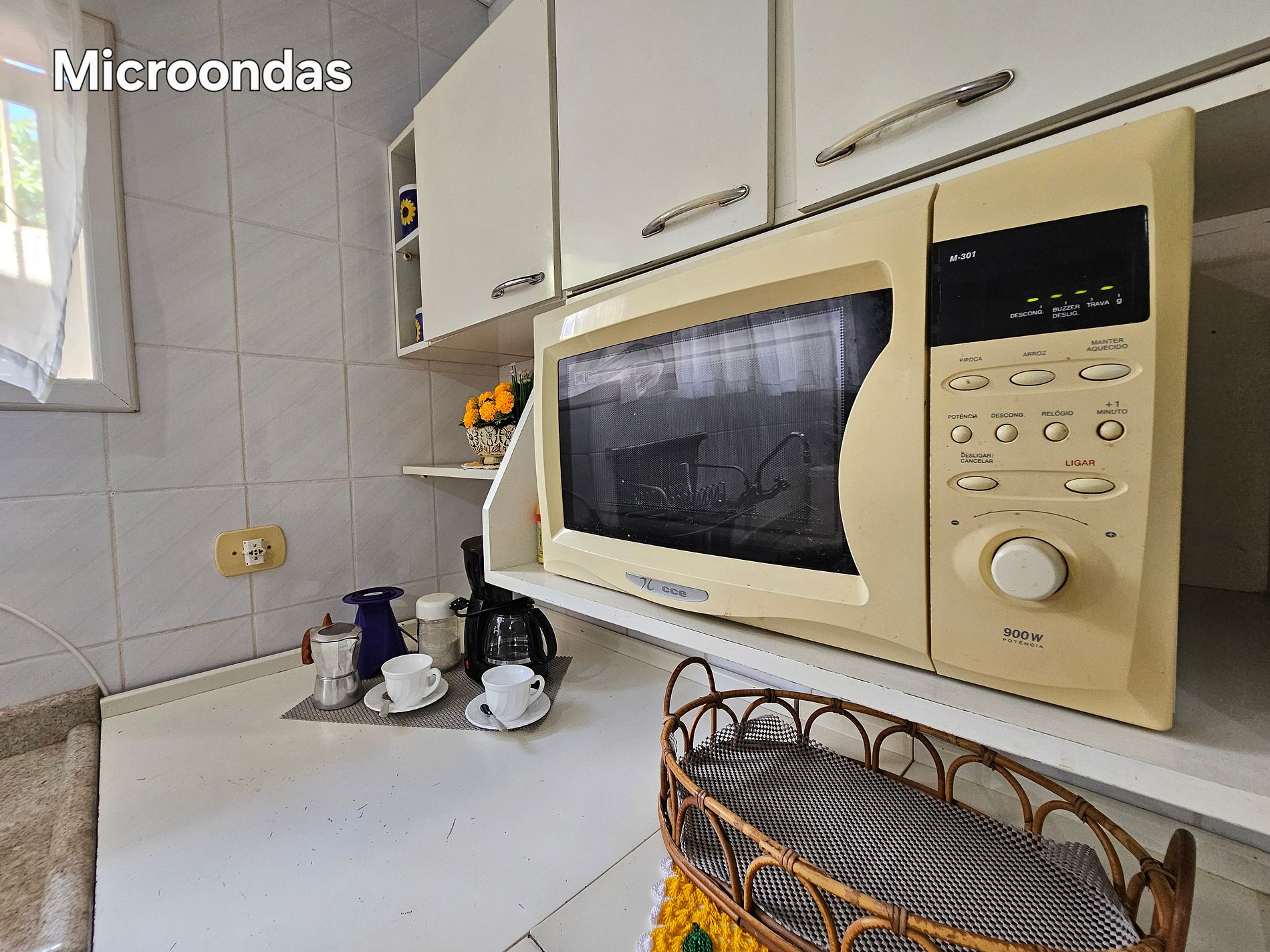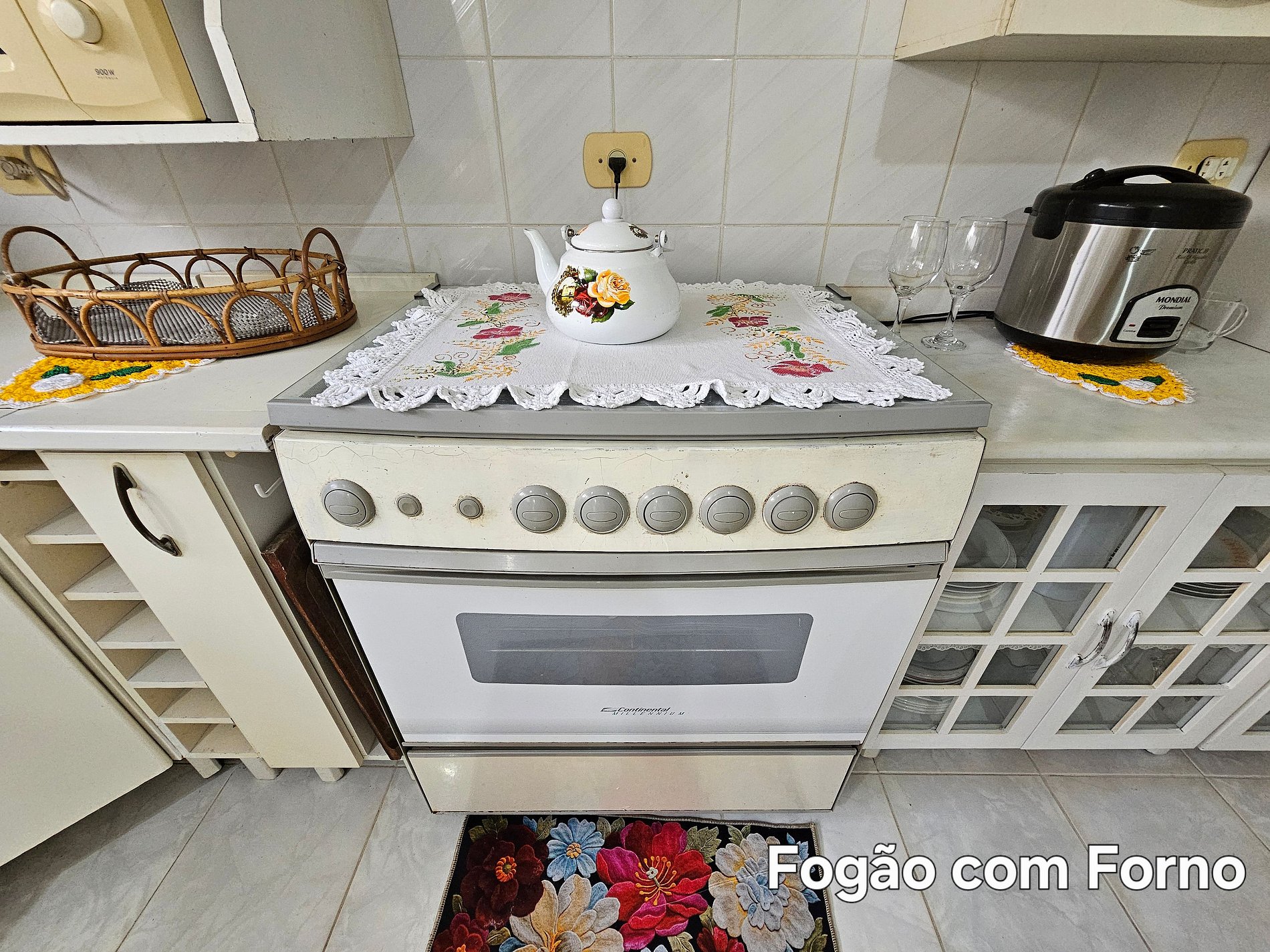 > Cozinha completa com geladeira, fogão, forno, microondas, e todos os utensílios para cozinhar, e as louças para as refeições. Sanduicheira e cafeteira eletrica.