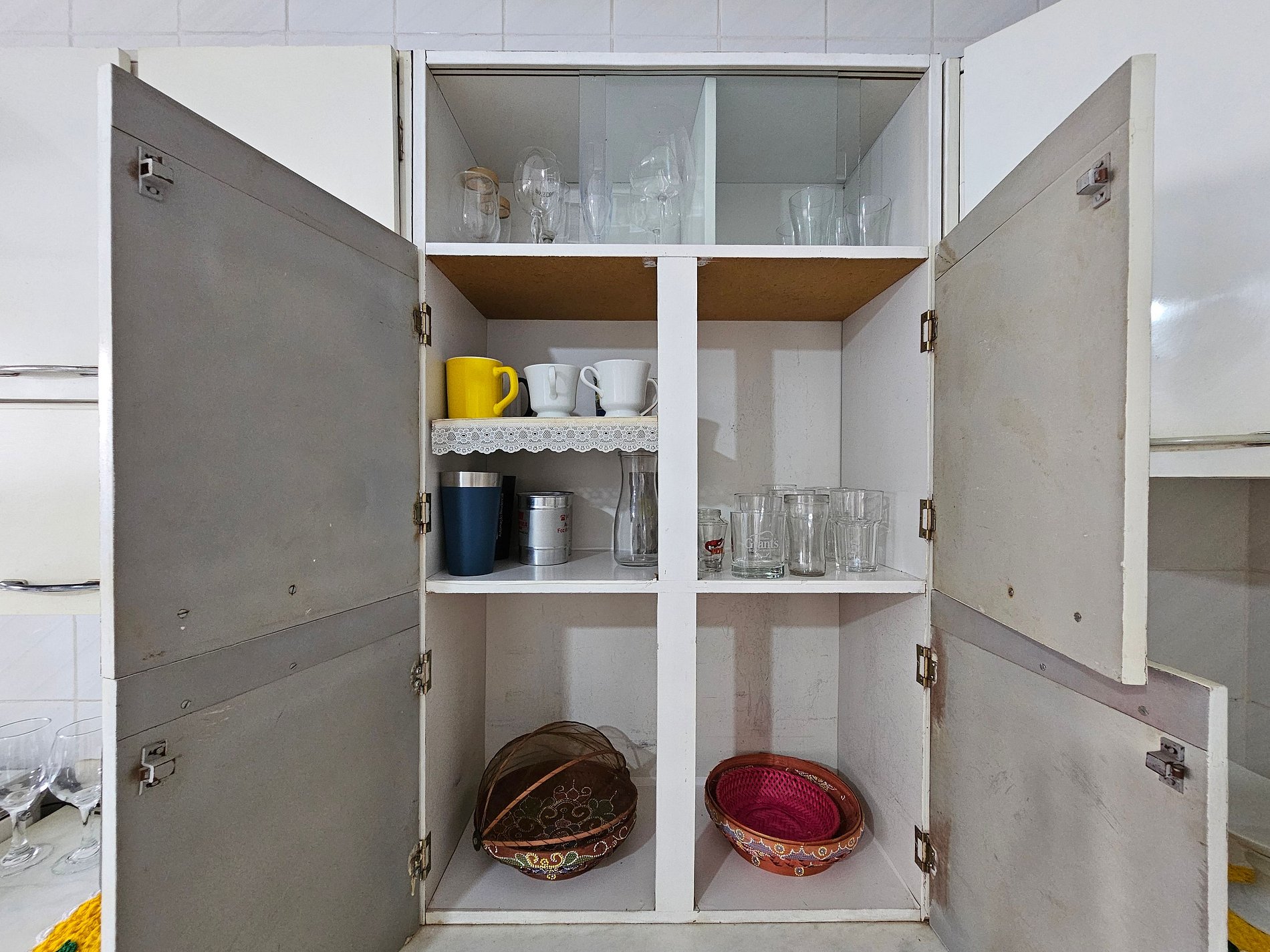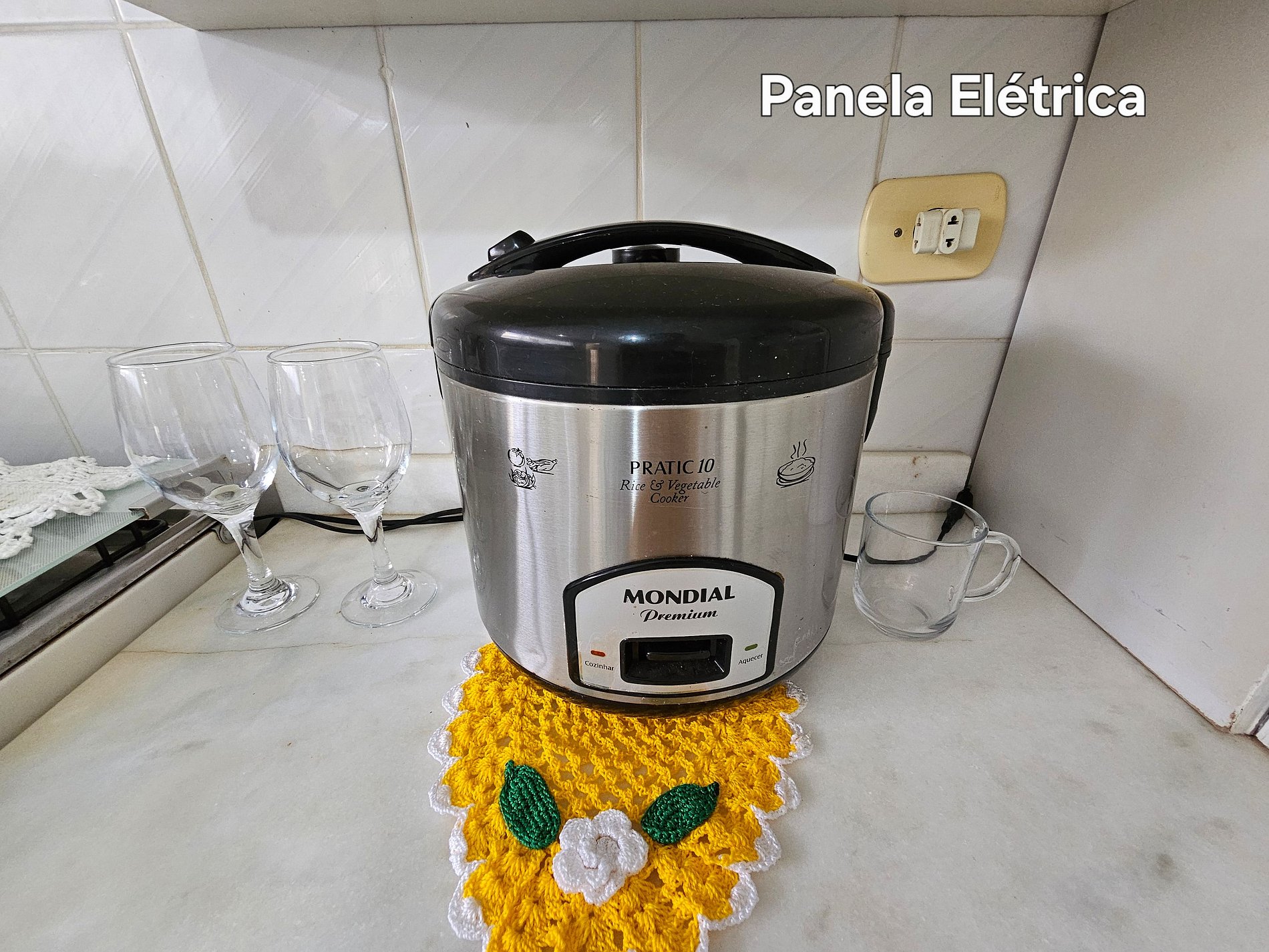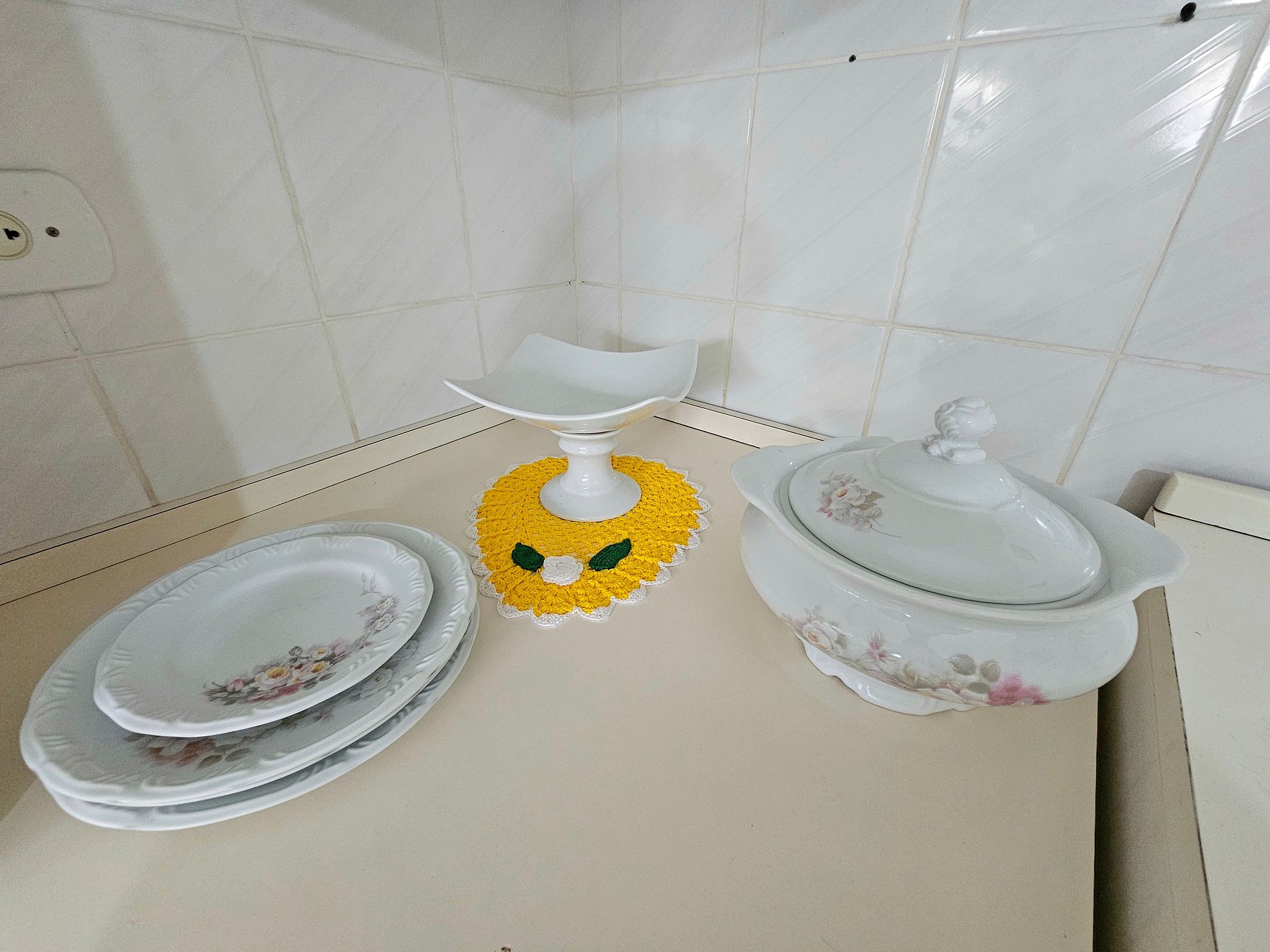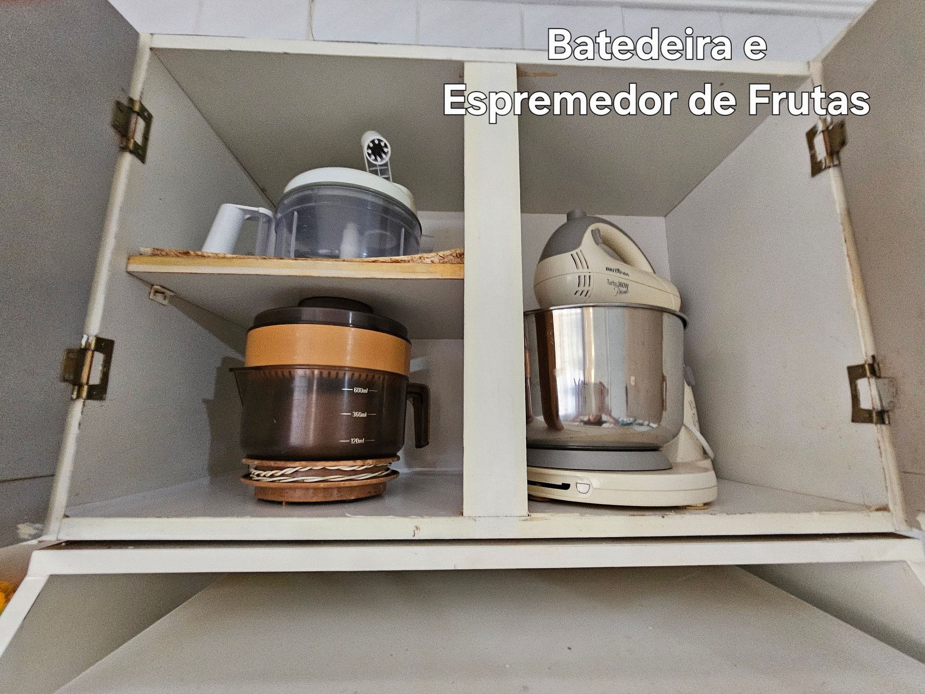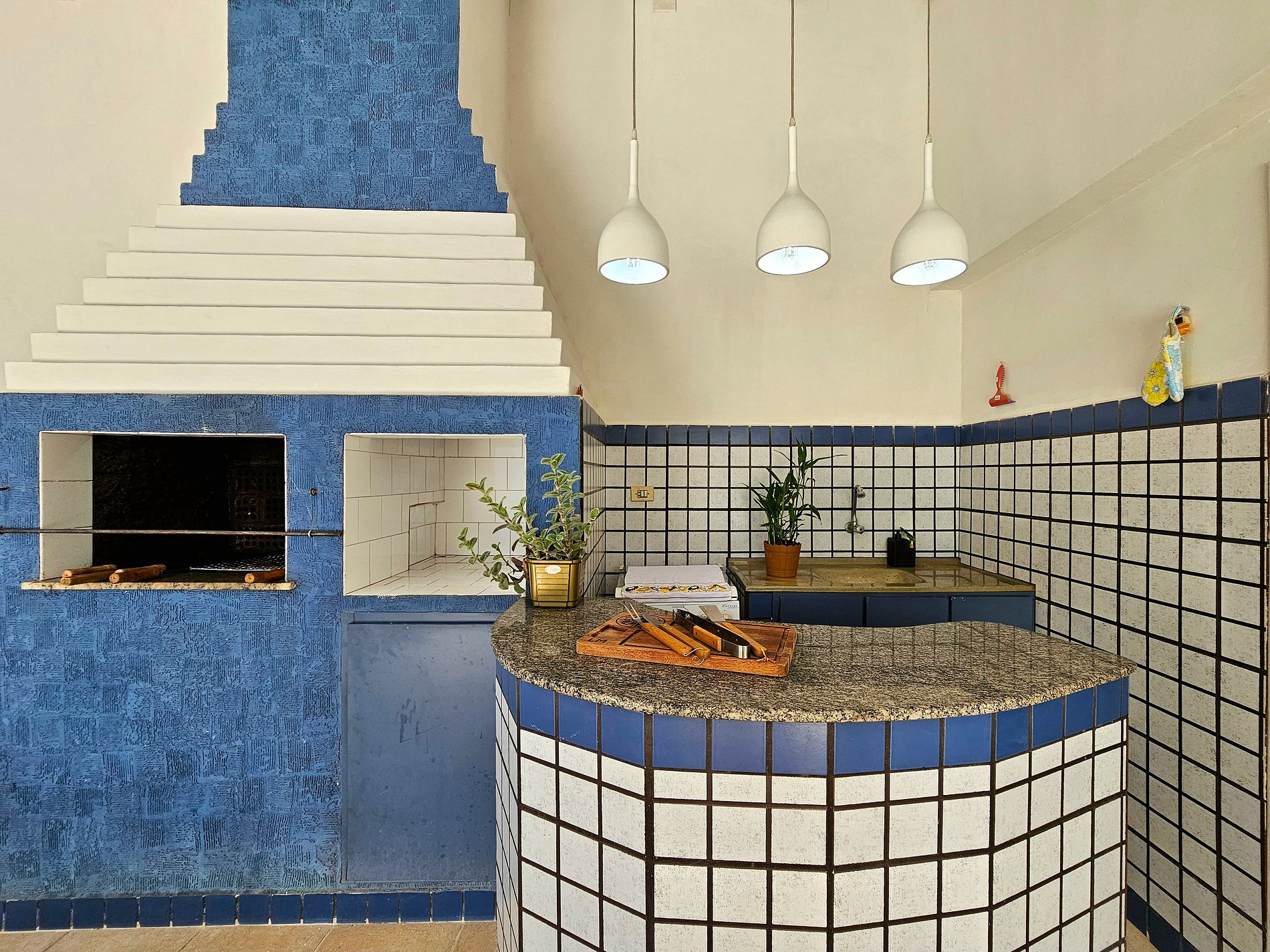 > Cozinha completa com geladeira, fogão, forno, microondas, e todos os utensílios para cozinhar, e as louças para as refeições. Sanduicheira e cafeteira eletrica.
