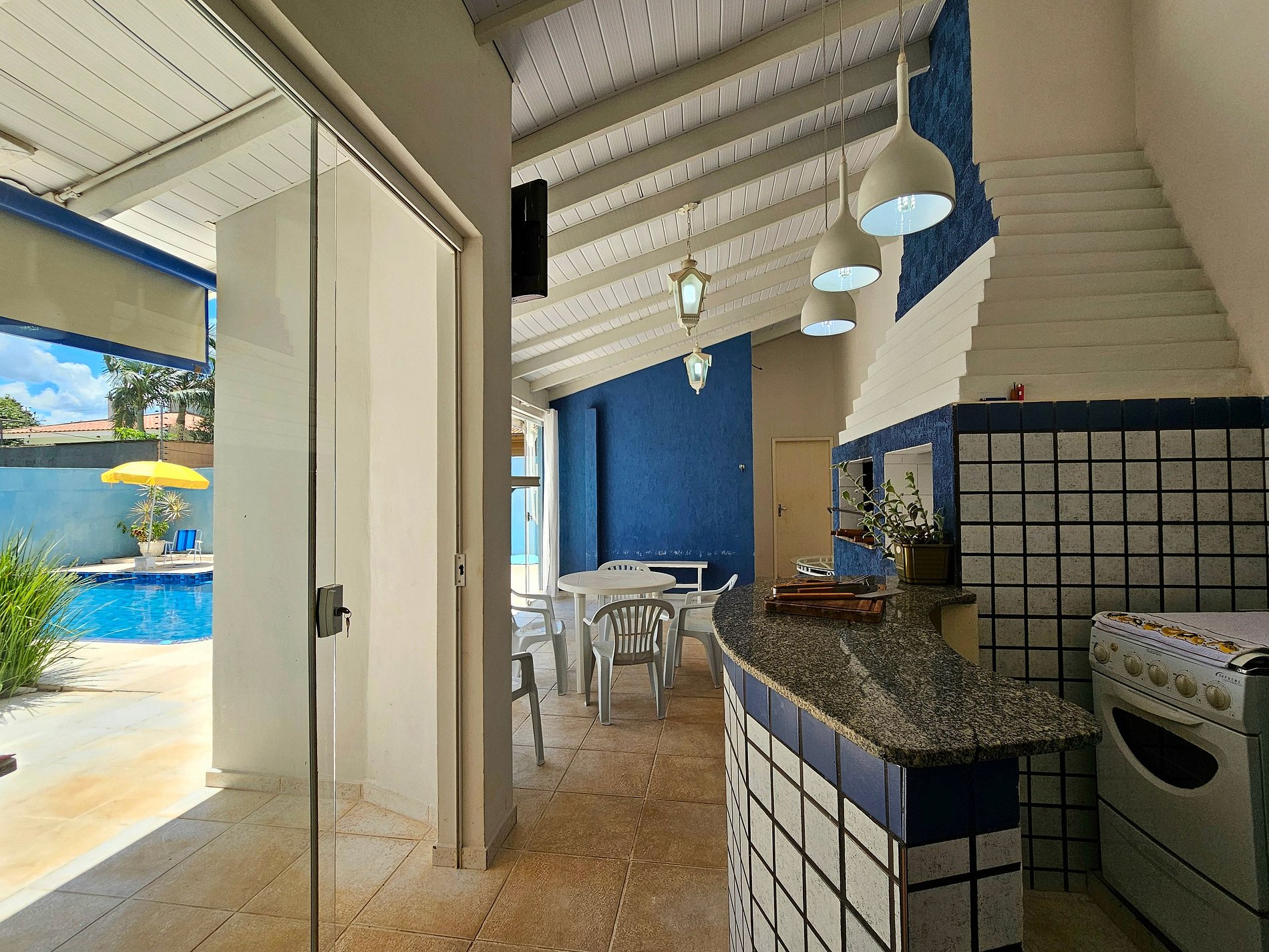 > Area Gourmet com piscina e Churrasqueira com os utensílios para churrasco.