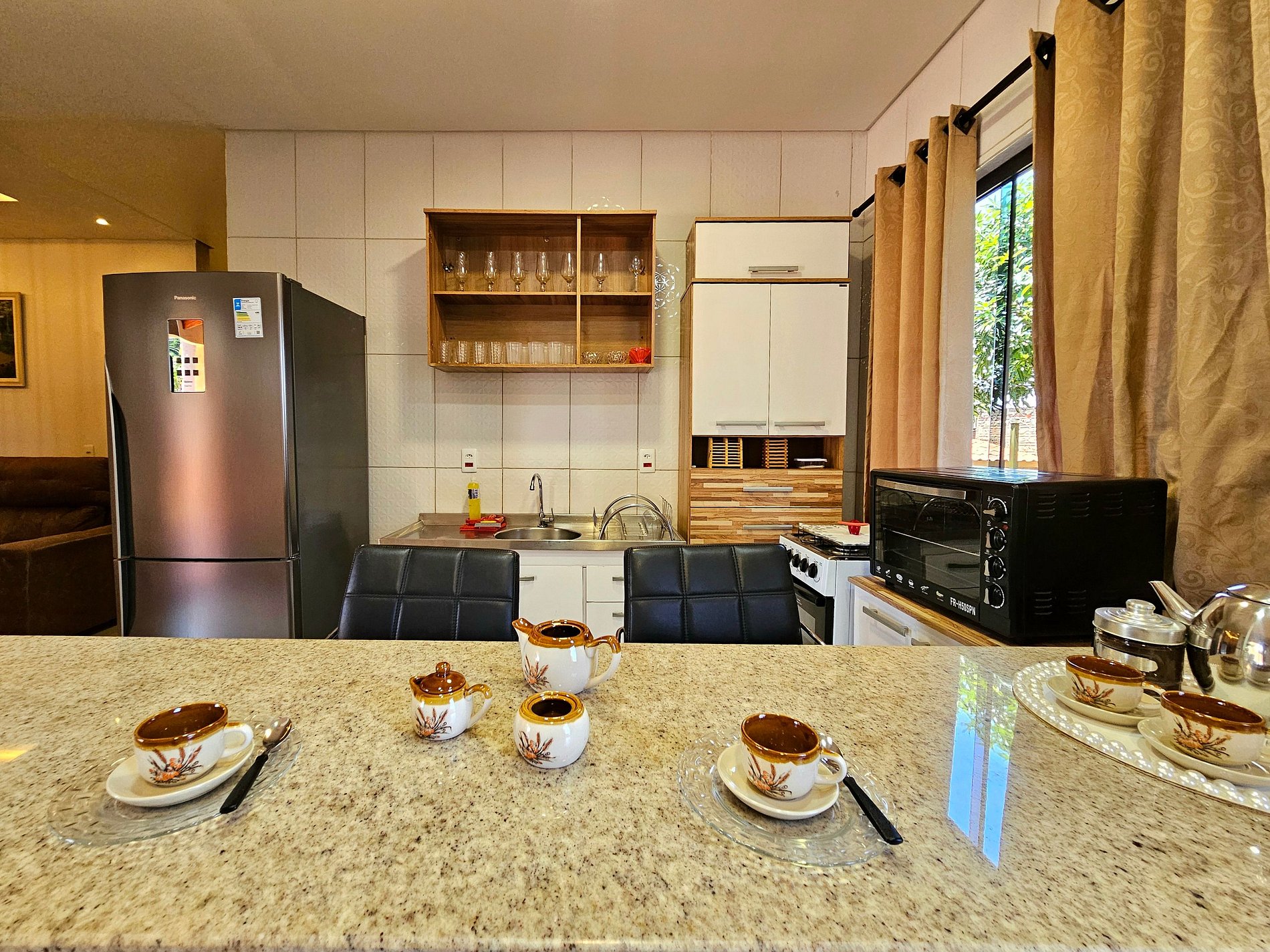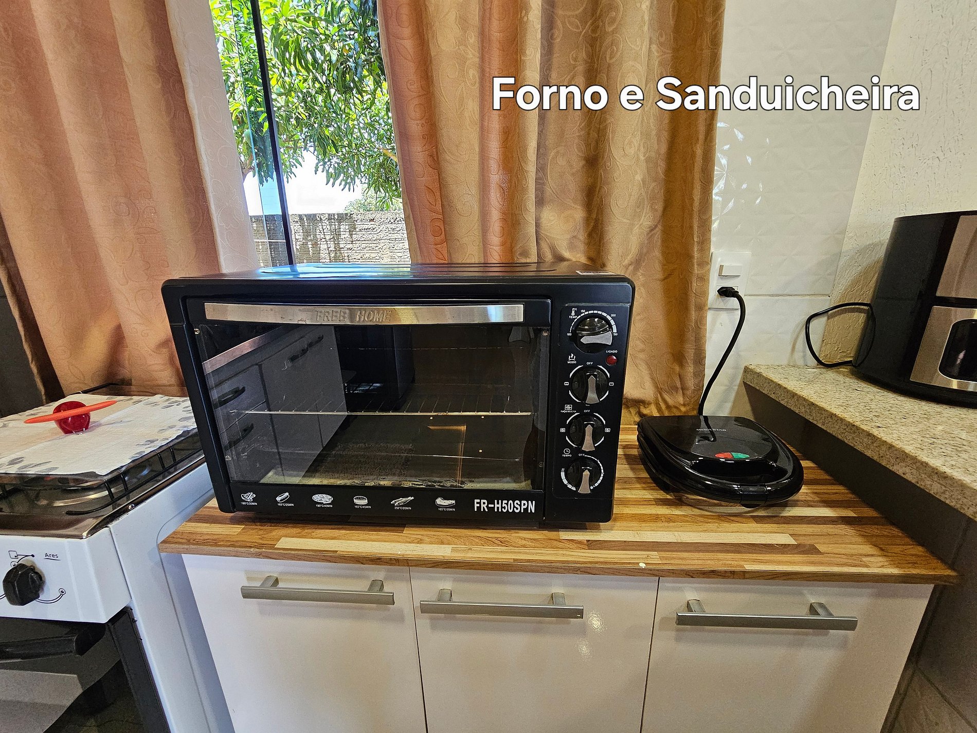 Cozinha completa com utensílios e louças para as refeições, fogão, forno elétrico e a gás, sanduicheira, liquidificador.
