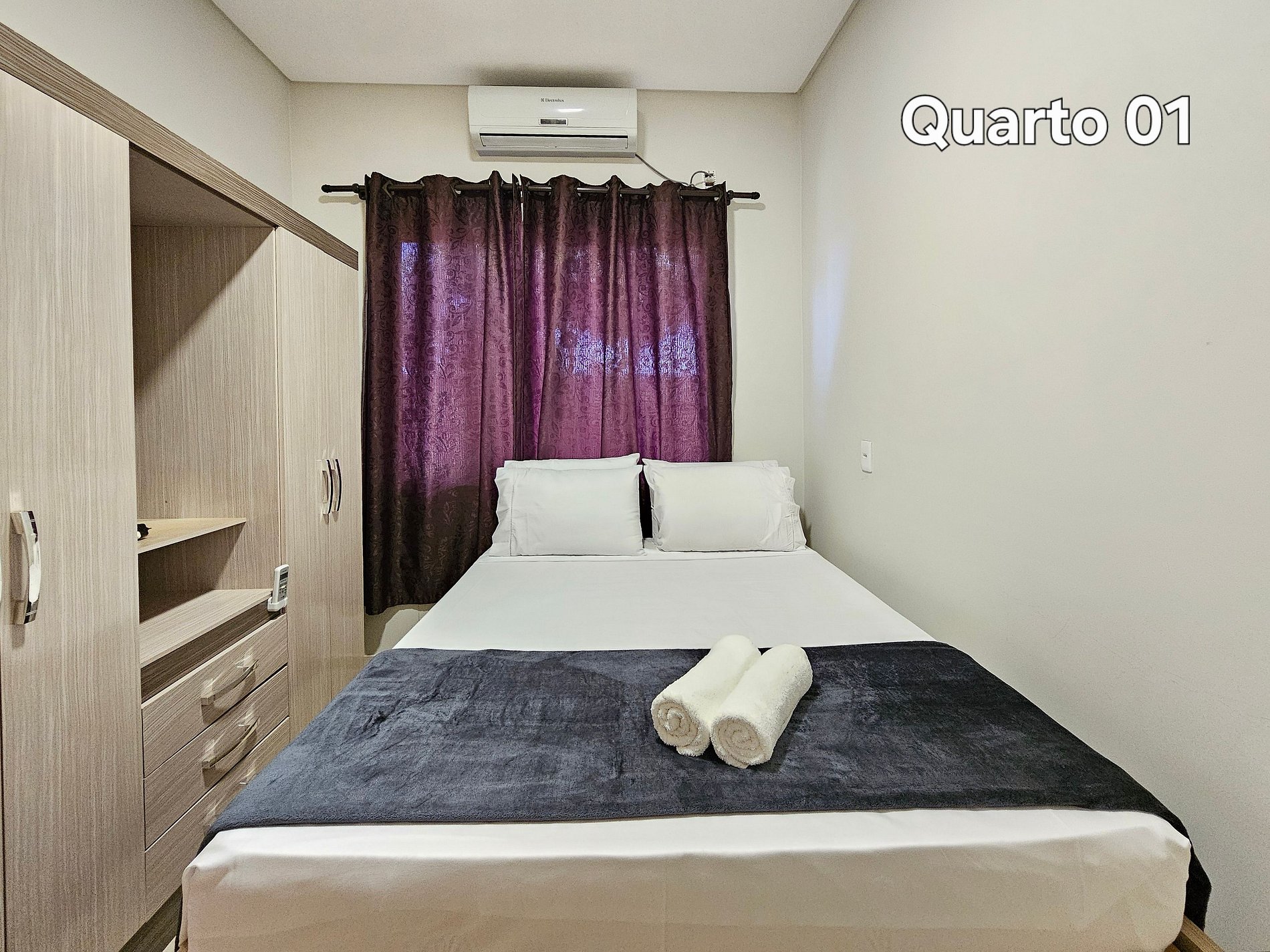 Quarto 01: 01 cama queen, com ar condicionado