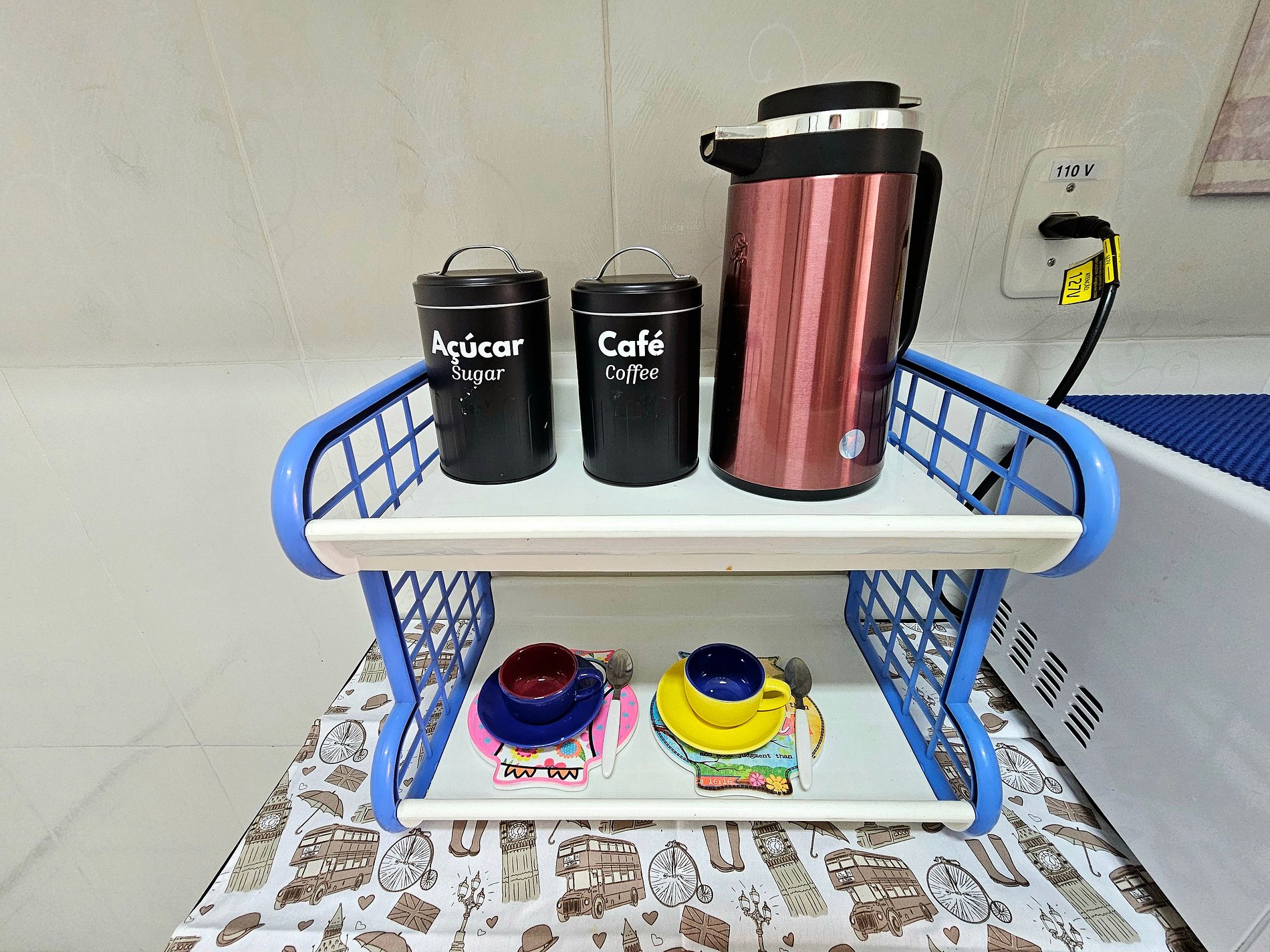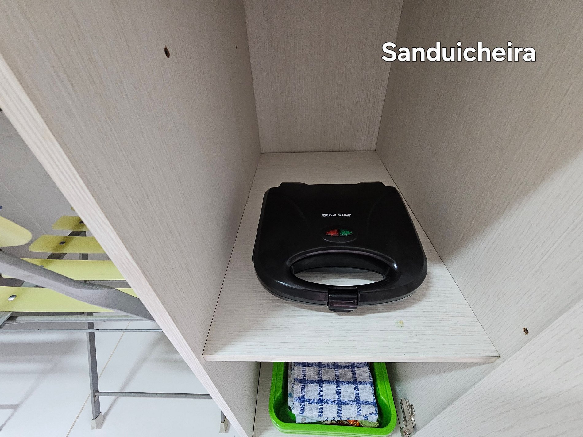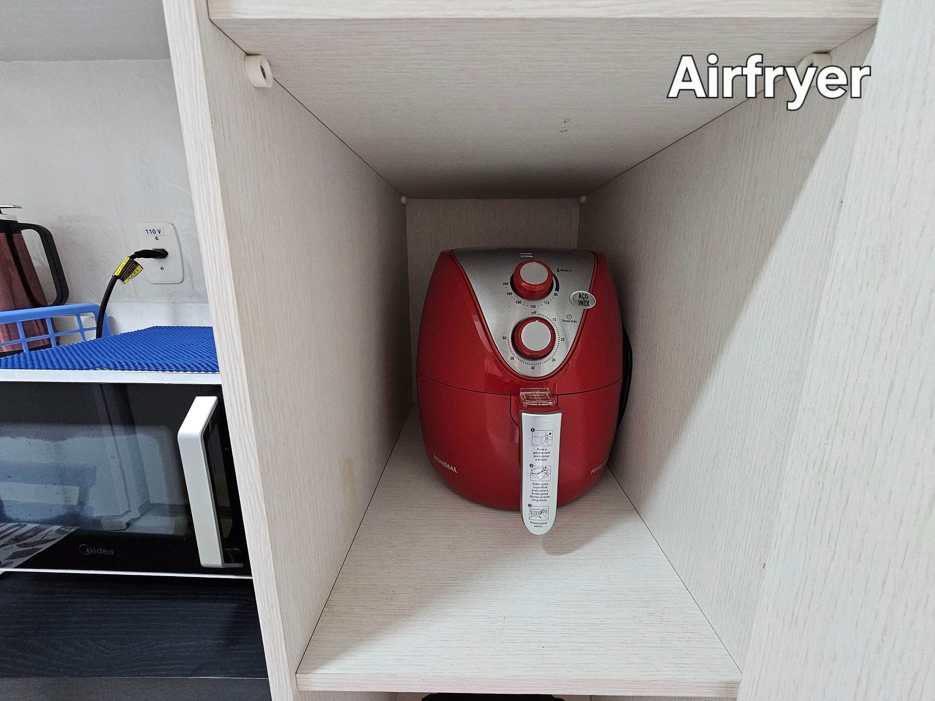 Cozinha completa com utensílios e louças para as refeições, microondas, sanduicheira, liquidificador, airfryer e chaleira elétrica.
