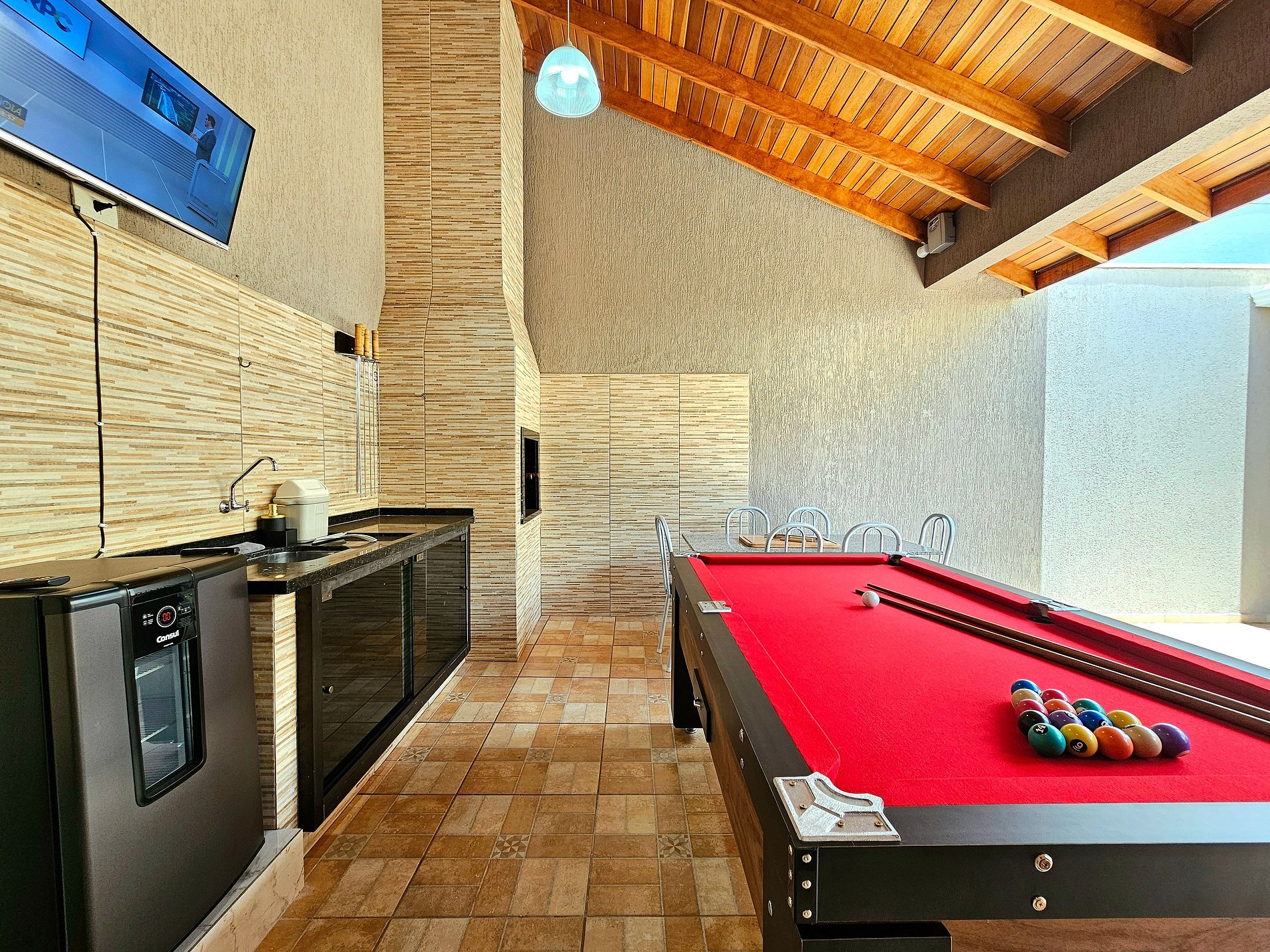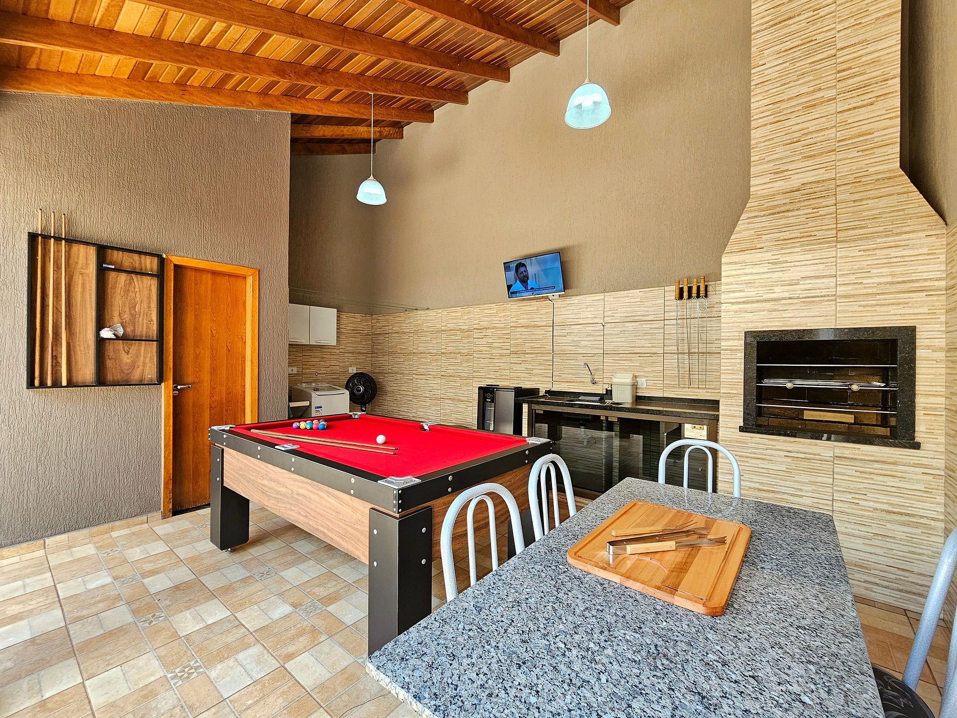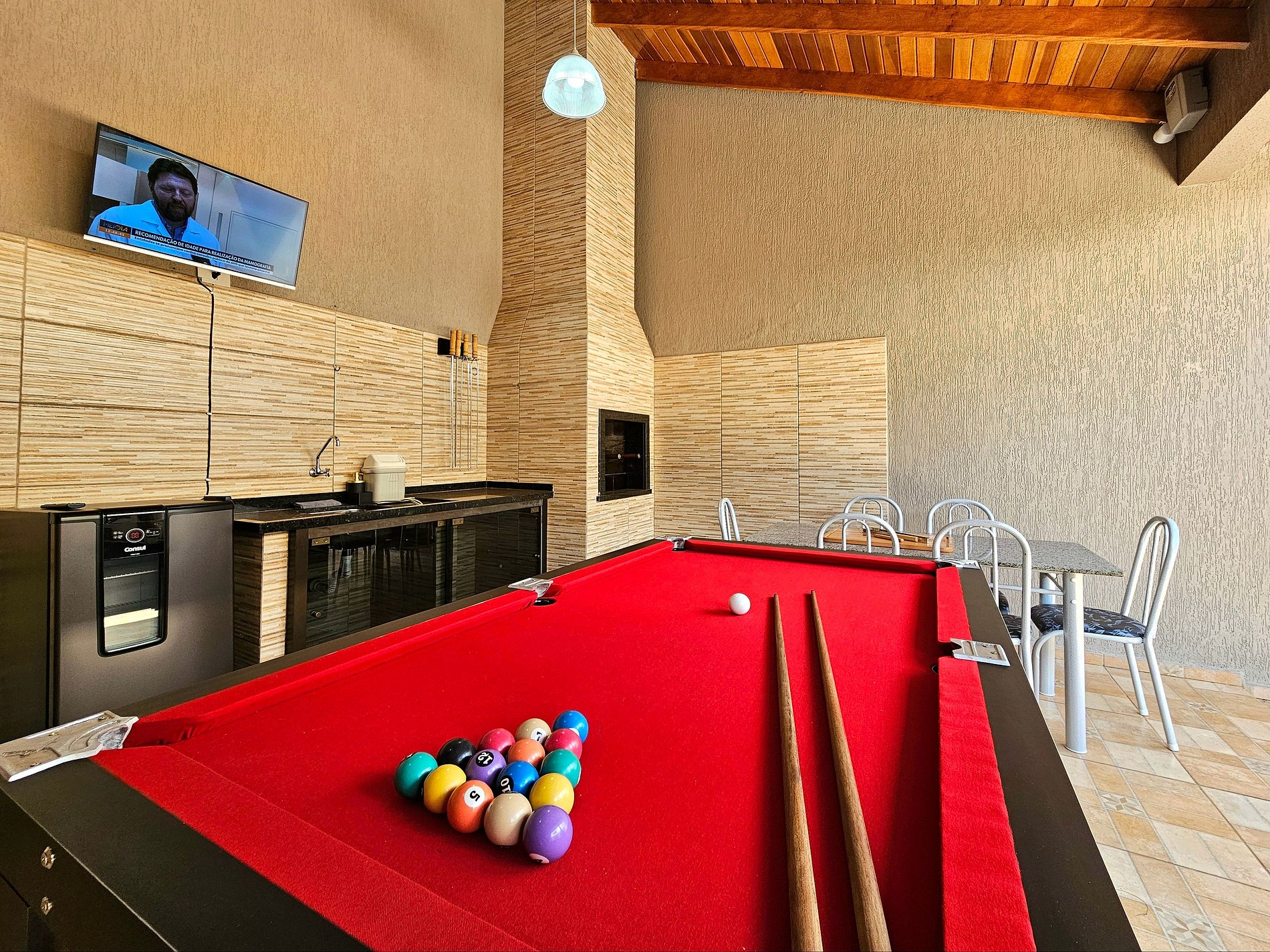 Area gourmet: Churrasqueira com grelha e espetos, mesa de sinuca e cervejeira.