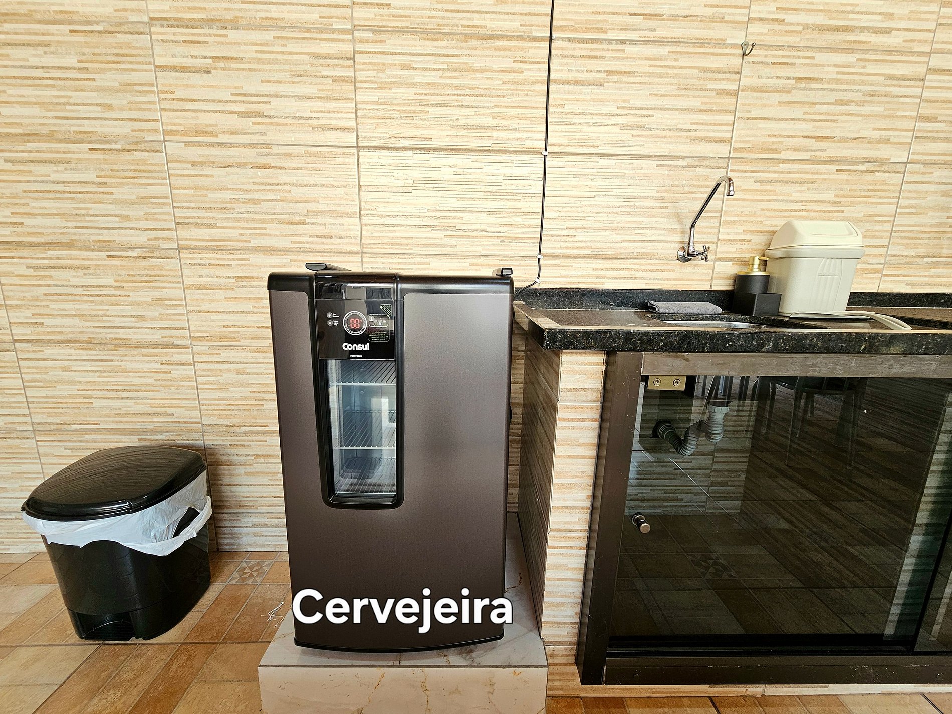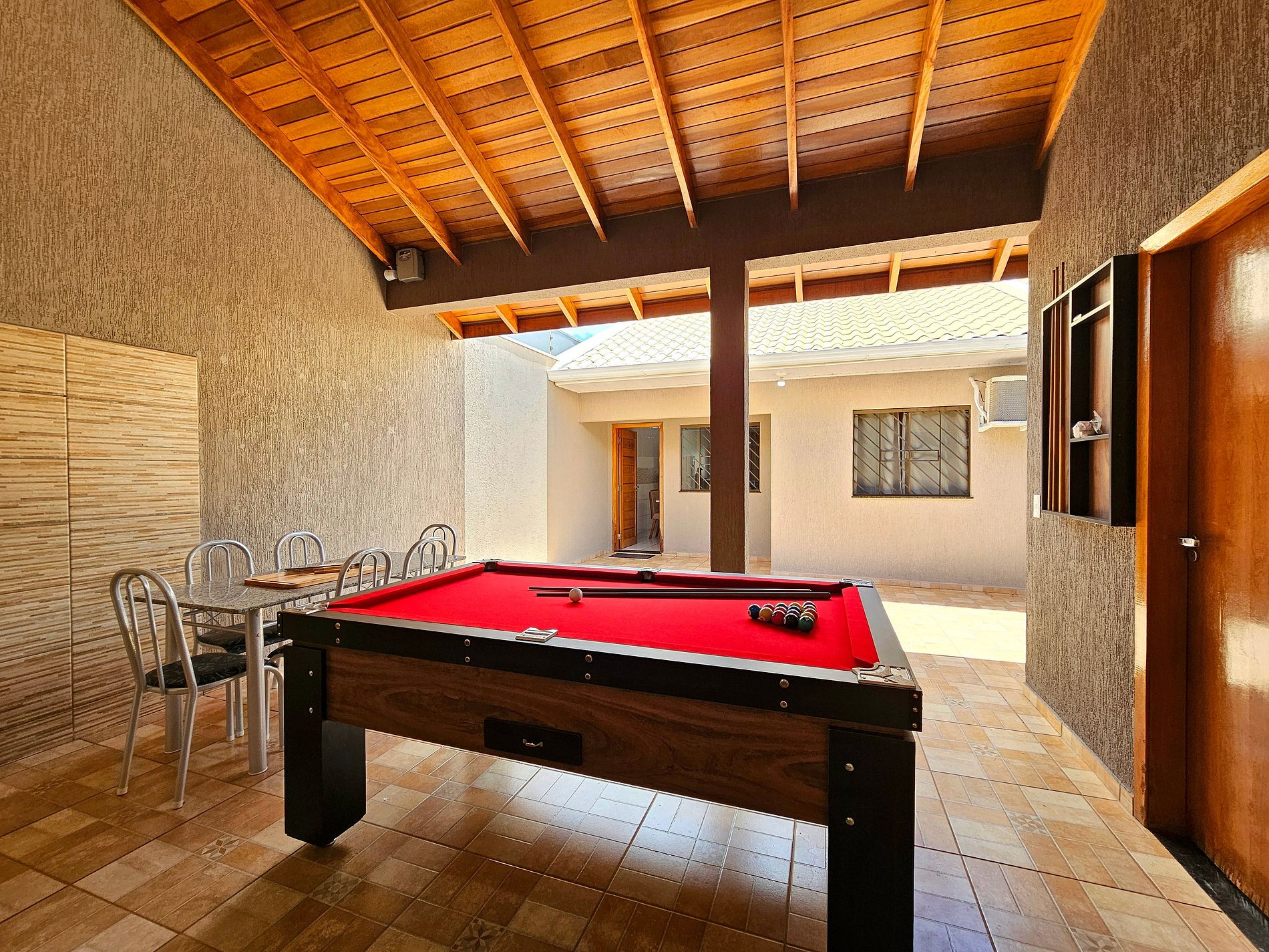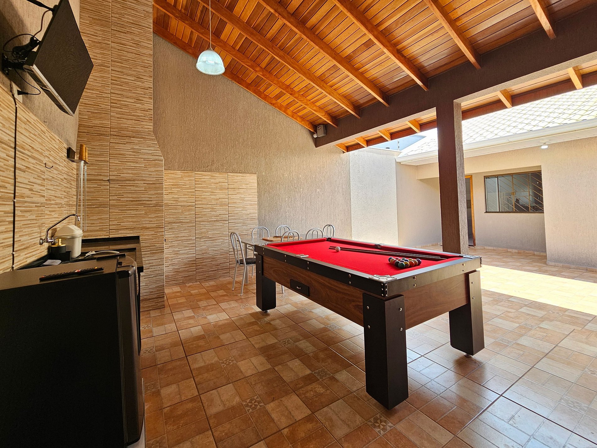 Area gourmet: Churrasqueira com grelha e espetos, mesa de sinuca e cervejeira.