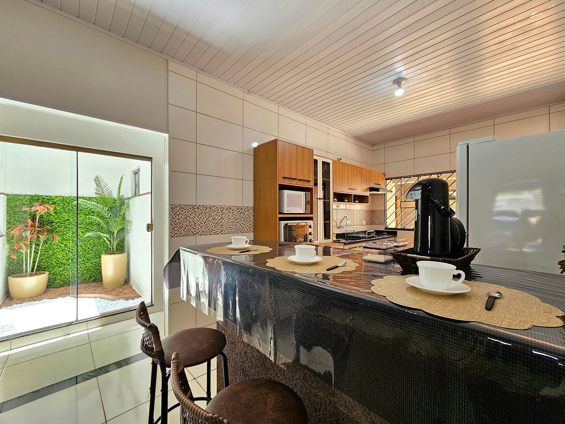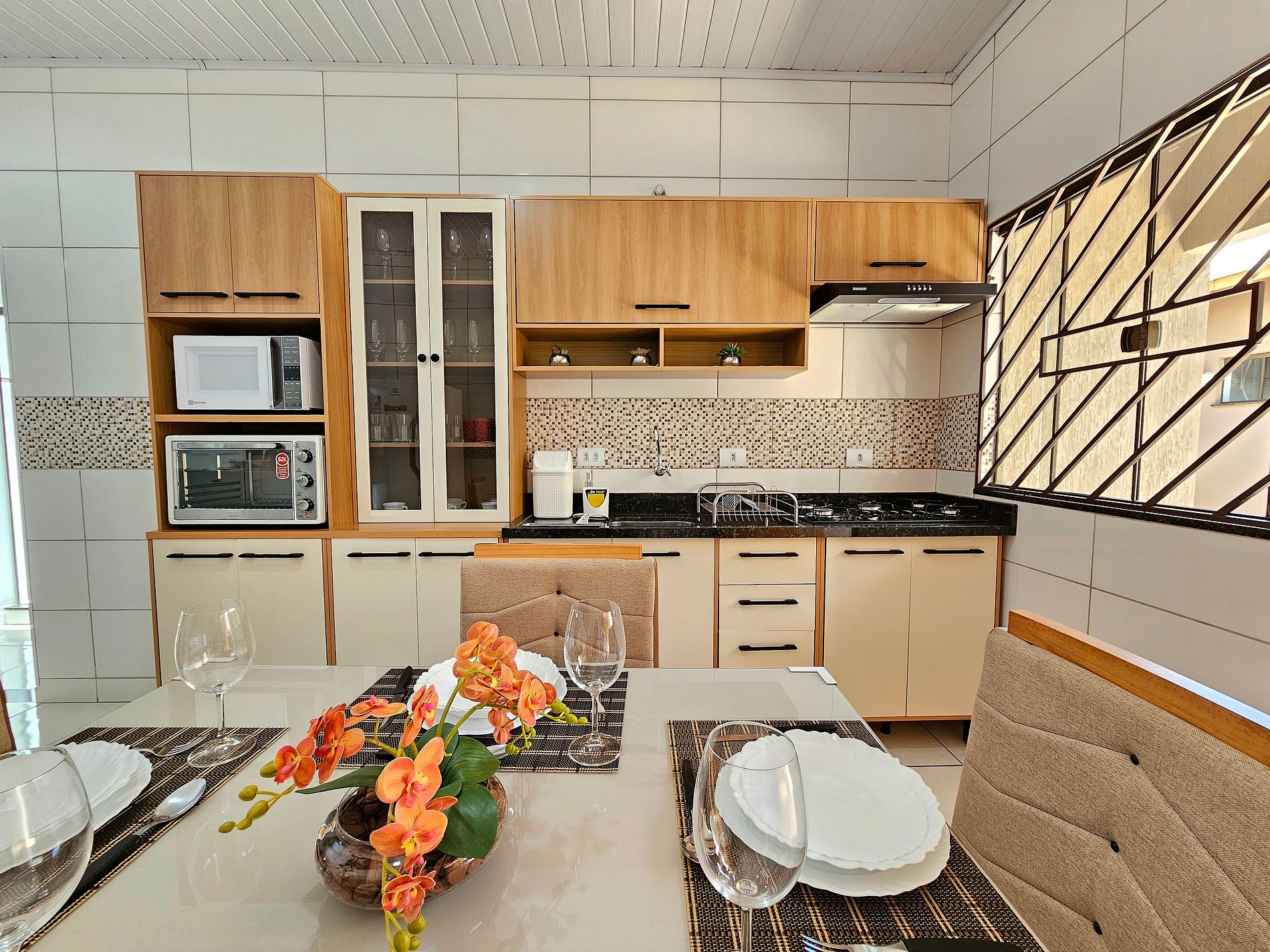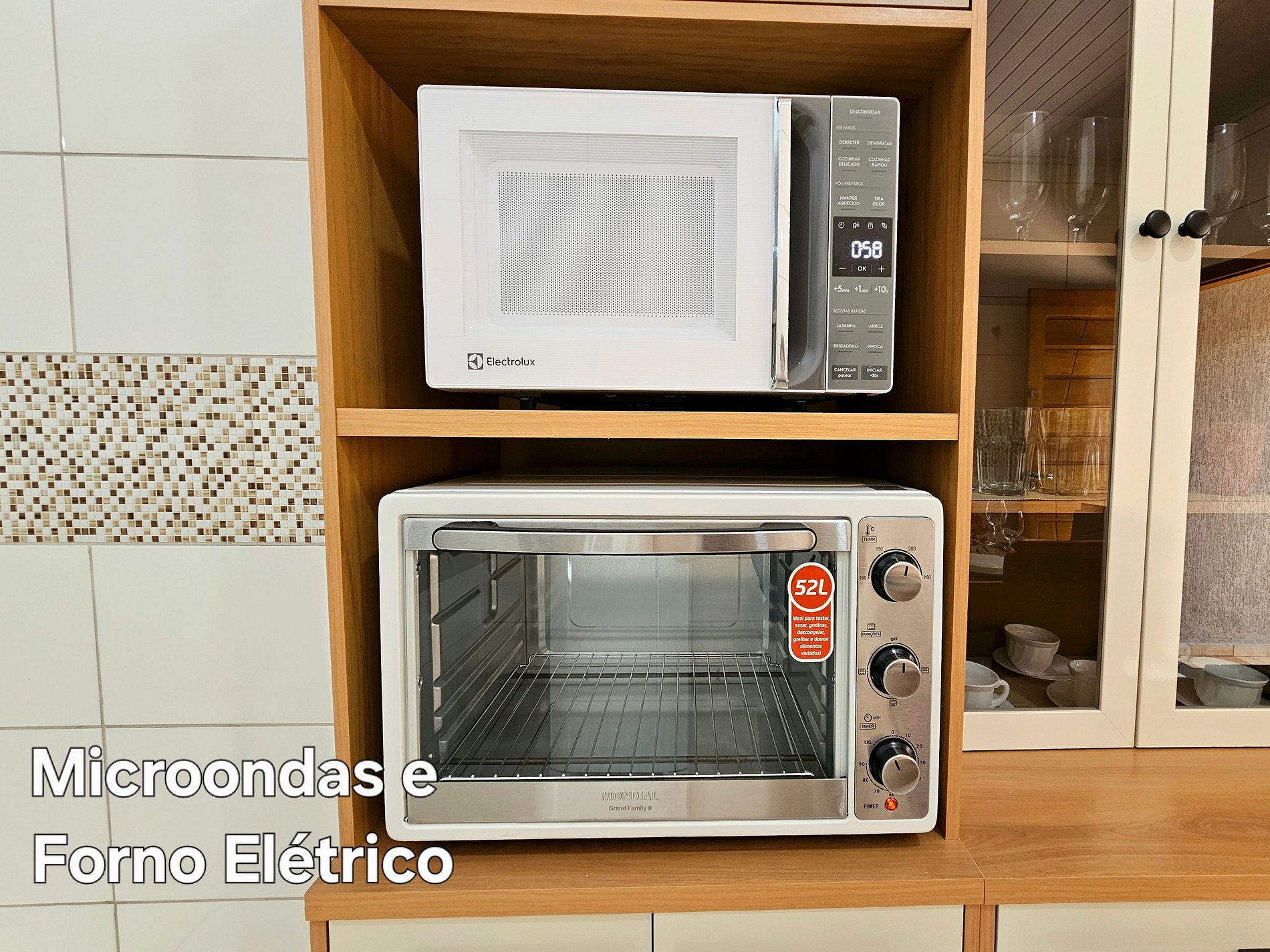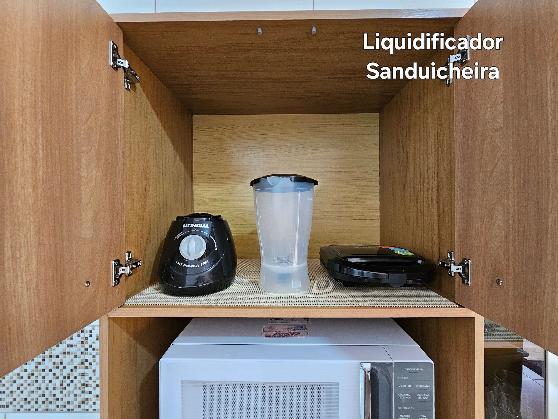 Cozinha completa com utensílios e louças para as refeições, microondas, forno, liquidificador e sanduicheira.