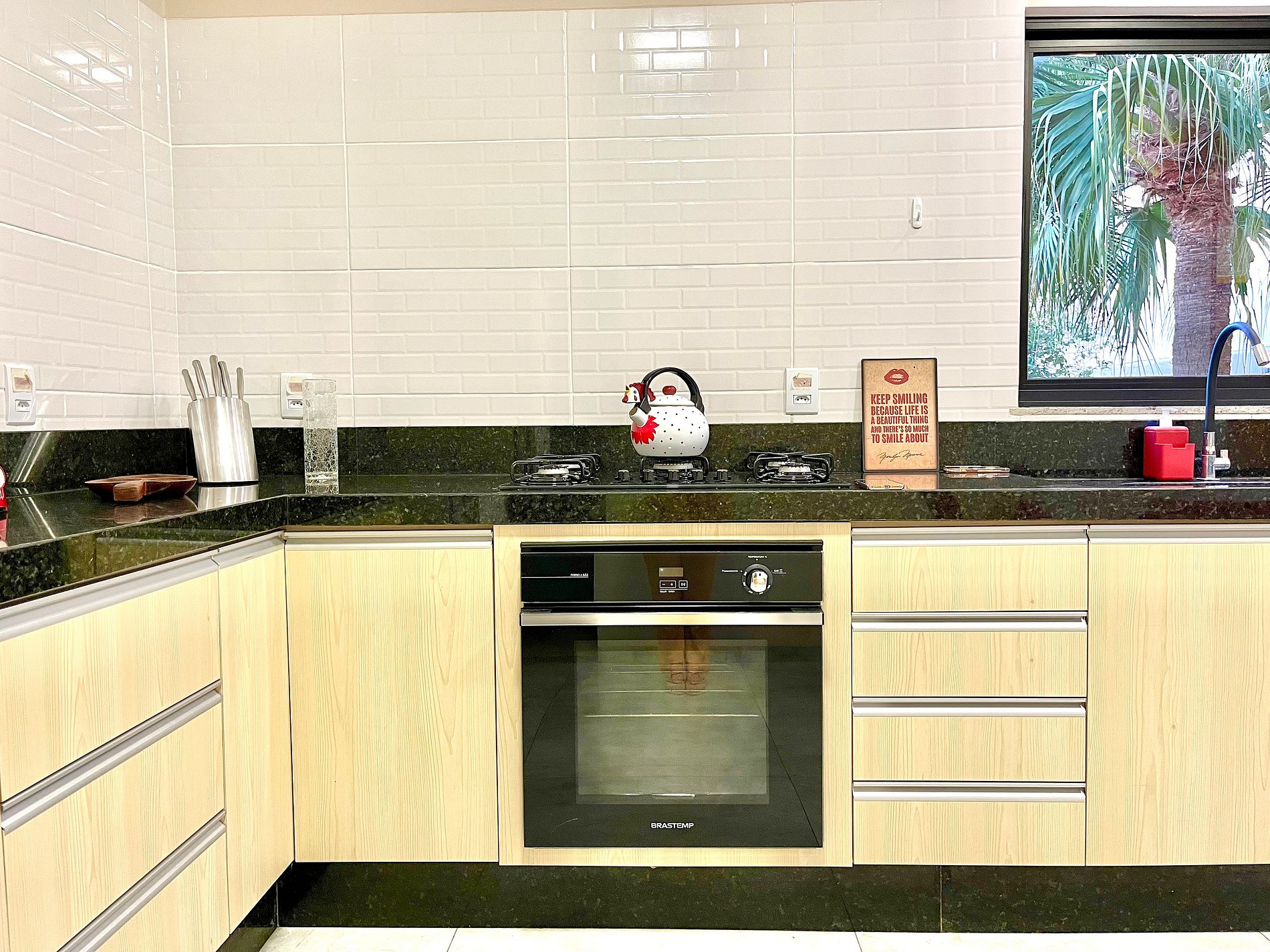 > Cozinha com geladeira, fogão, e todos os utensílios para cozinhar, e as louças para as refeições.
