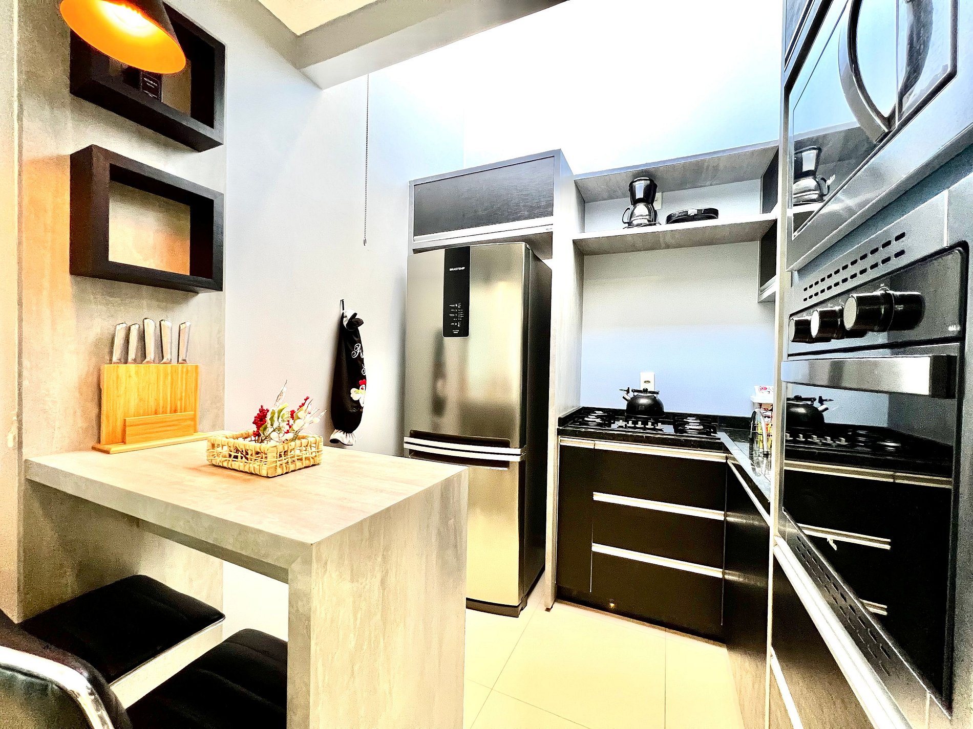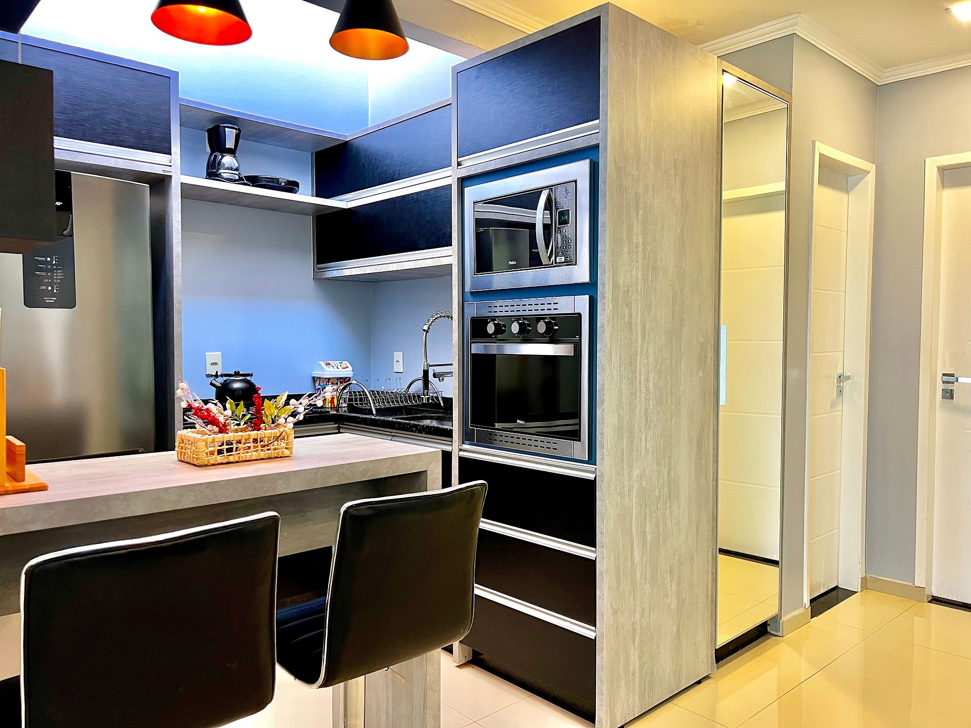 > Cozinha com geladeira, fogão, forno, microondas, e todos os utensílios para cozinhar, e as louças para as refeições. Sanduicheira e cafeteira eletrica.