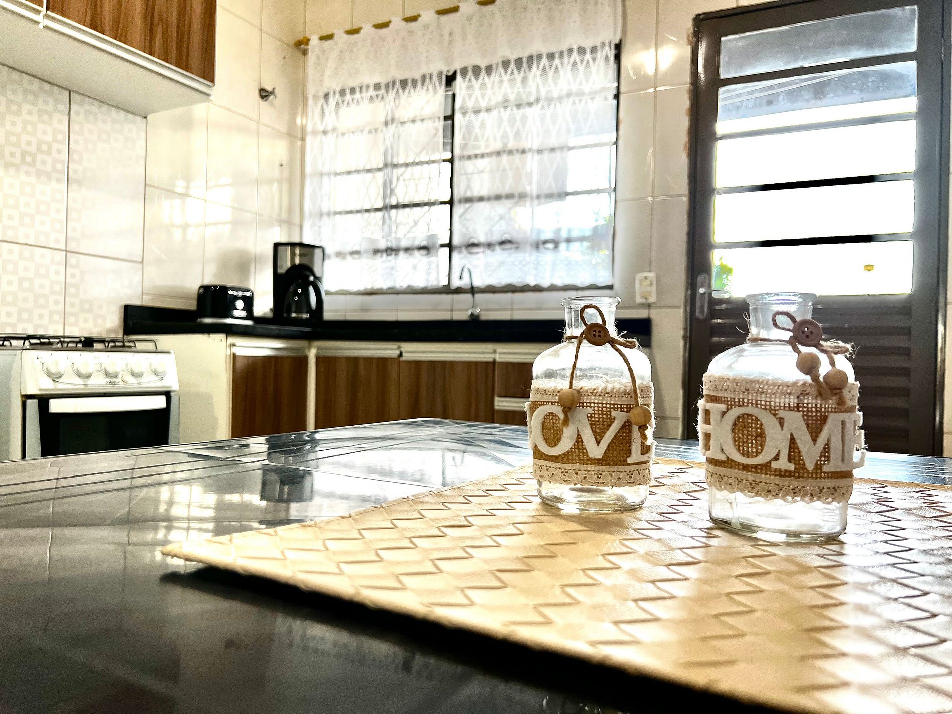 Cozinha completa com utensílios e louças para as refeições, microondas, liquidificador, torradeira e cafeteira elétrica.