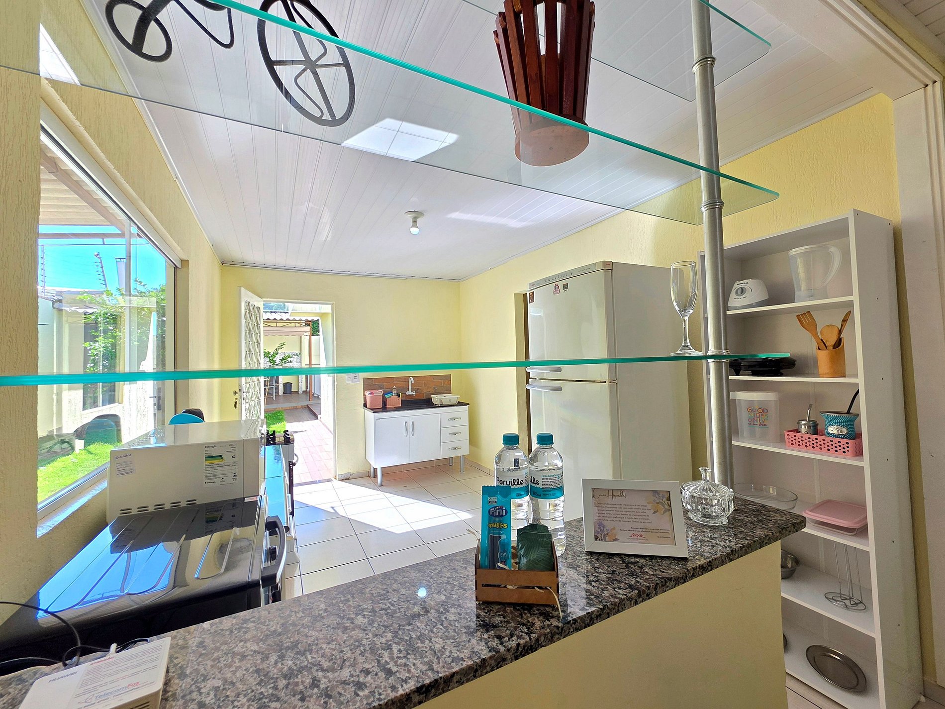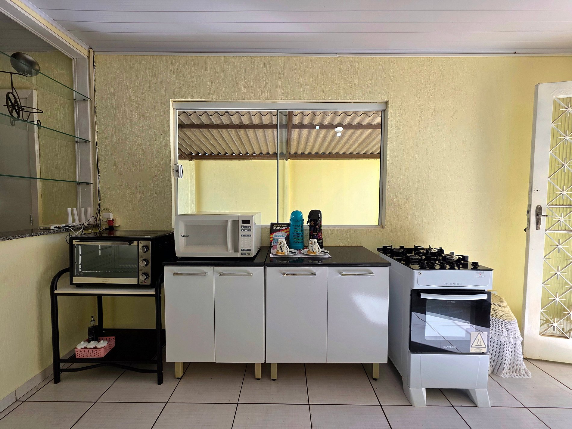 Cozinha completa com utensílios e louças para as refeições, fogão, forno, microondas, sanduicheira, liquidificador.