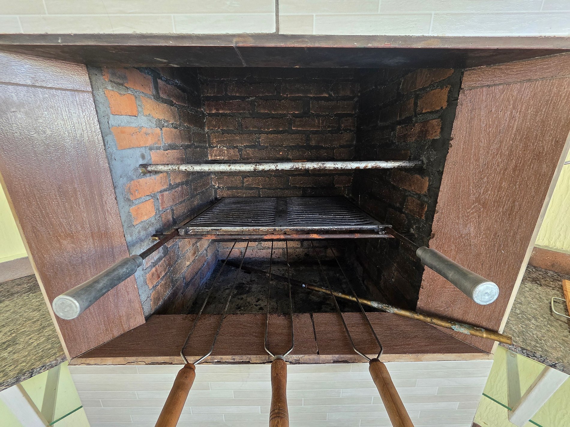 Churrasqueira com espetos e grelhas.