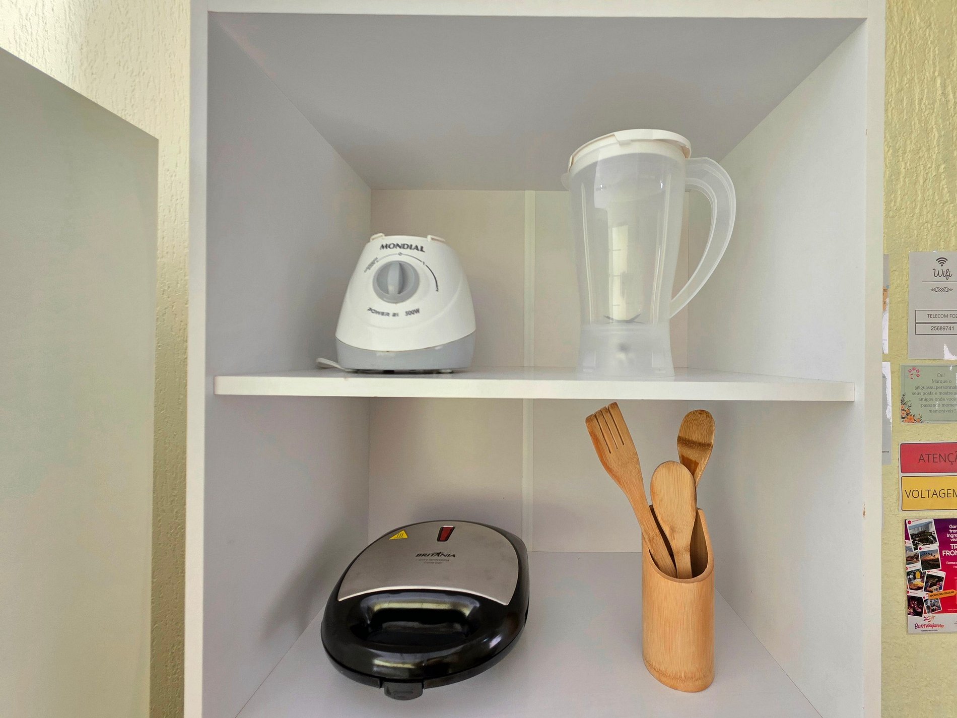 Cozinha completa com utensílios e louças para as refeições, fogão, forno, microondas, sanduicheira, liquidificador.