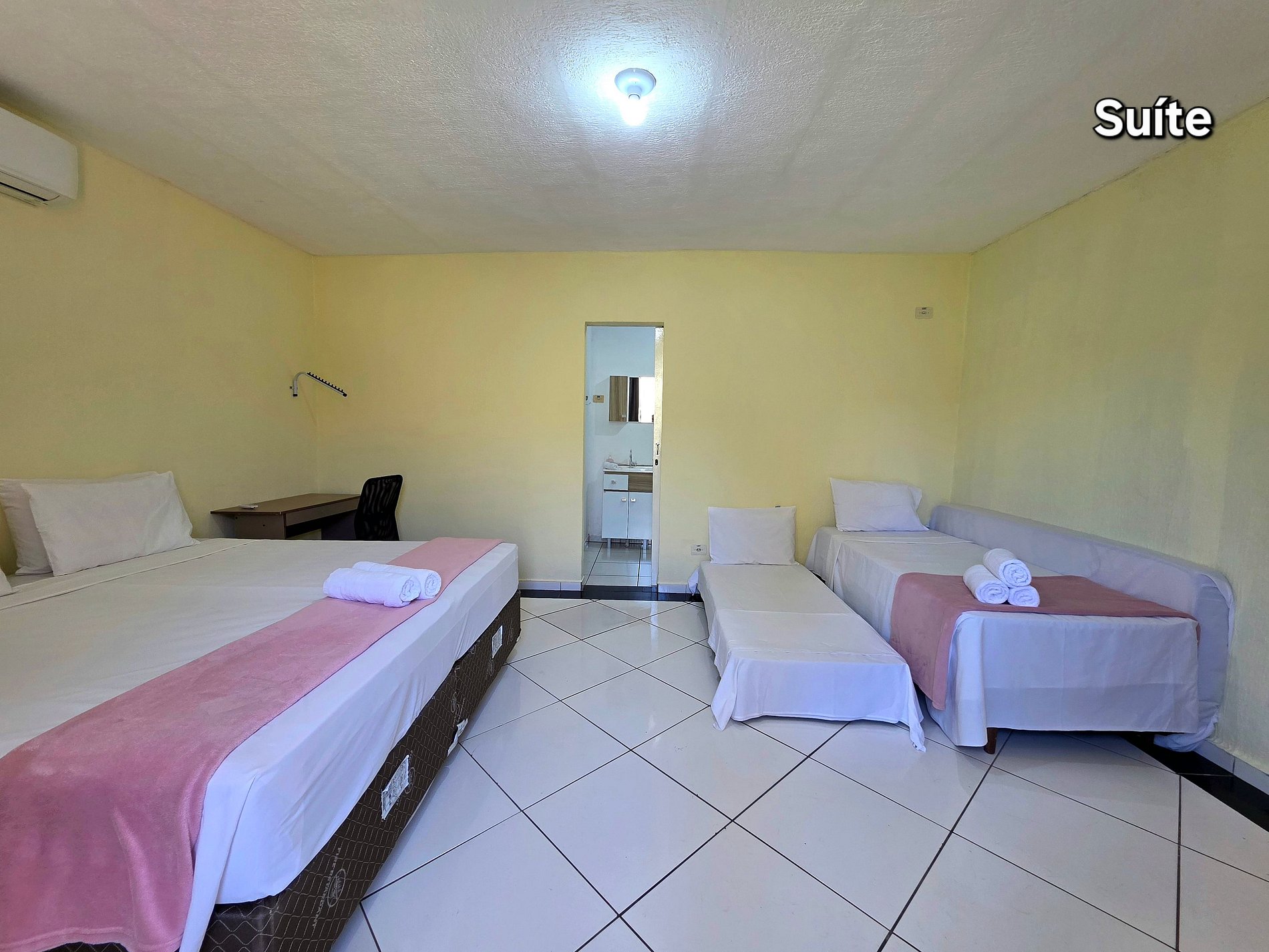 Quarto 01: Suíte com 01 cama de casal kingSize + 01 cama solteiro + 01 cama auxiliar a de solteiro + 01 colchão extra