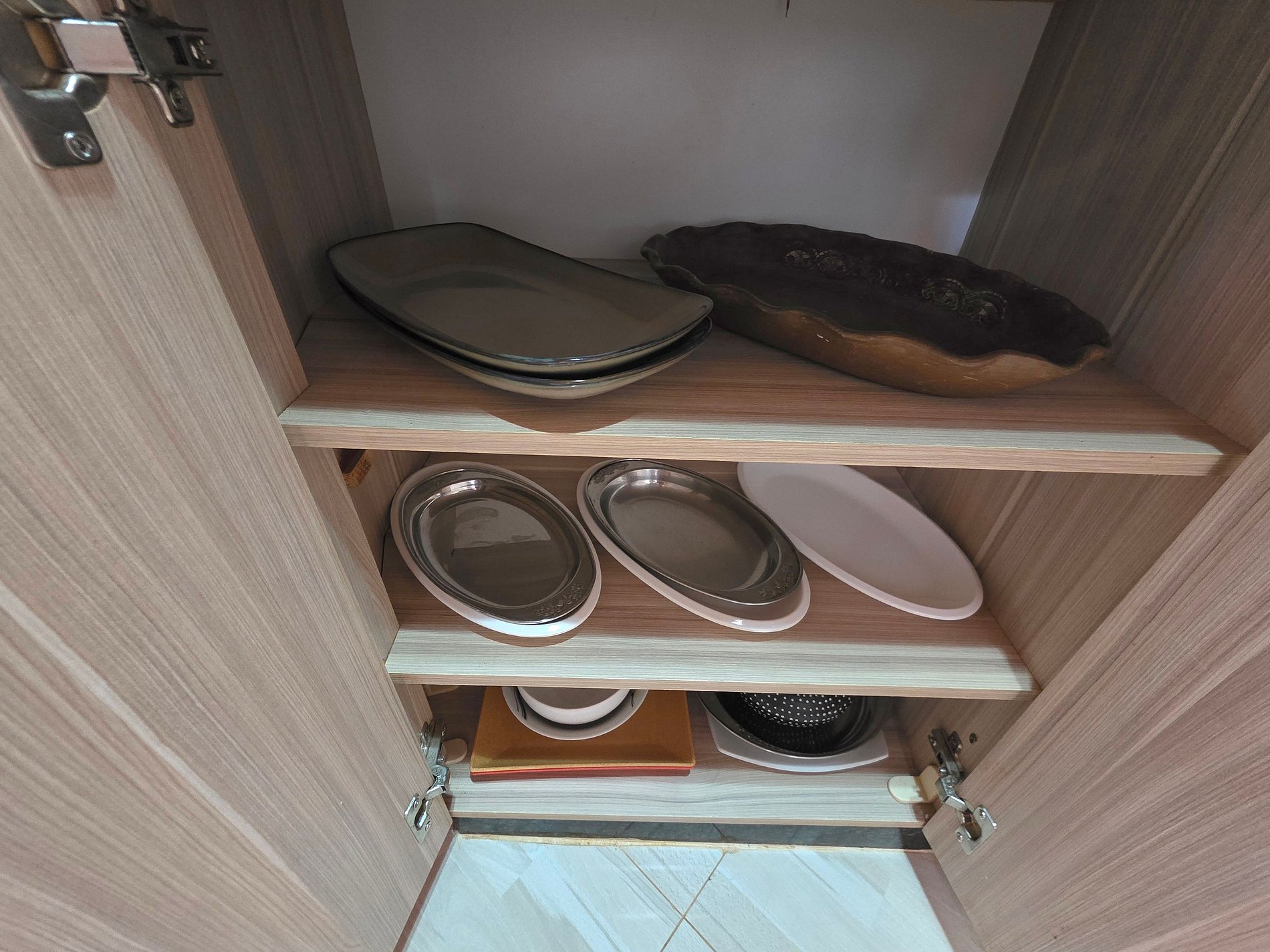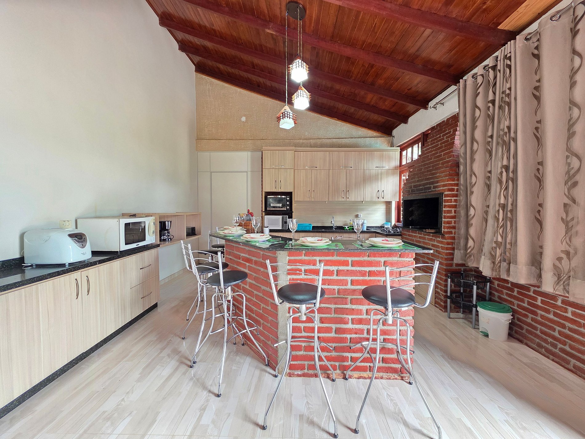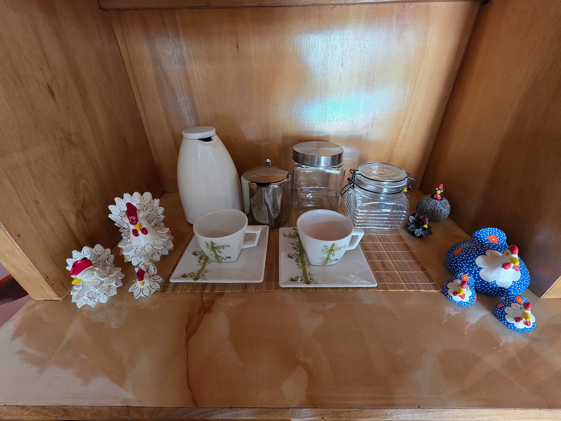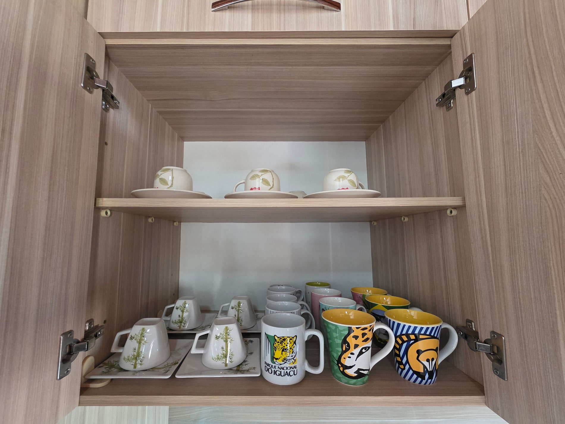 Cozinha completa com utensílios e louças para as refeições, fogão, microondas, sanduicheira, liquidificador, cafeteira.
