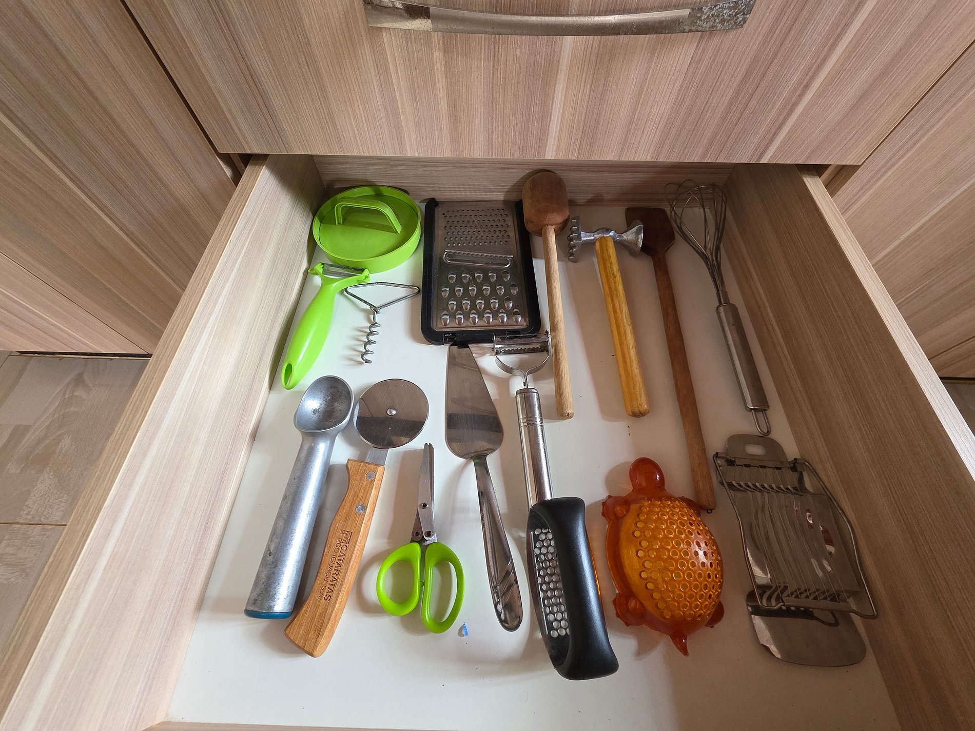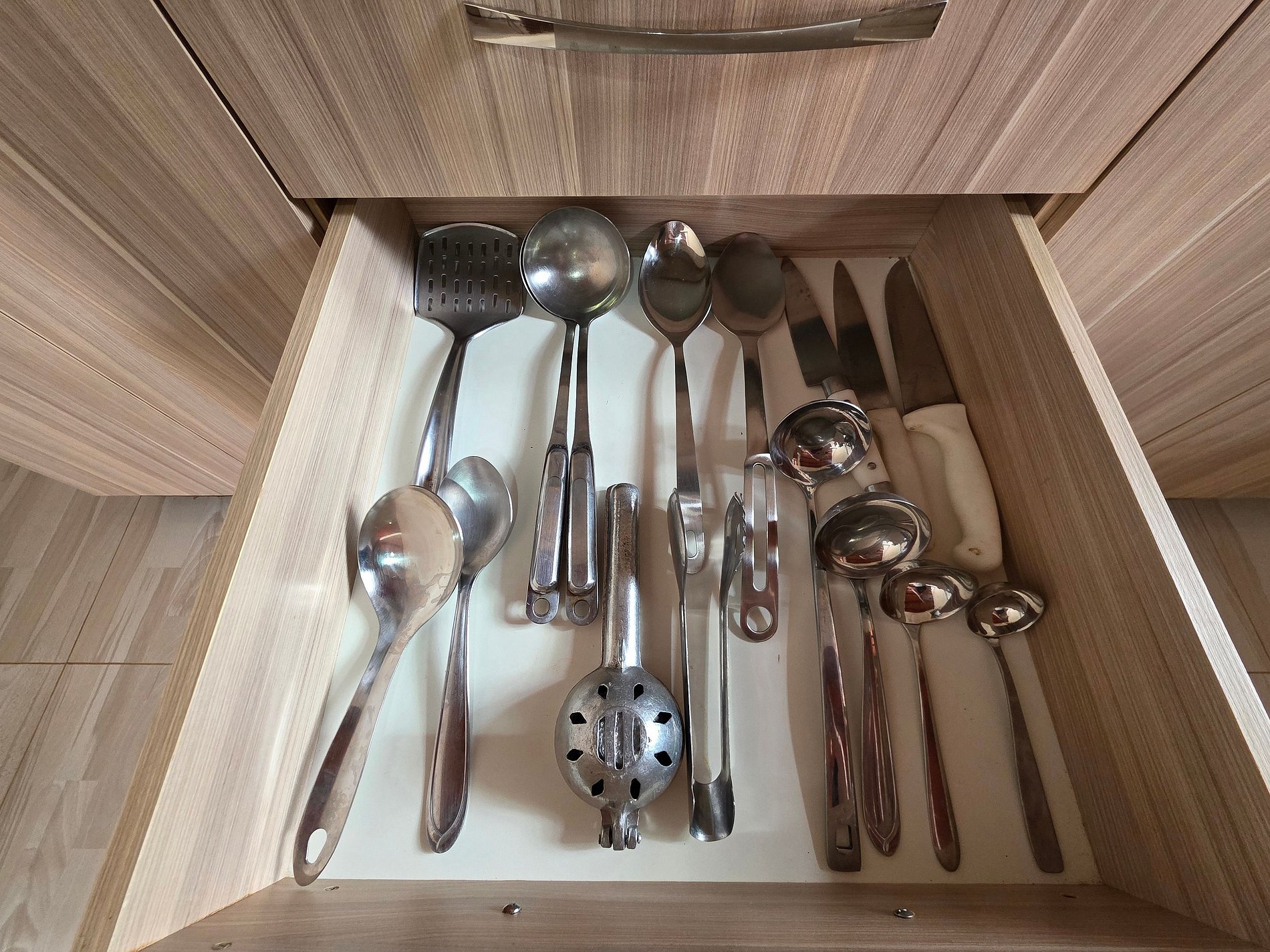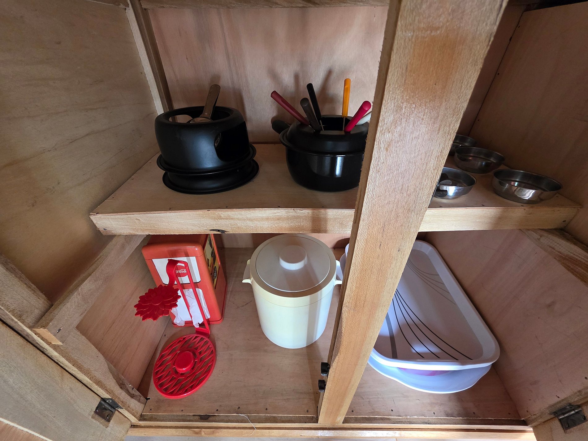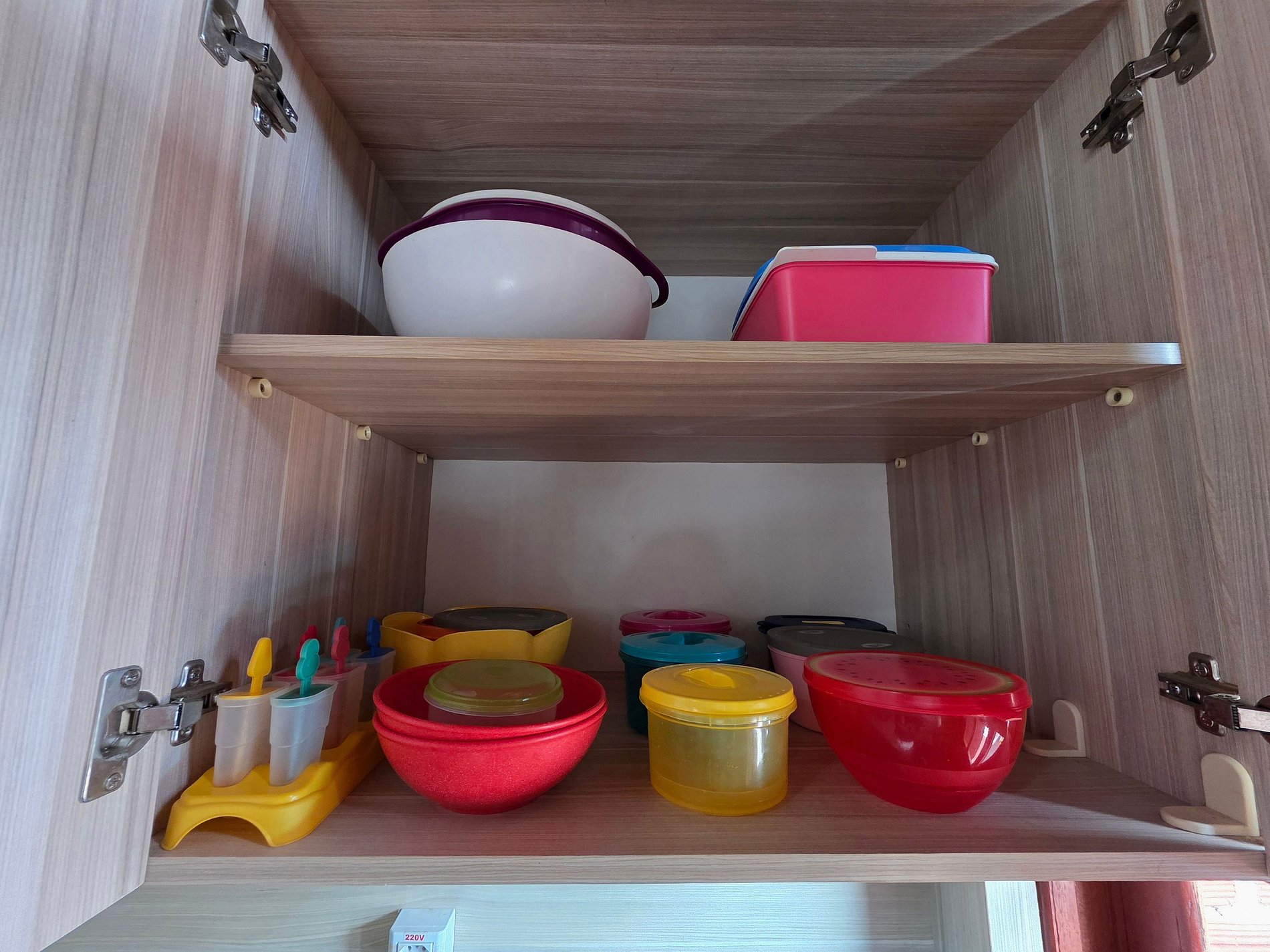 Cozinha completa com utensílios e louças para as refeições, fogão, microondas, sanduicheira, liquidificador, cafeteira.