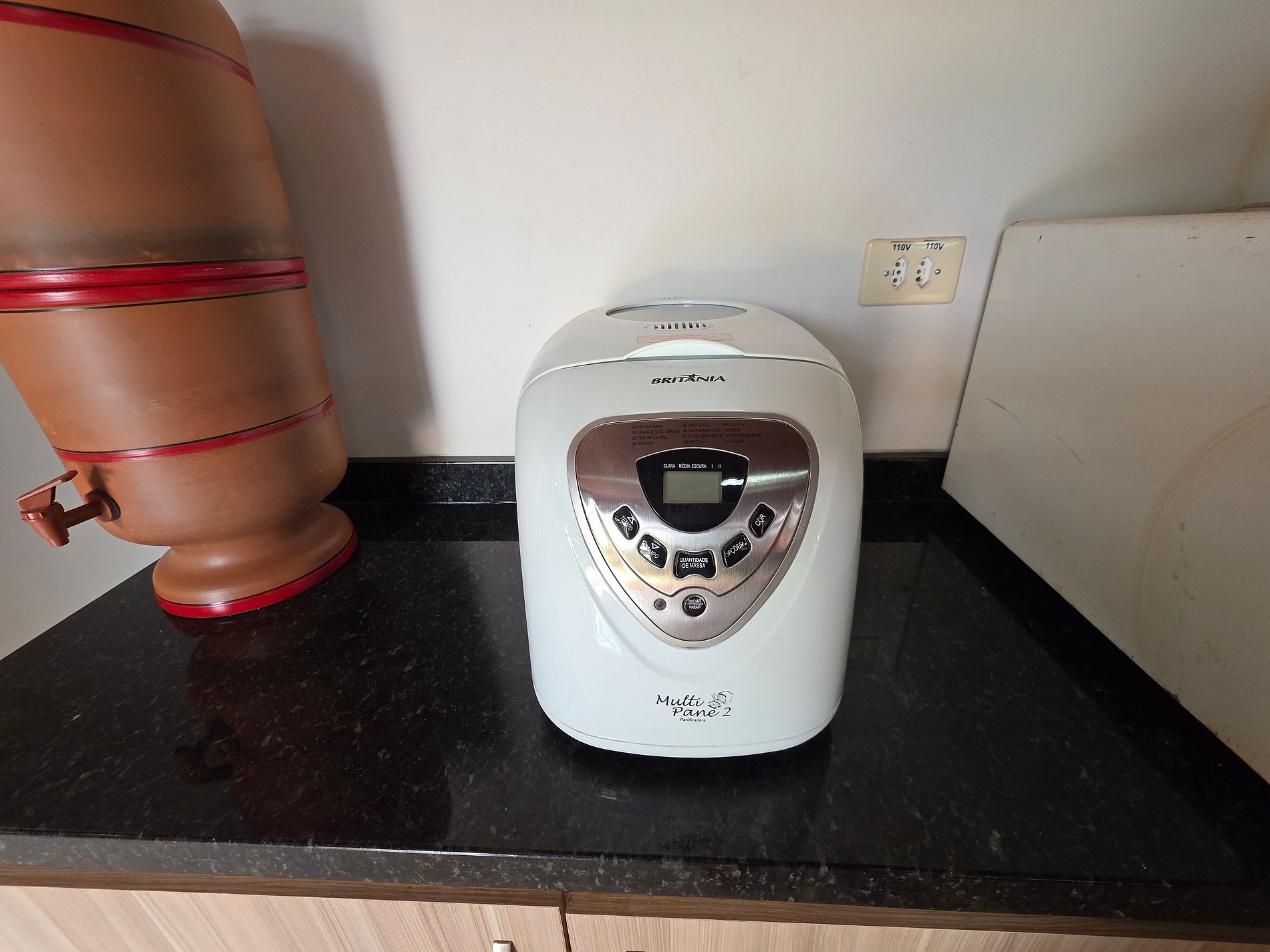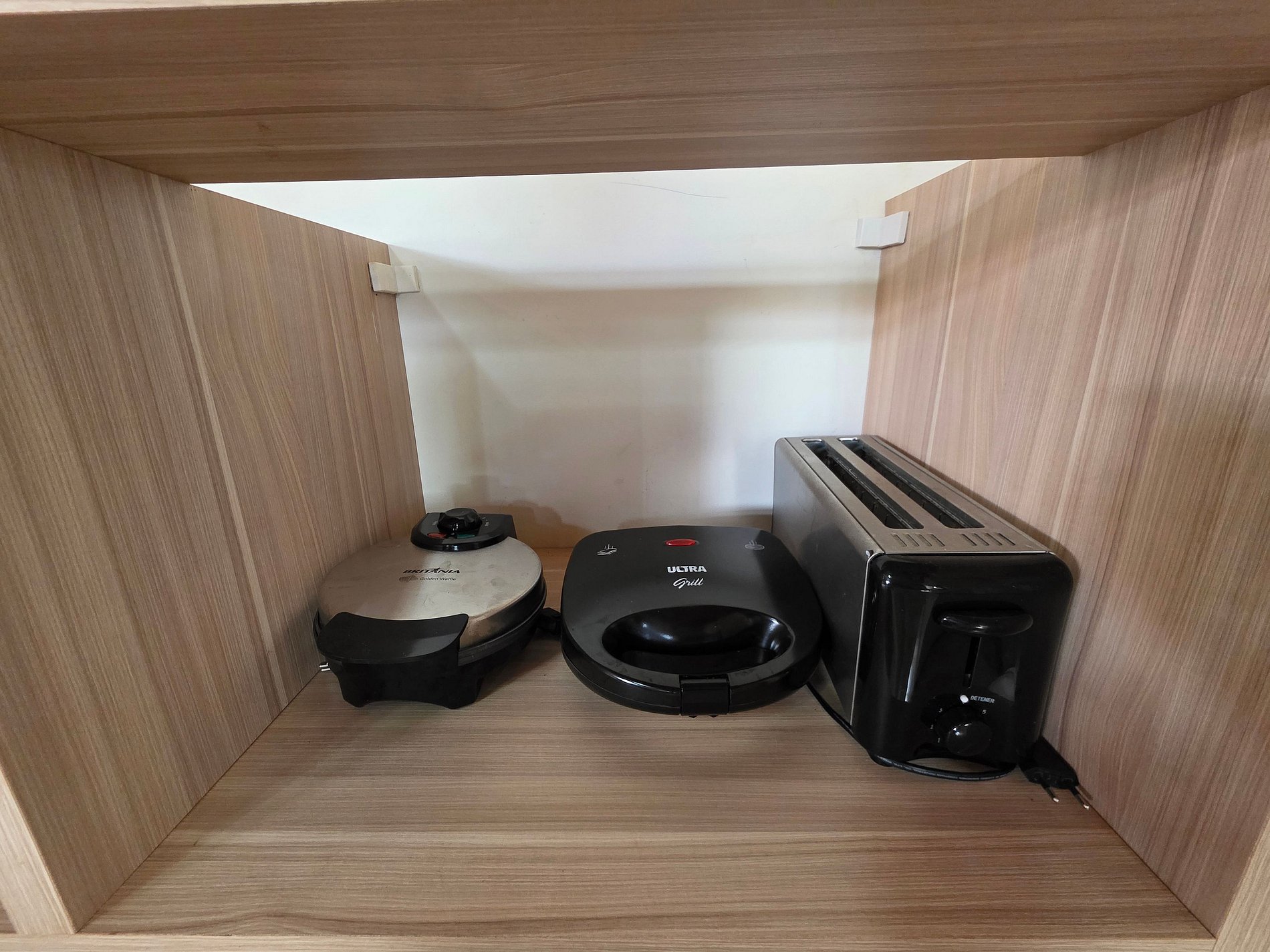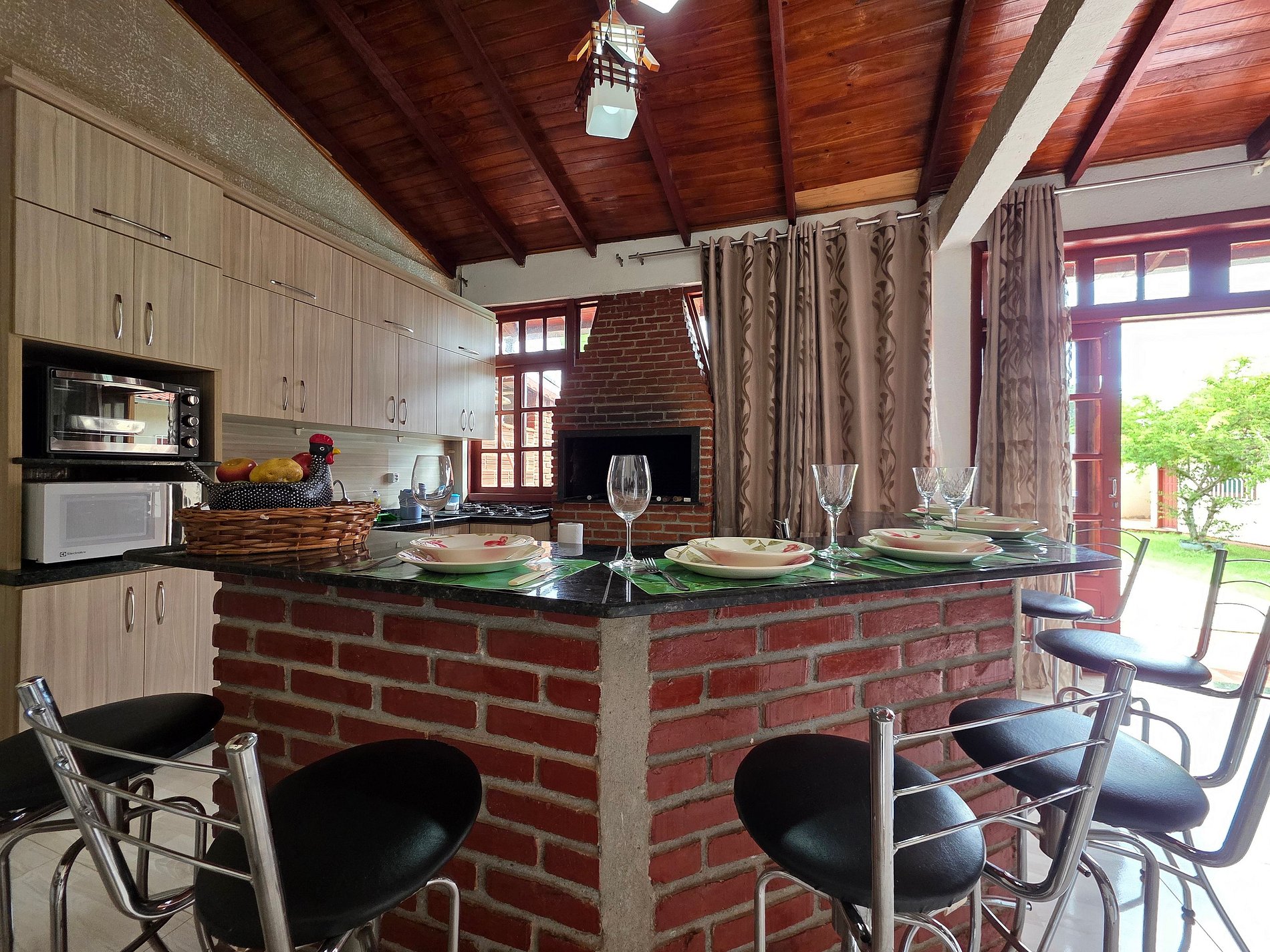 Cozinha completa com utensílios e louças para as refeições, fogão, microondas, sanduicheira, liquidificador, cafeteira.