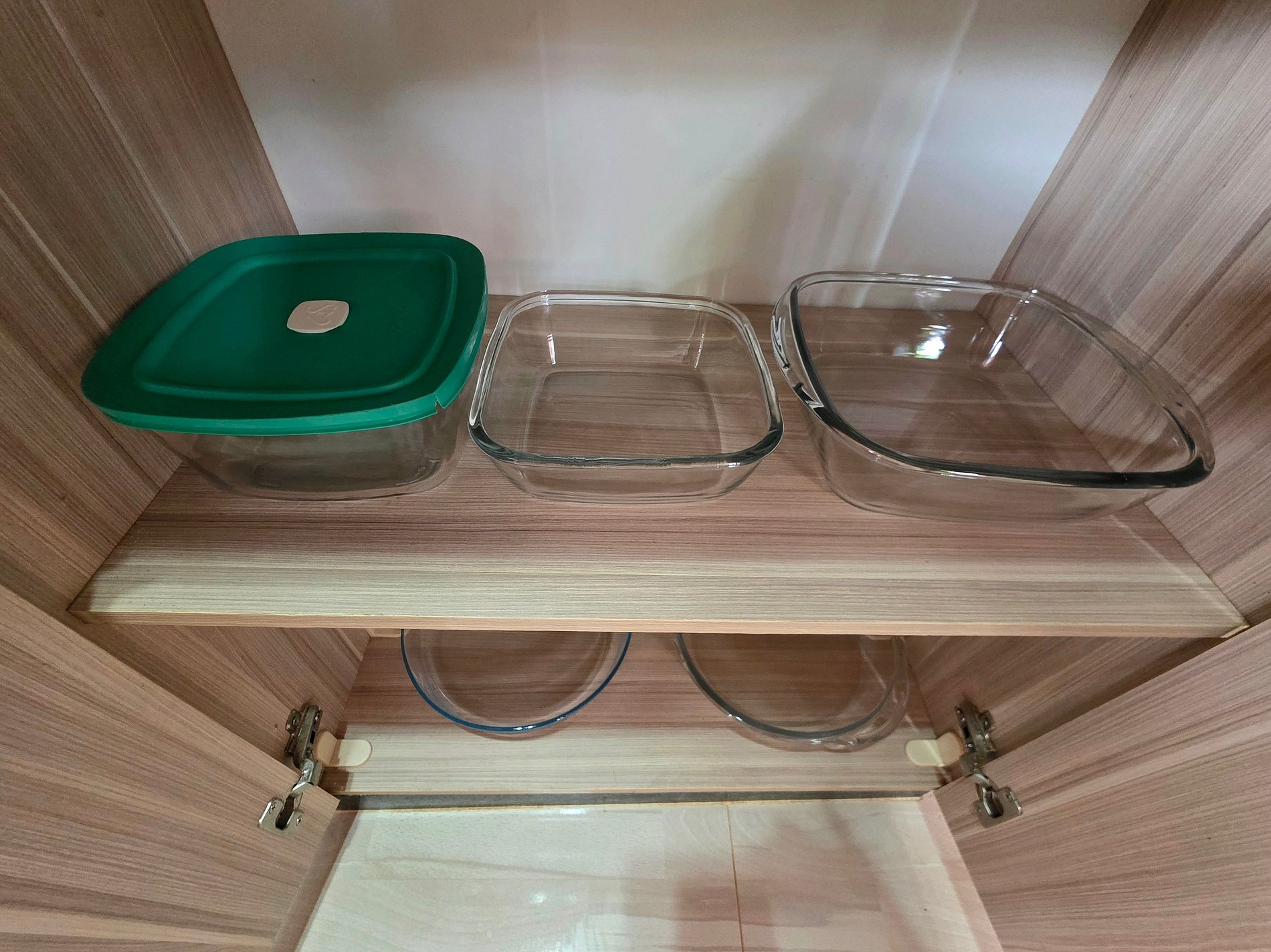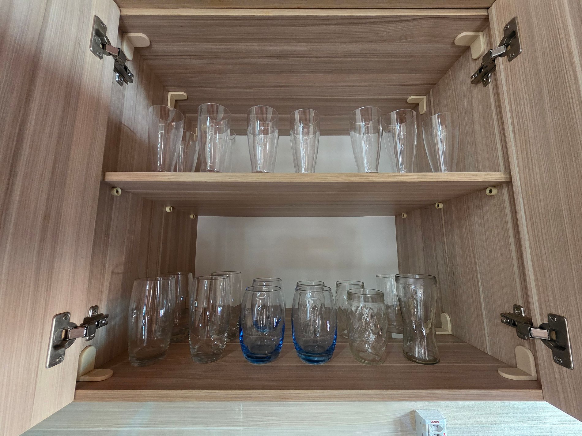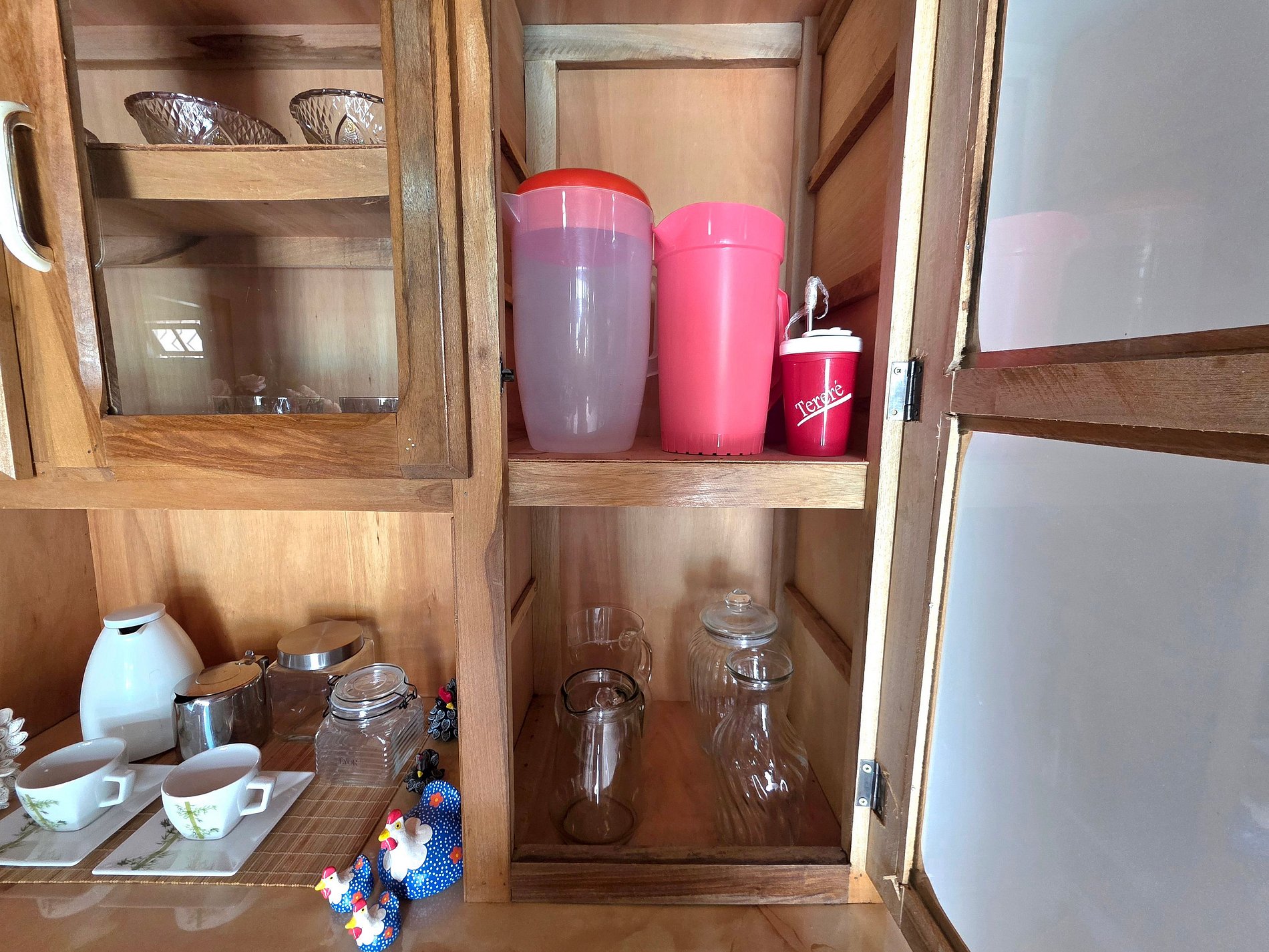 Cozinha completa com utensílios e louças para as refeições, fogão, microondas, sanduicheira, liquidificador, cafeteira.
