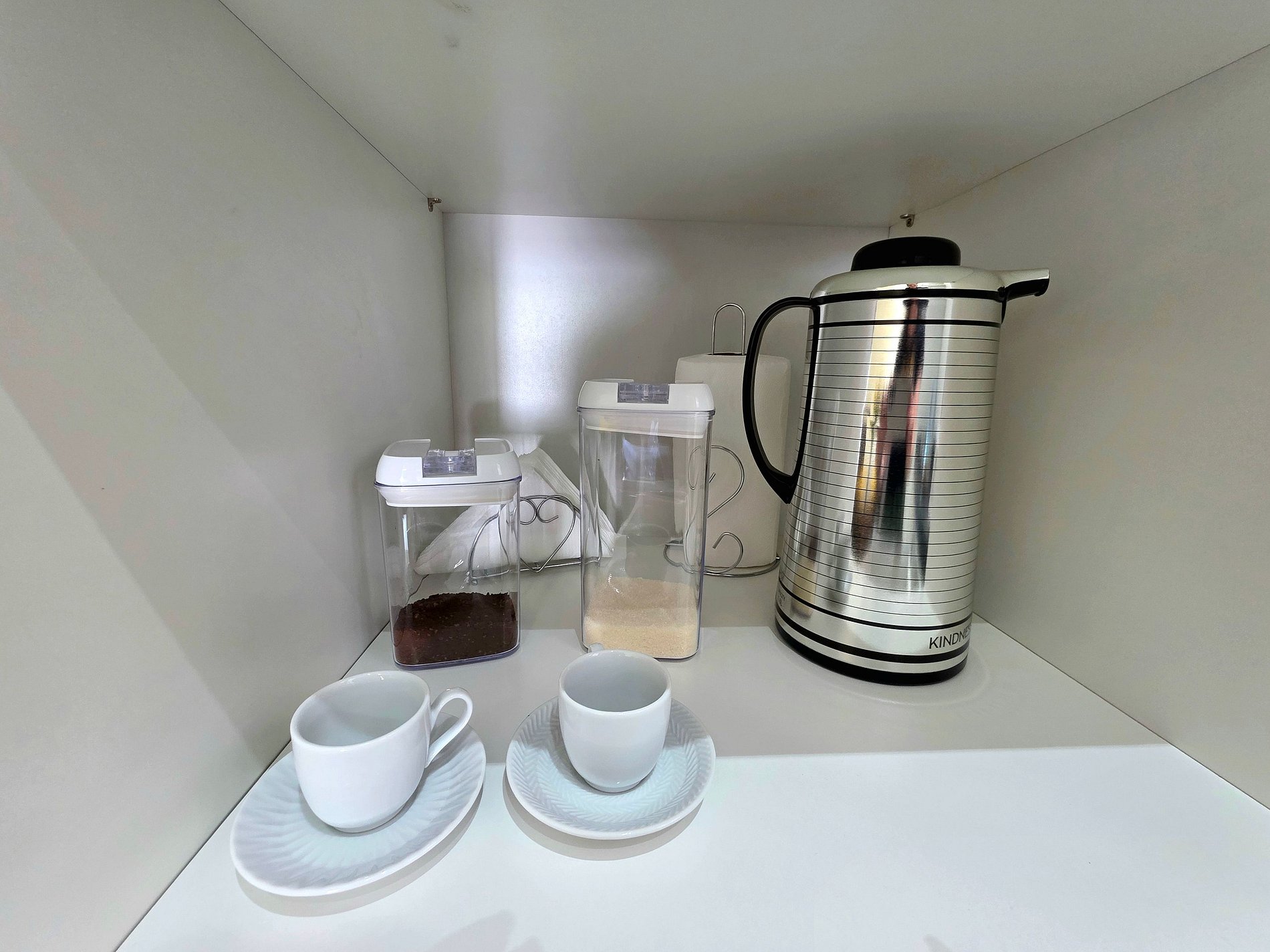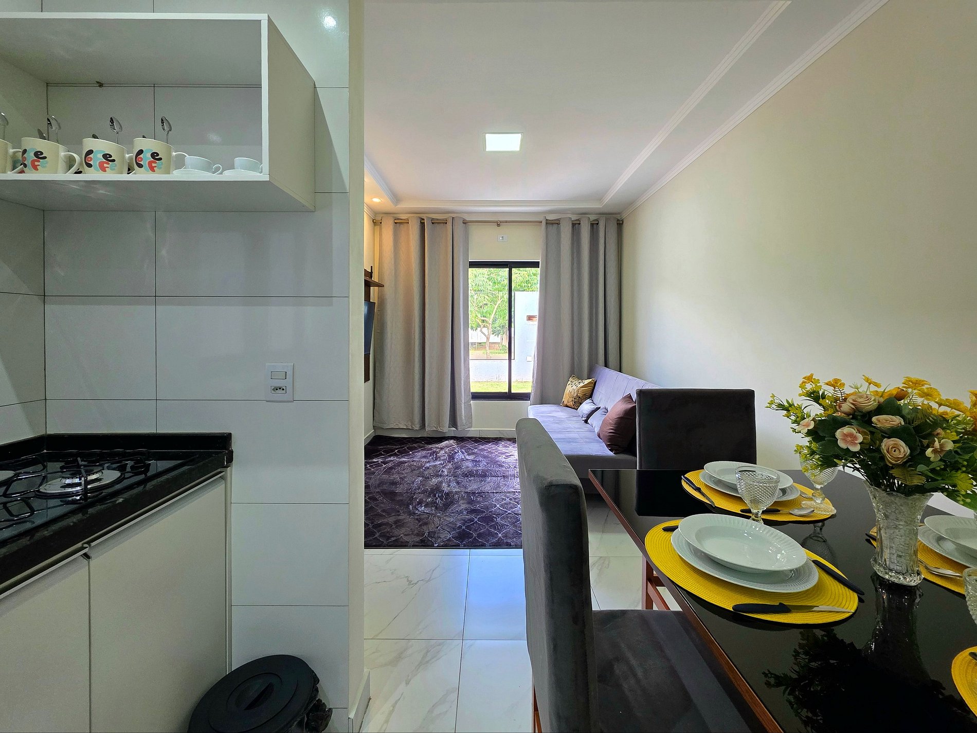 Cozinha completa com utensílios e louças para as refeições, fogão, microondas, cafeteira, sanduicheira, liquidificador.