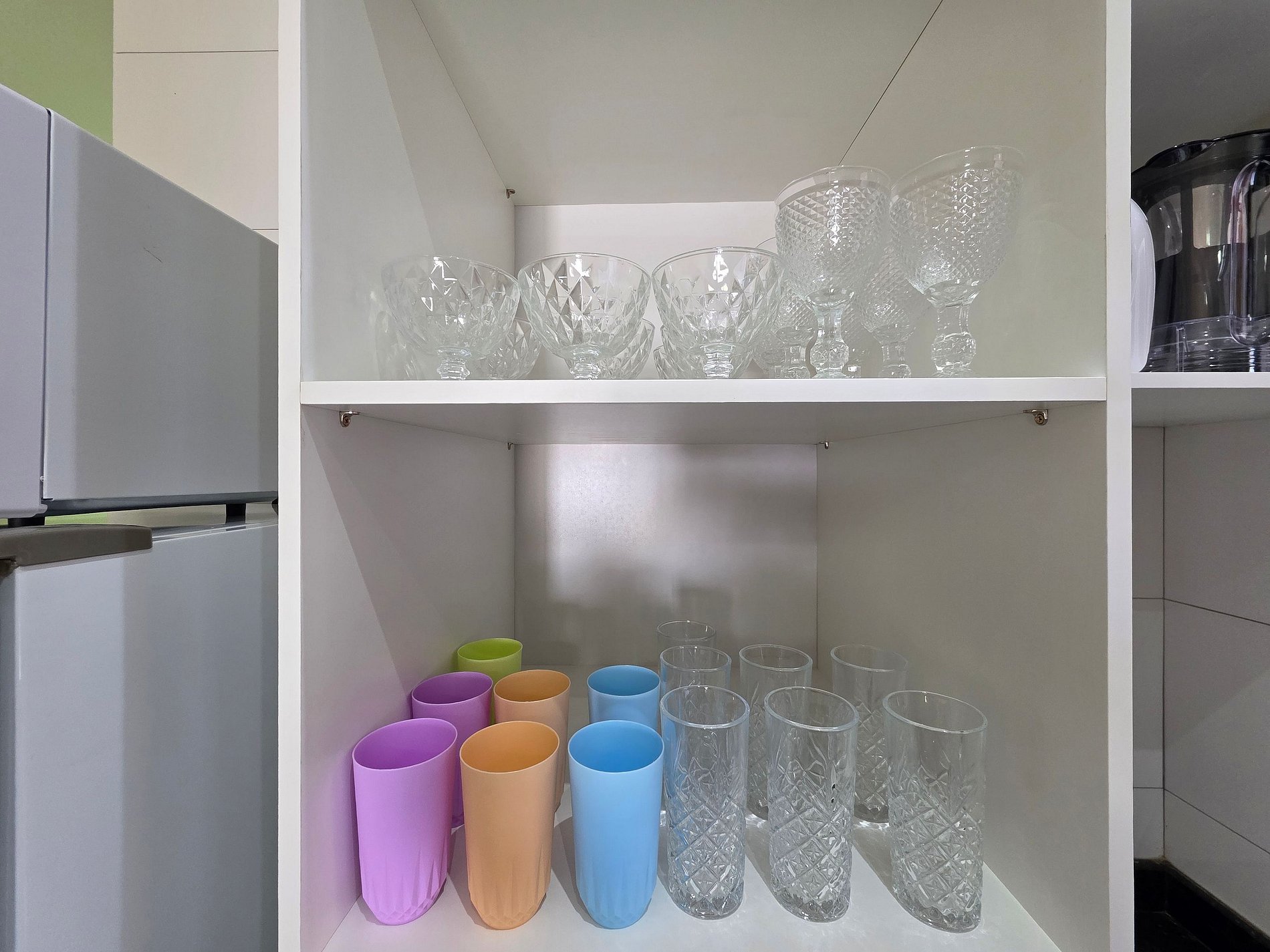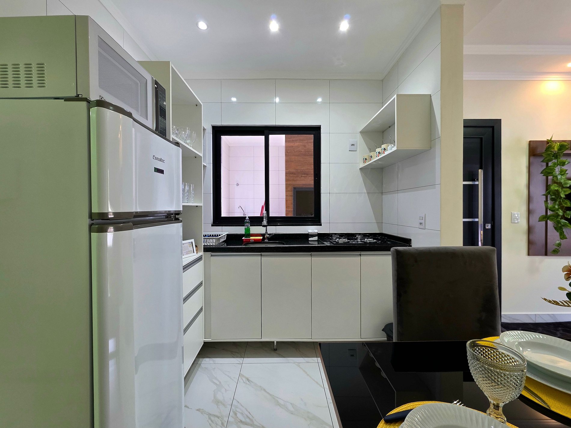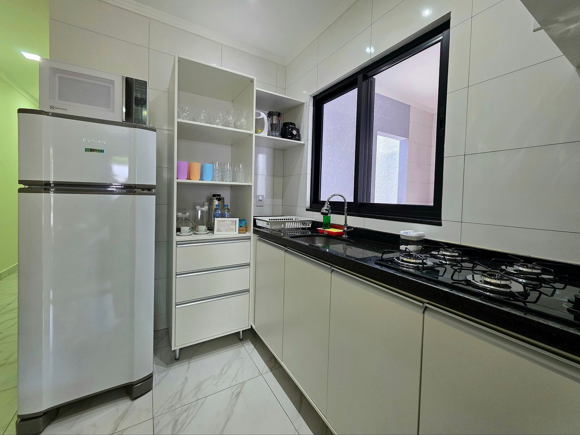 Cozinha completa com utensílios e louças para as refeições, fogão, microondas, cafeteira, sanduicheira, liquidificador.