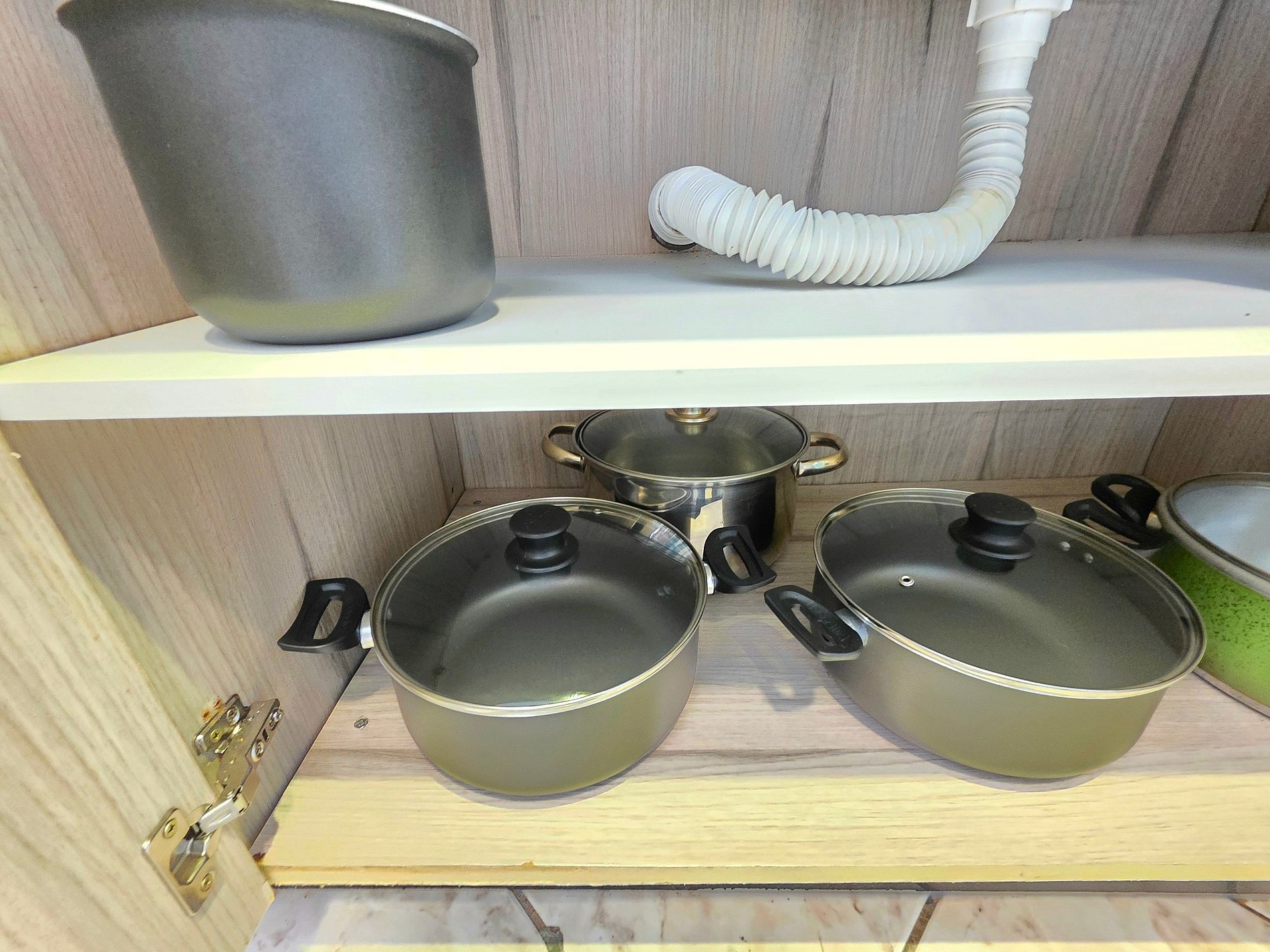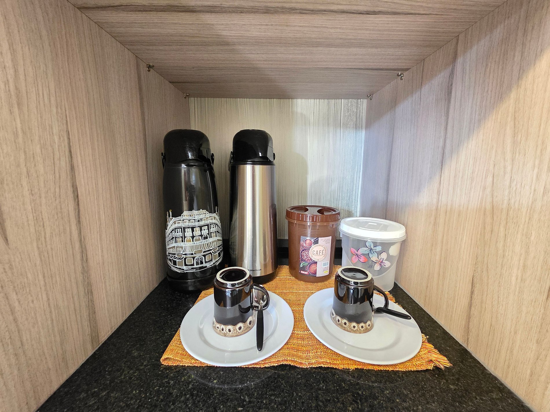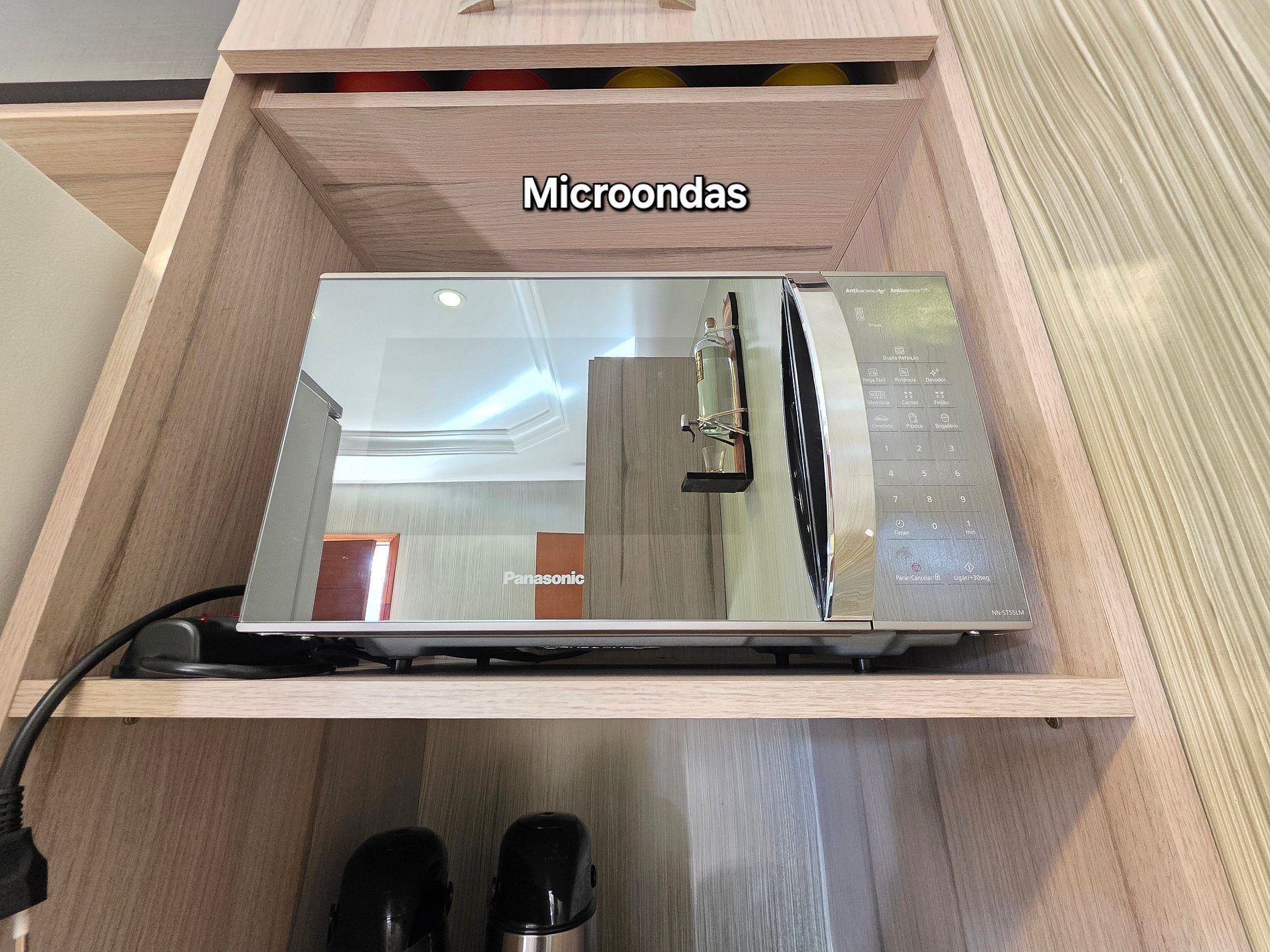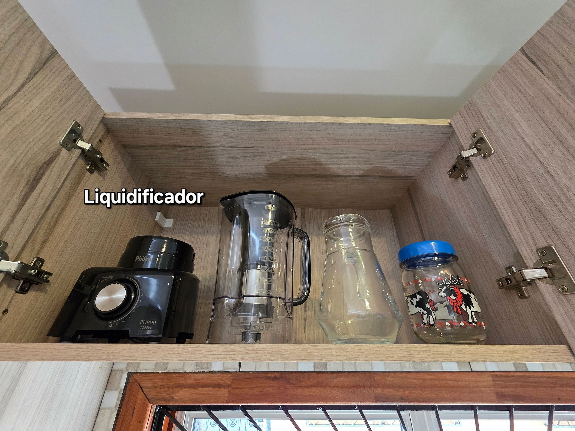 Cozinha completa com utensílios e louças para as refeições, fogão, microondas, sanduicheira, liquidificador.