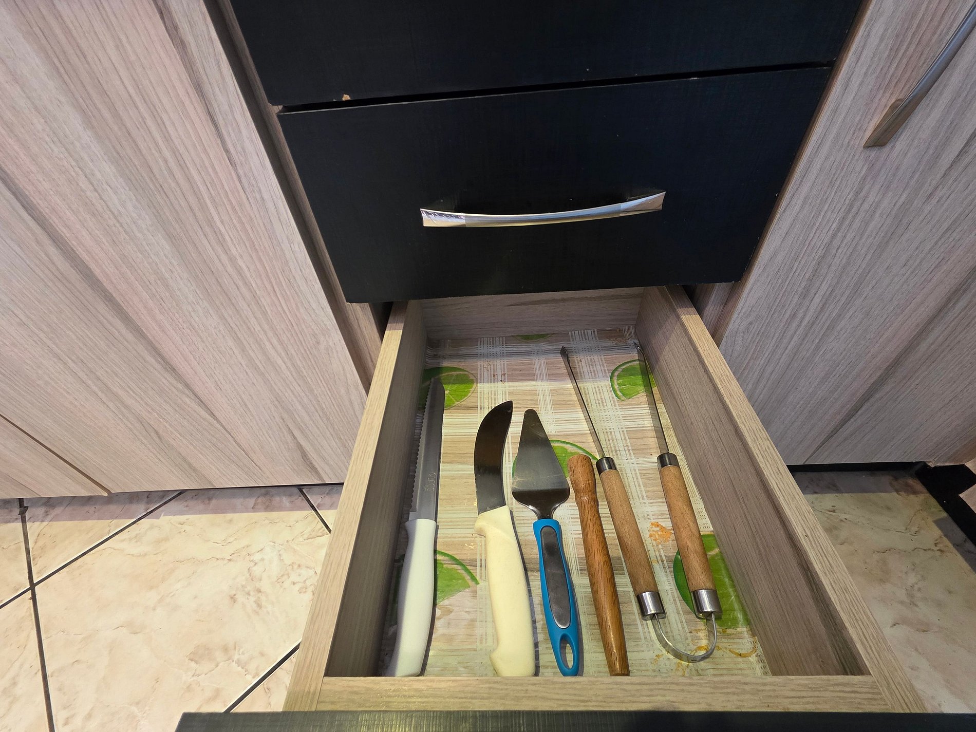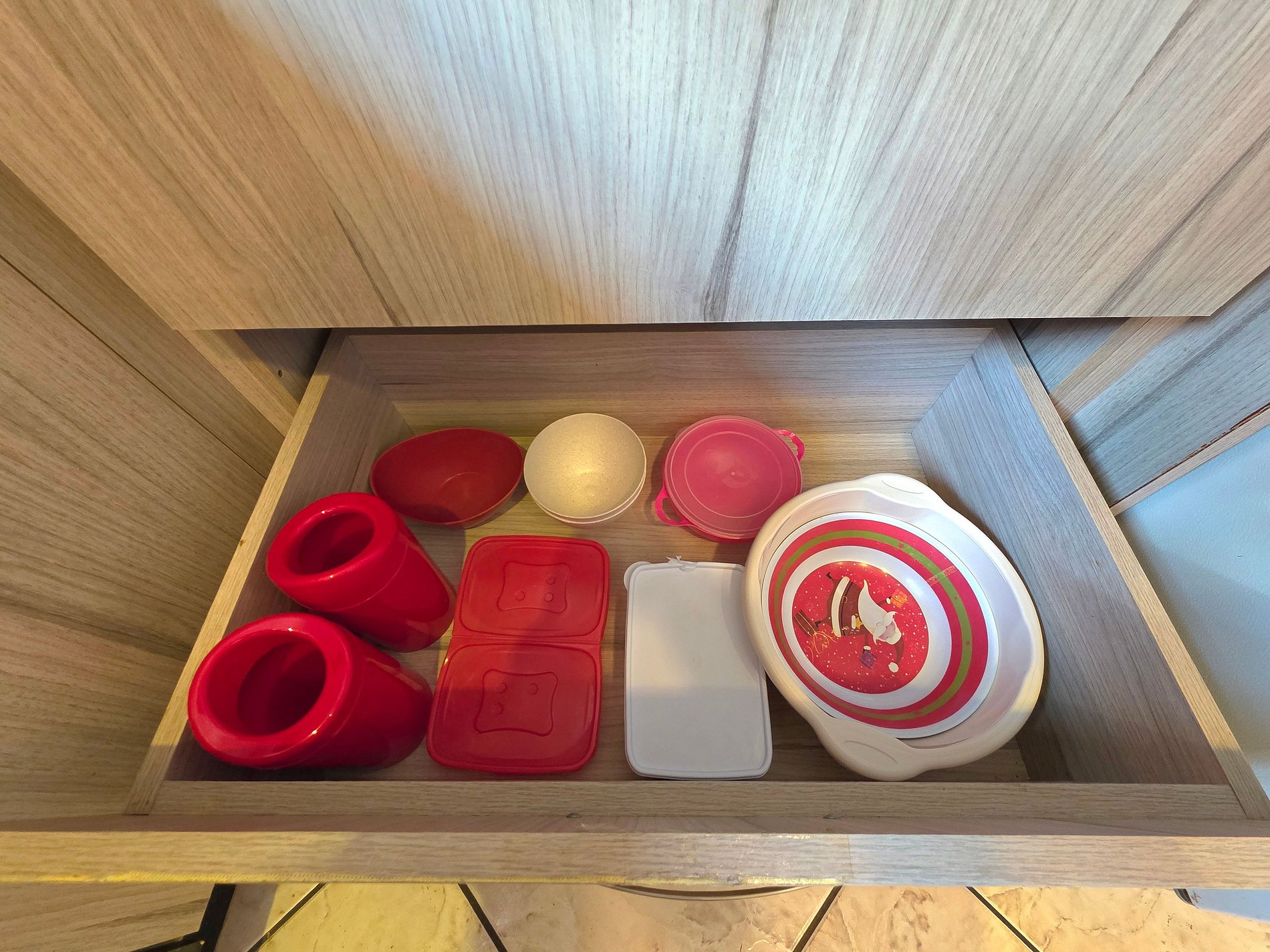 Cozinha completa com utensílios e louças para as refeições, fogão, microondas, sanduicheira, liquidificador.