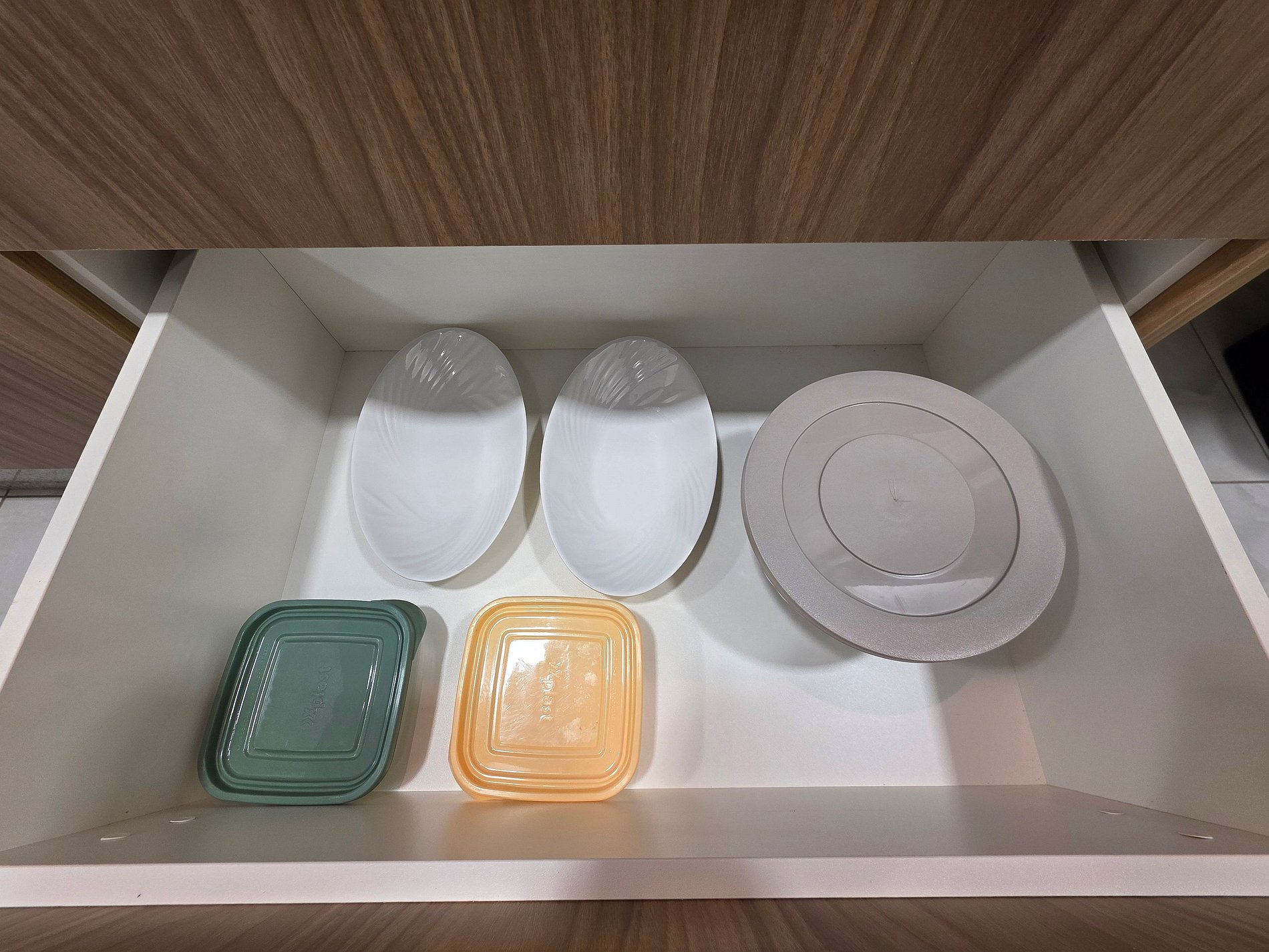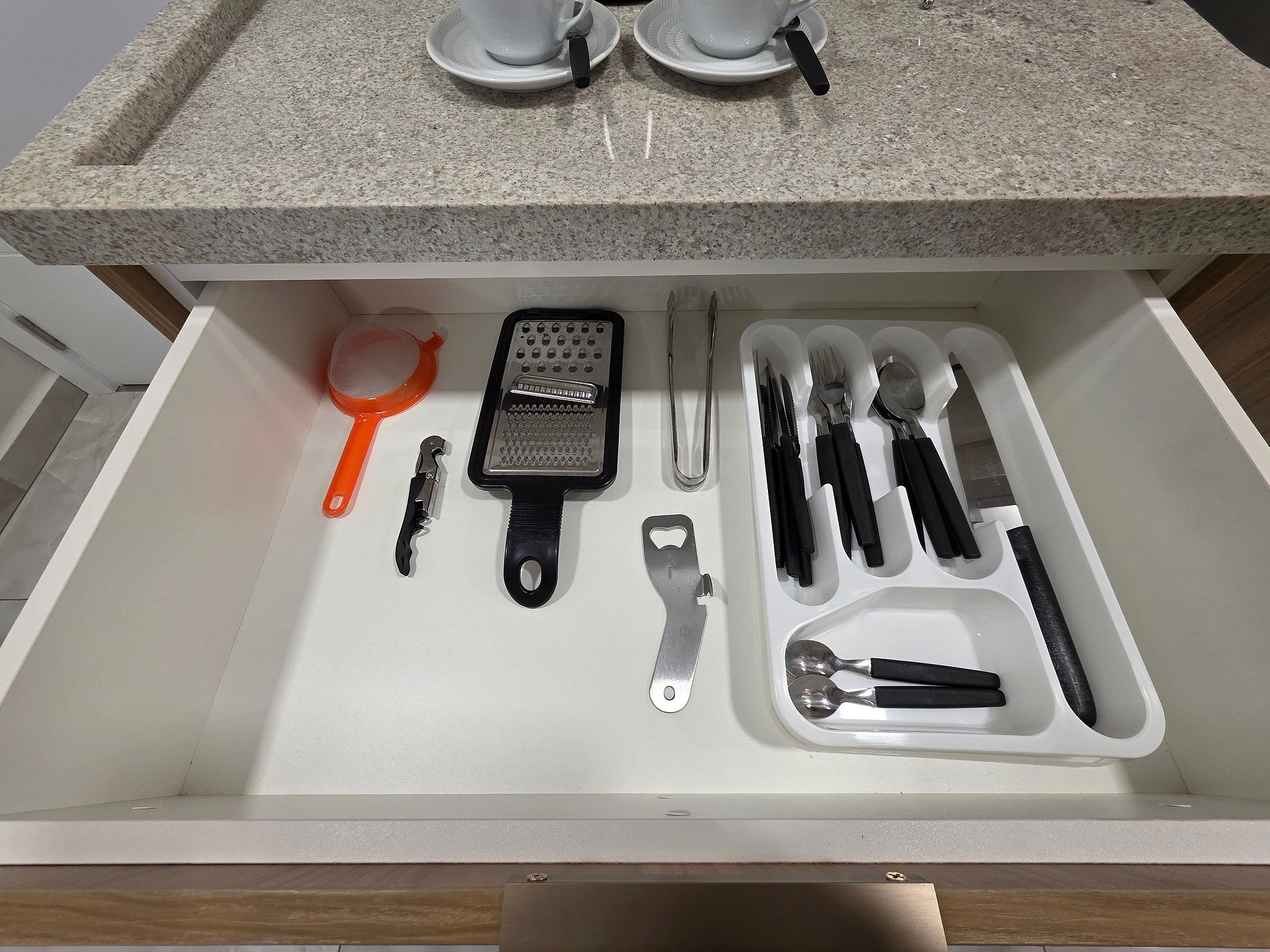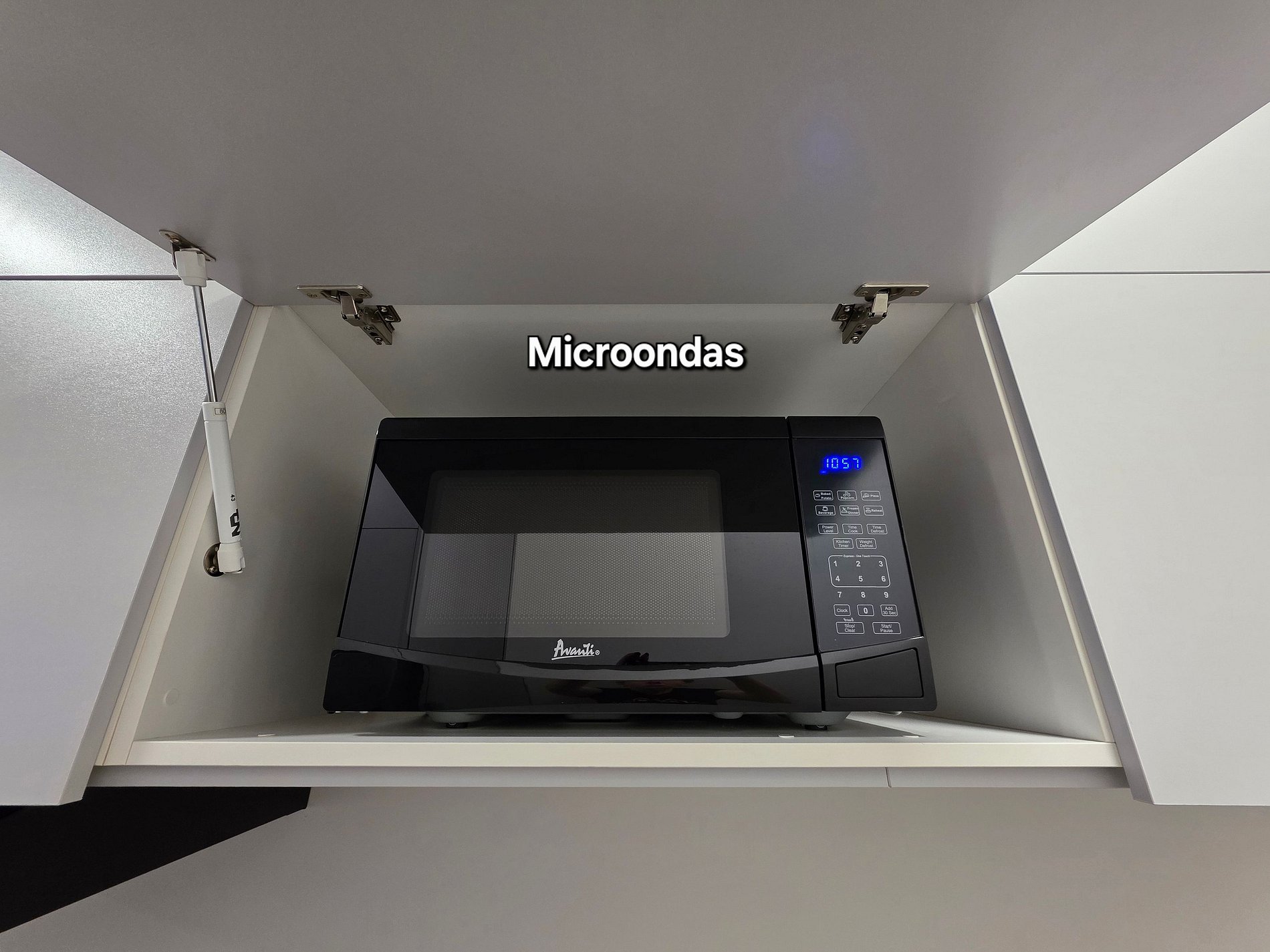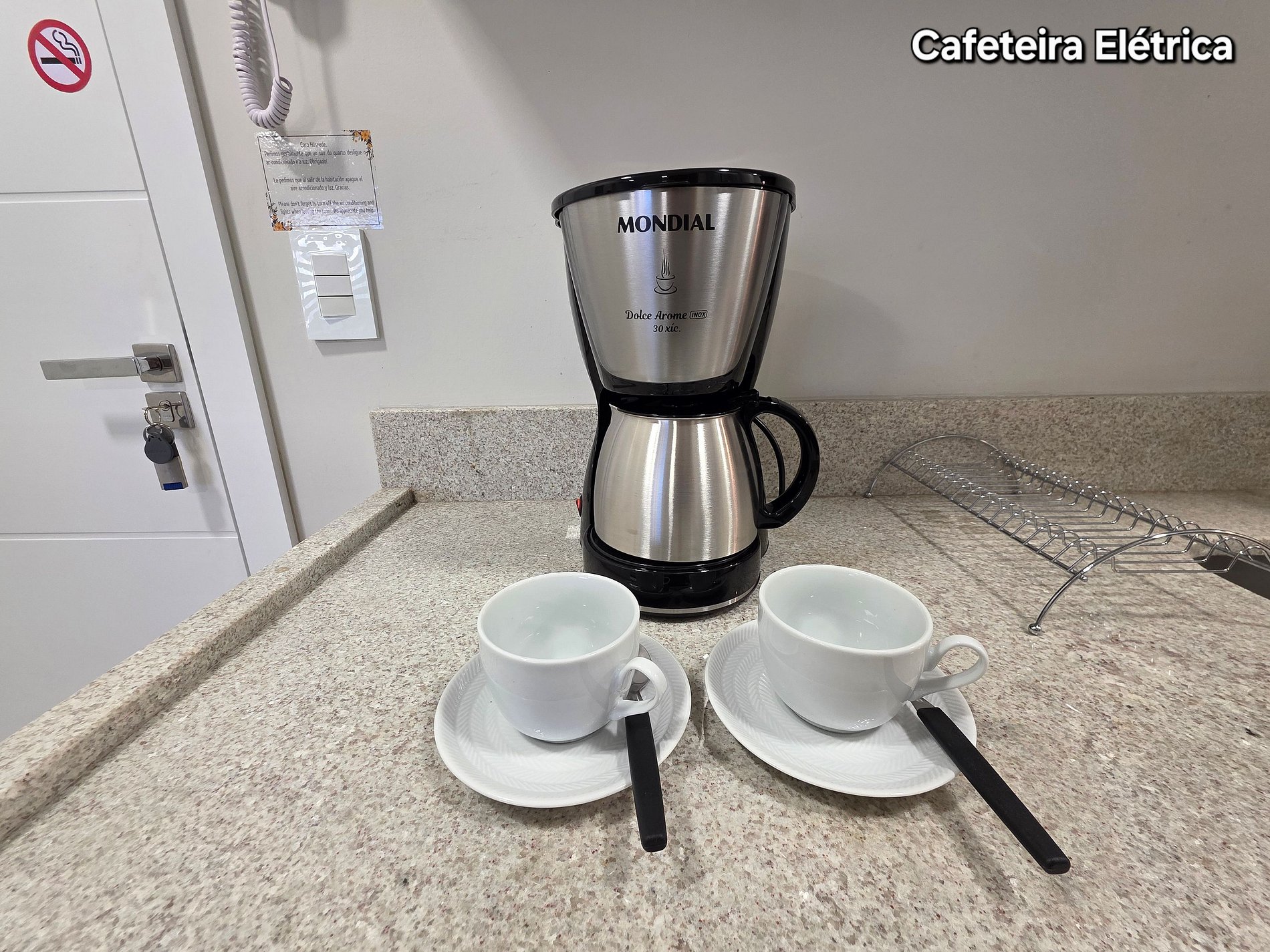 Cozinha completa com utensílios e louças para as refeições, microondas, liquidificador, sanduicheira, cafeteira e Airfryer.