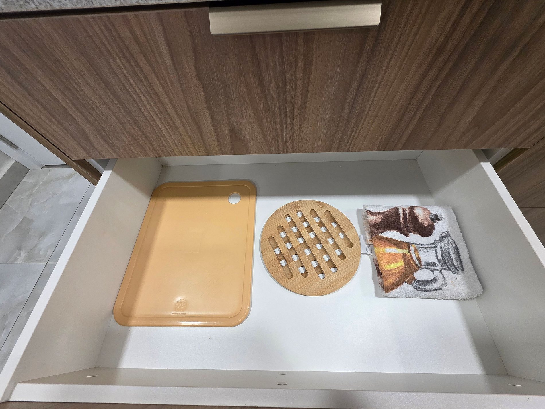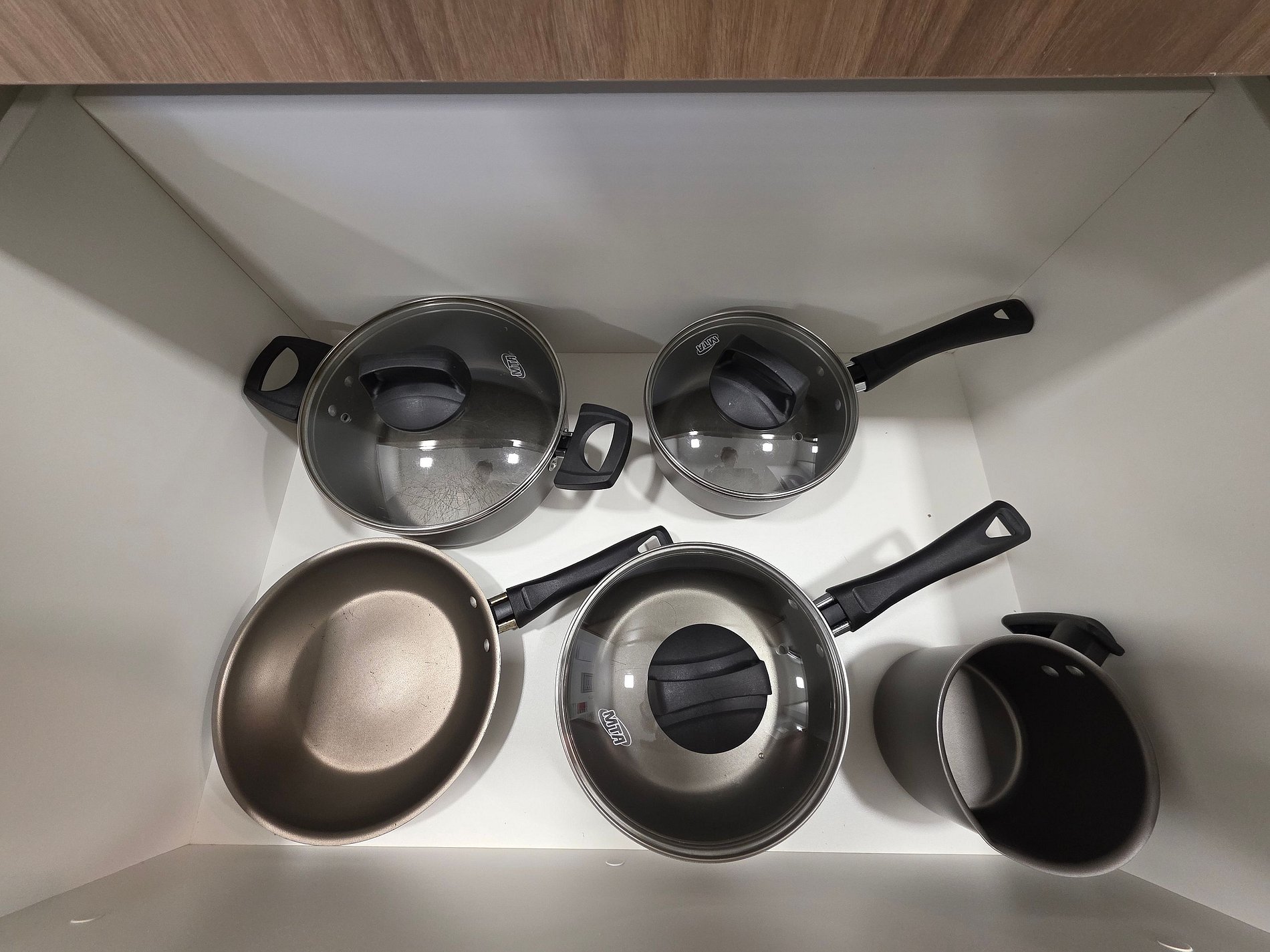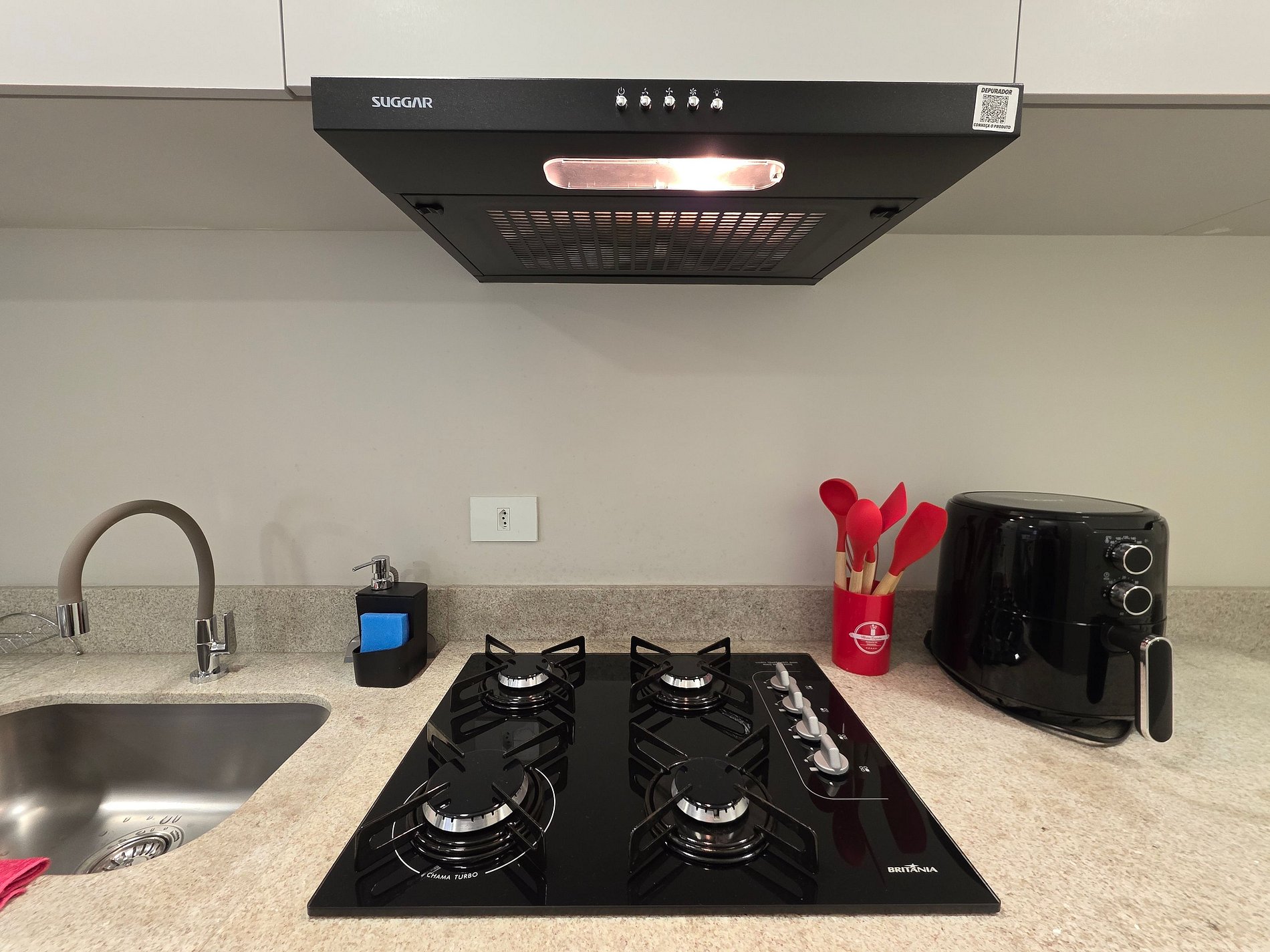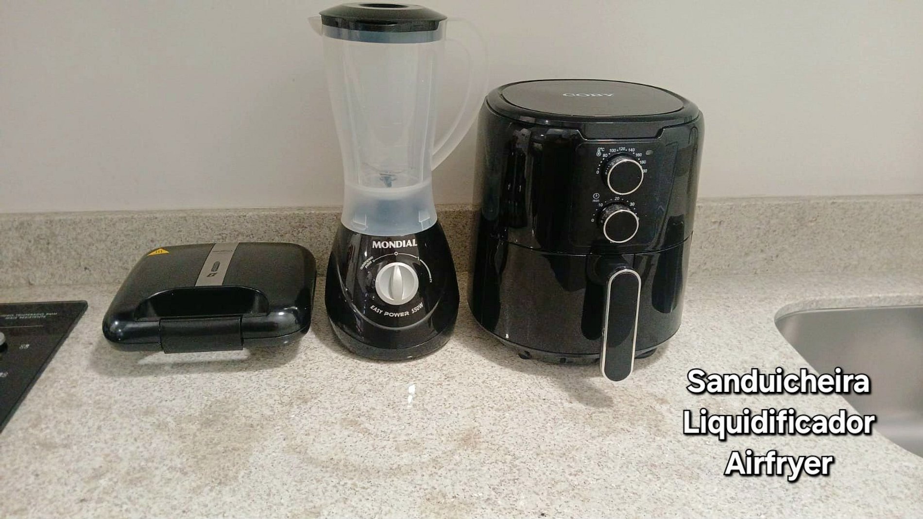 Cozinha completa com utensílios e louças para as refeições, microondas, liquidificador, sanduicheira, cafeteira e Airfryer.