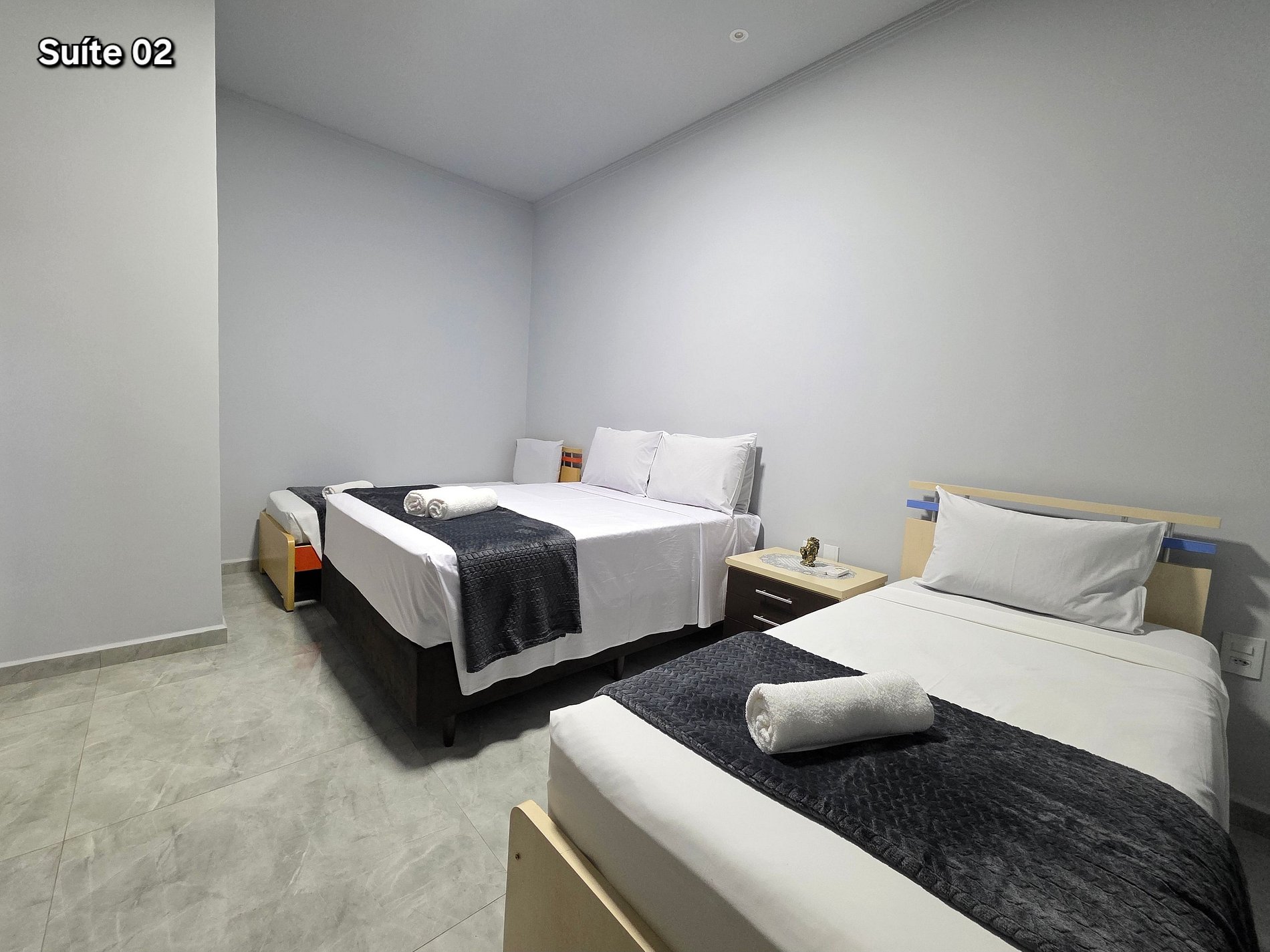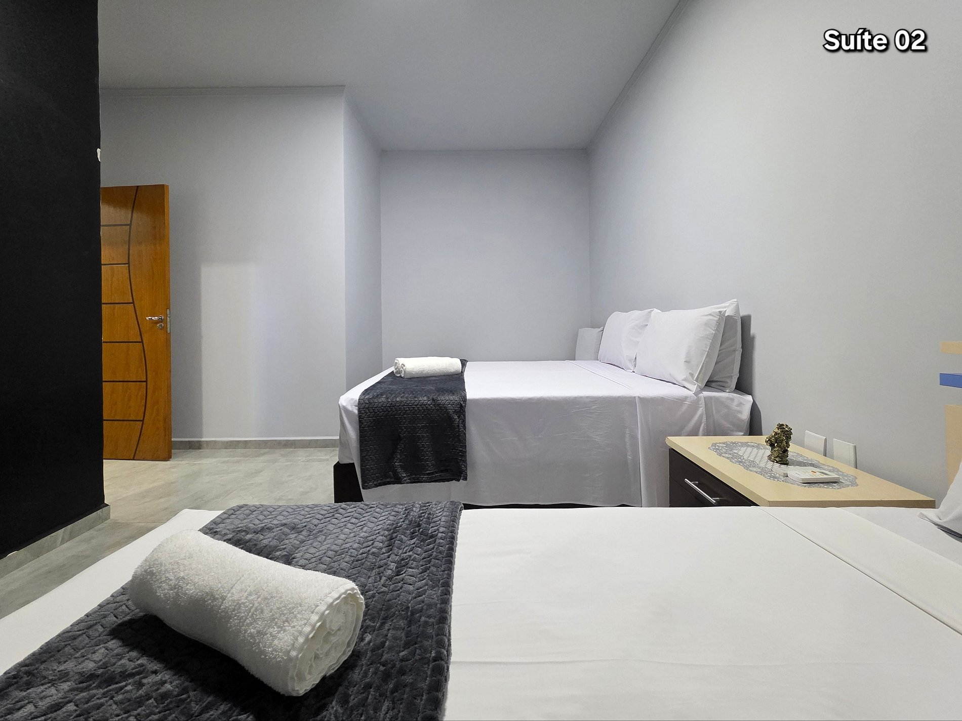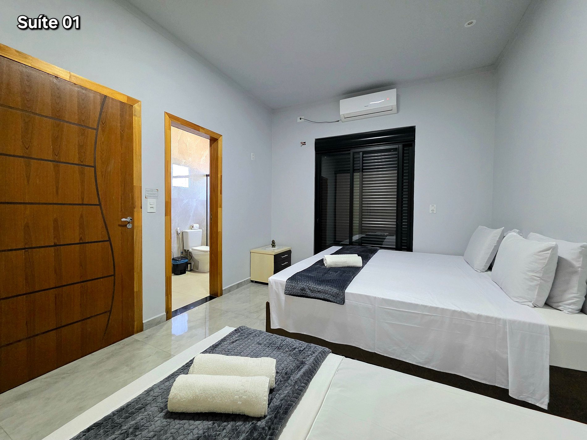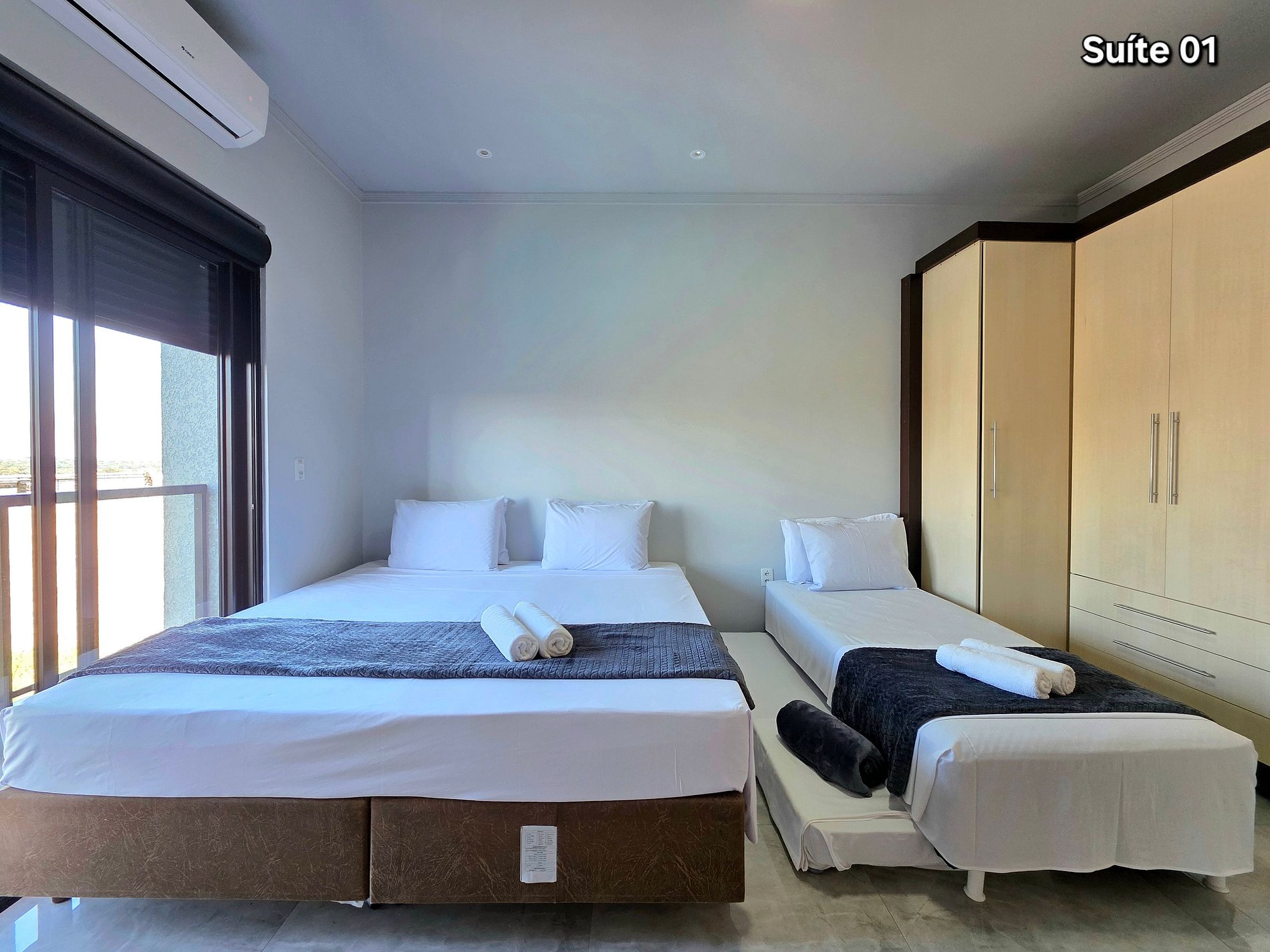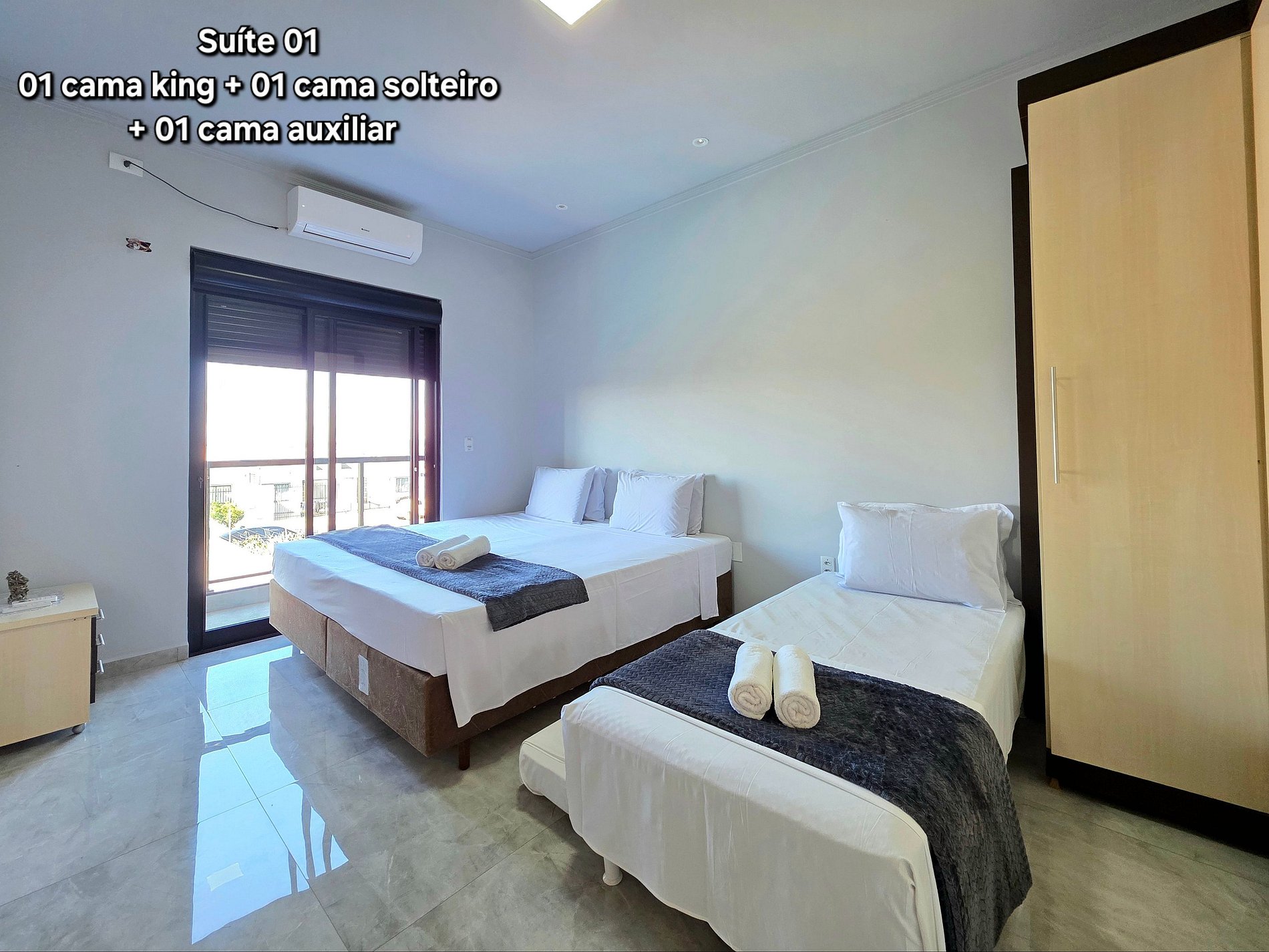 Suíte 01: 01 cama Kinsize + 01 cama solteiro + 01 cama auxiliar solteiro, com ar condicionado e banheiro;