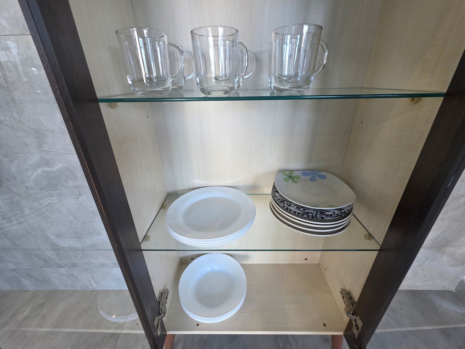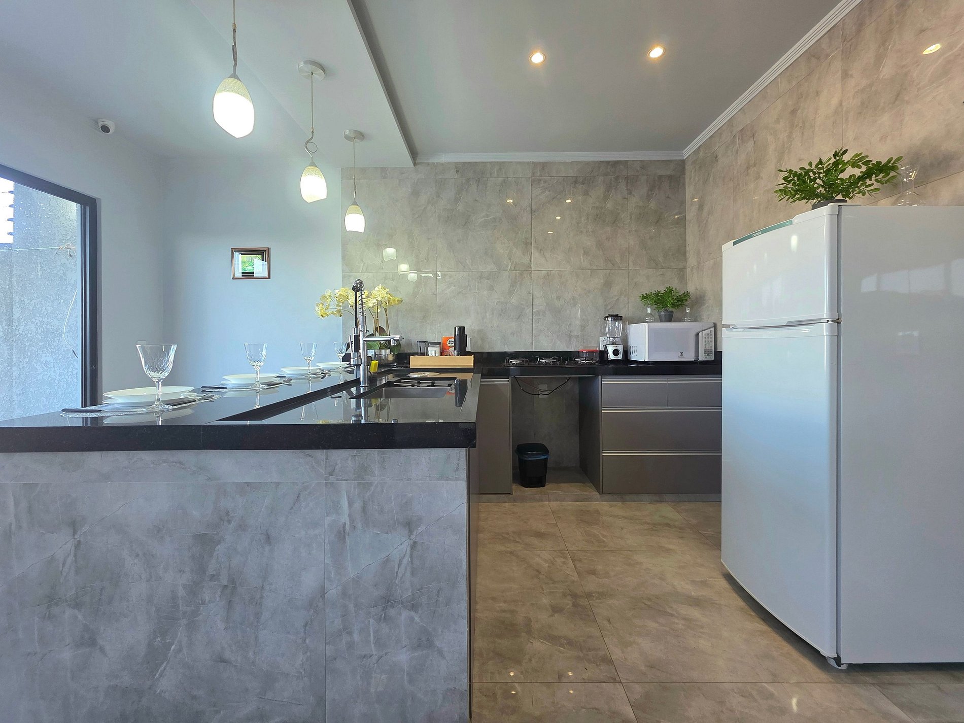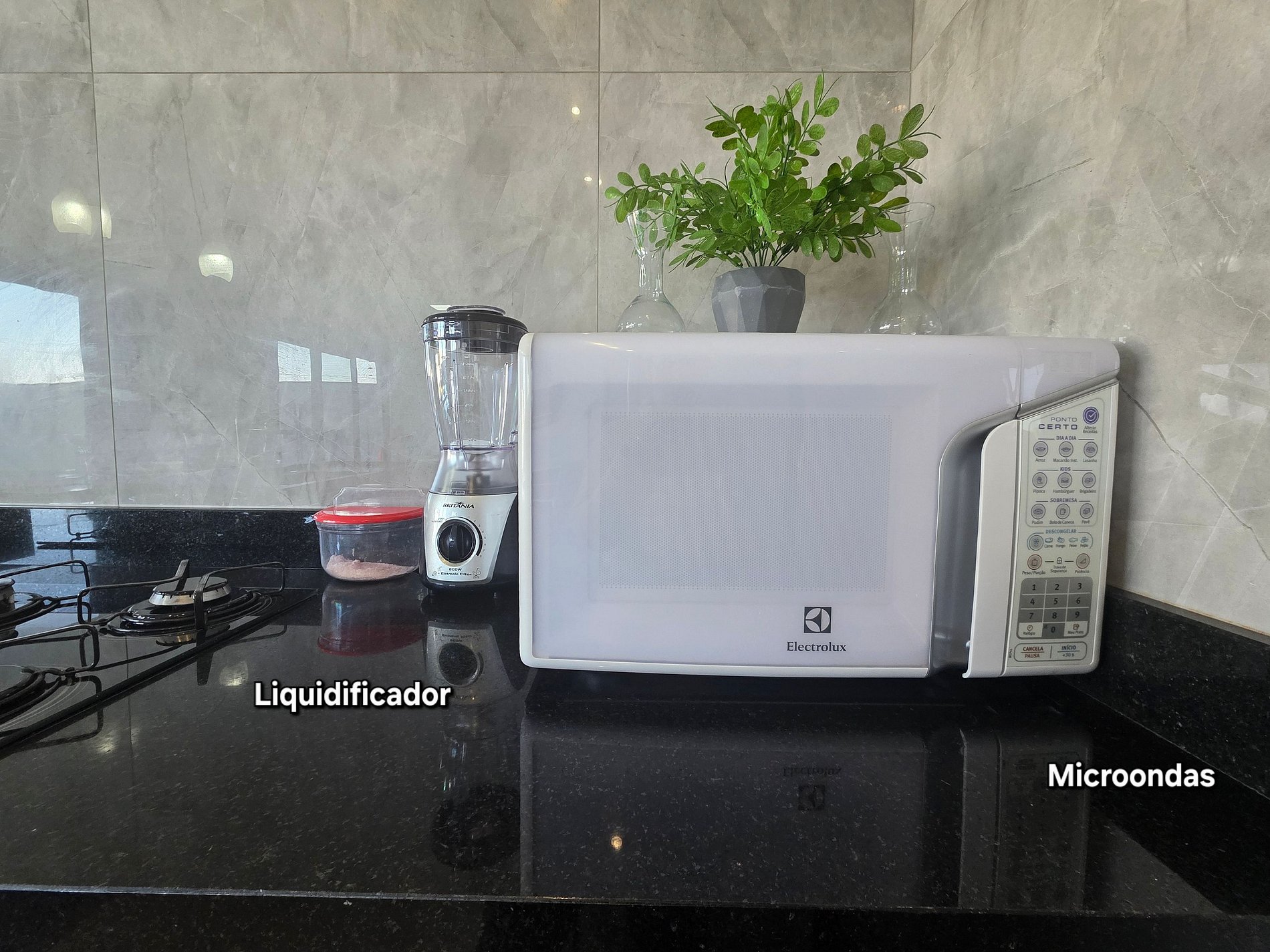 Cozinha completa com utensílios e louças para as refeições, fogão, microondas, sanduicheira, liquidificador.