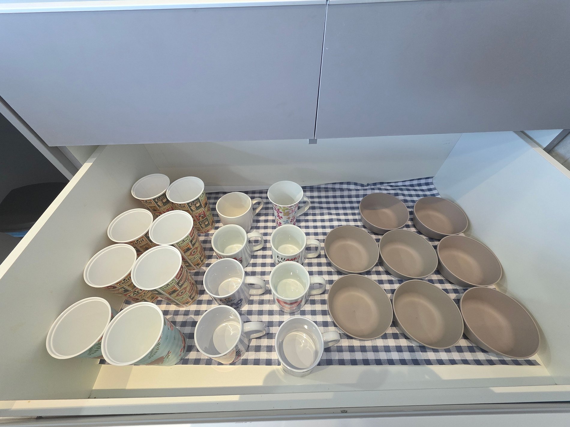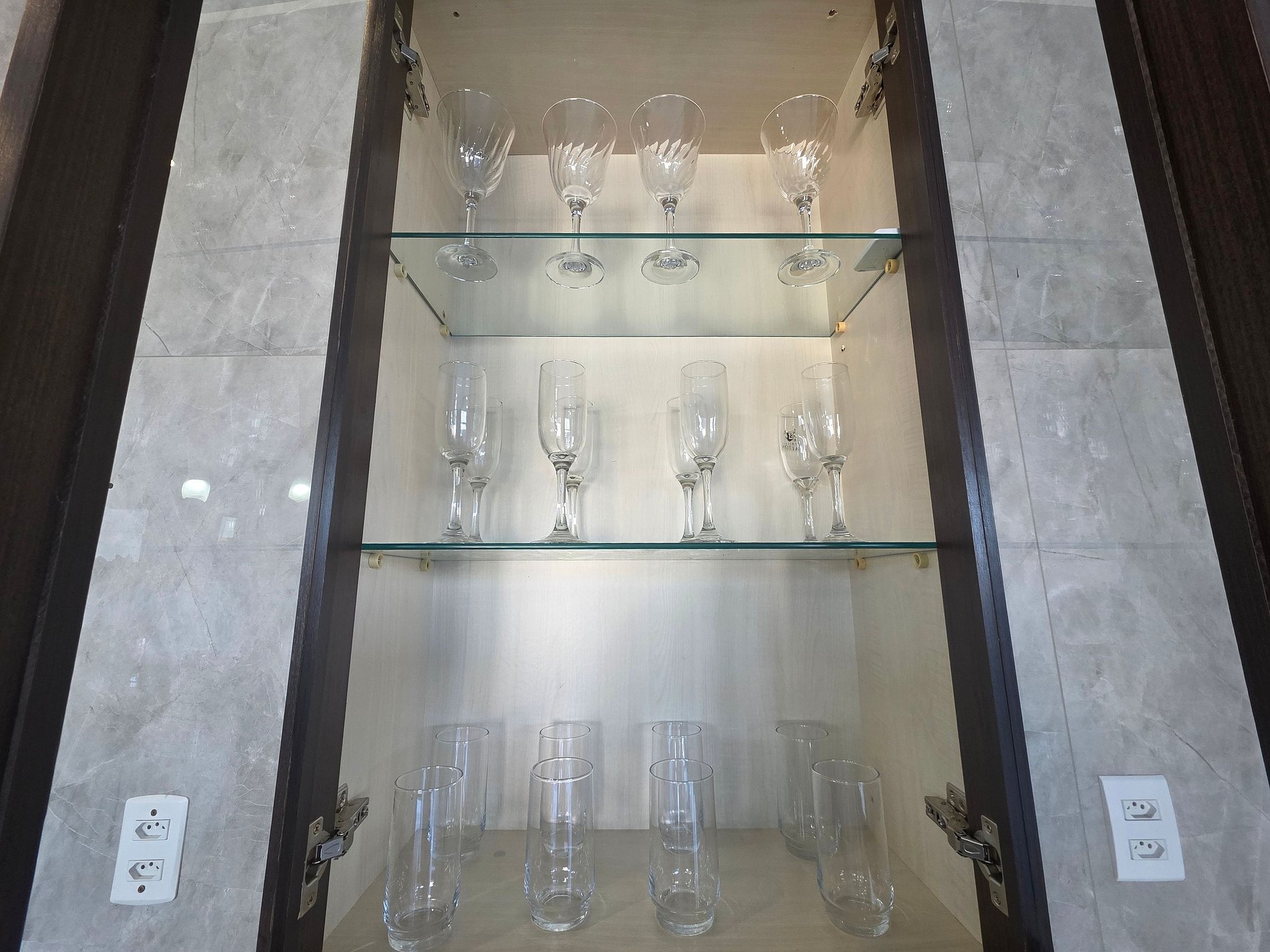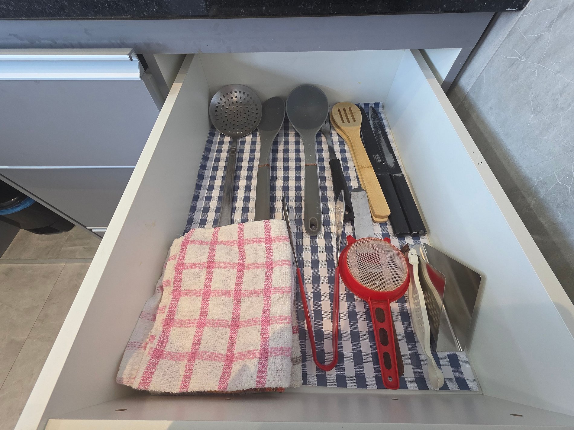 Cozinha completa com utensílios e louças para as refeições, fogão, microondas, sanduicheira, liquidificador.