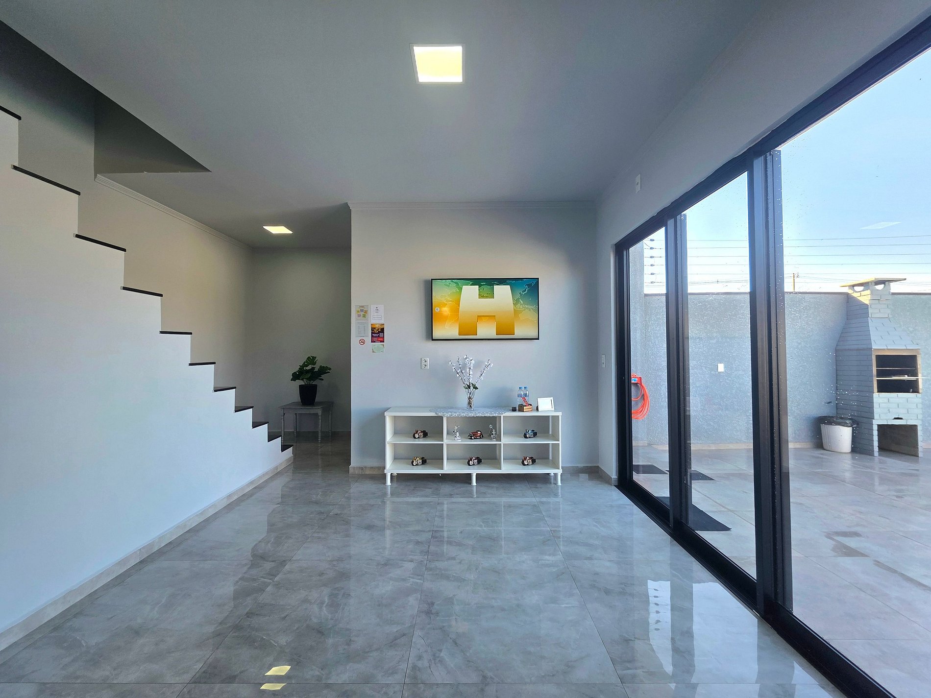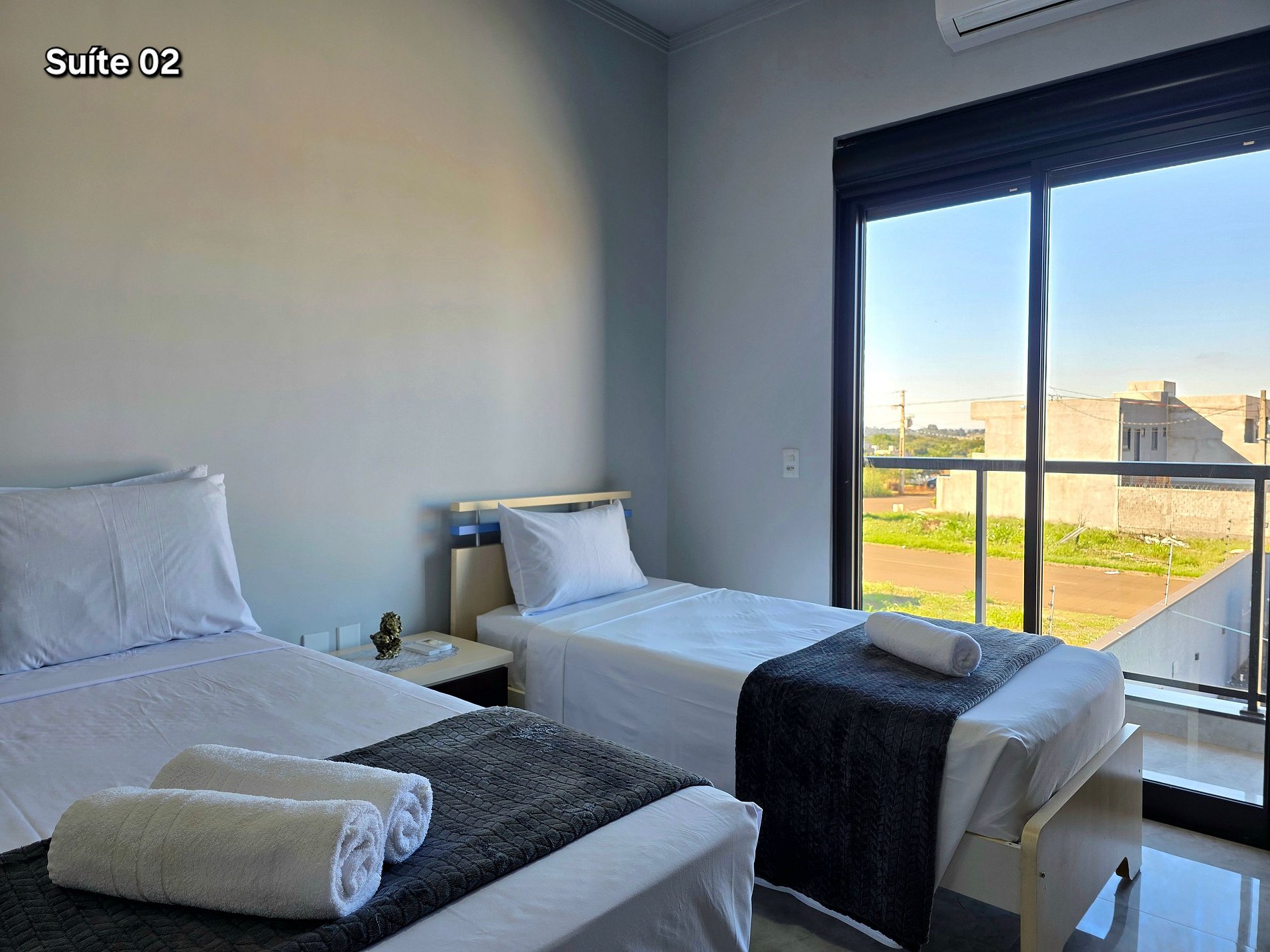 Sobrado com 2 suítes, novíssimo. Área de lazer com piscina e churrasqueira. Bairro novo, cerca de 15 minutos do Aeroporto e das Cataratas, 10 minutos do centro e 20 do Paraguai, Supermercado próximo. Quartos com ar-condicionado. Seu PET é bem-vindo. Incluso roupa de cama e toalha banho. Equipada com os utensílios para cozinhar. Estacionamento interno para 4 carros. Bairro tranquilo. Somos anfitriões comprometidos com sua estadia.