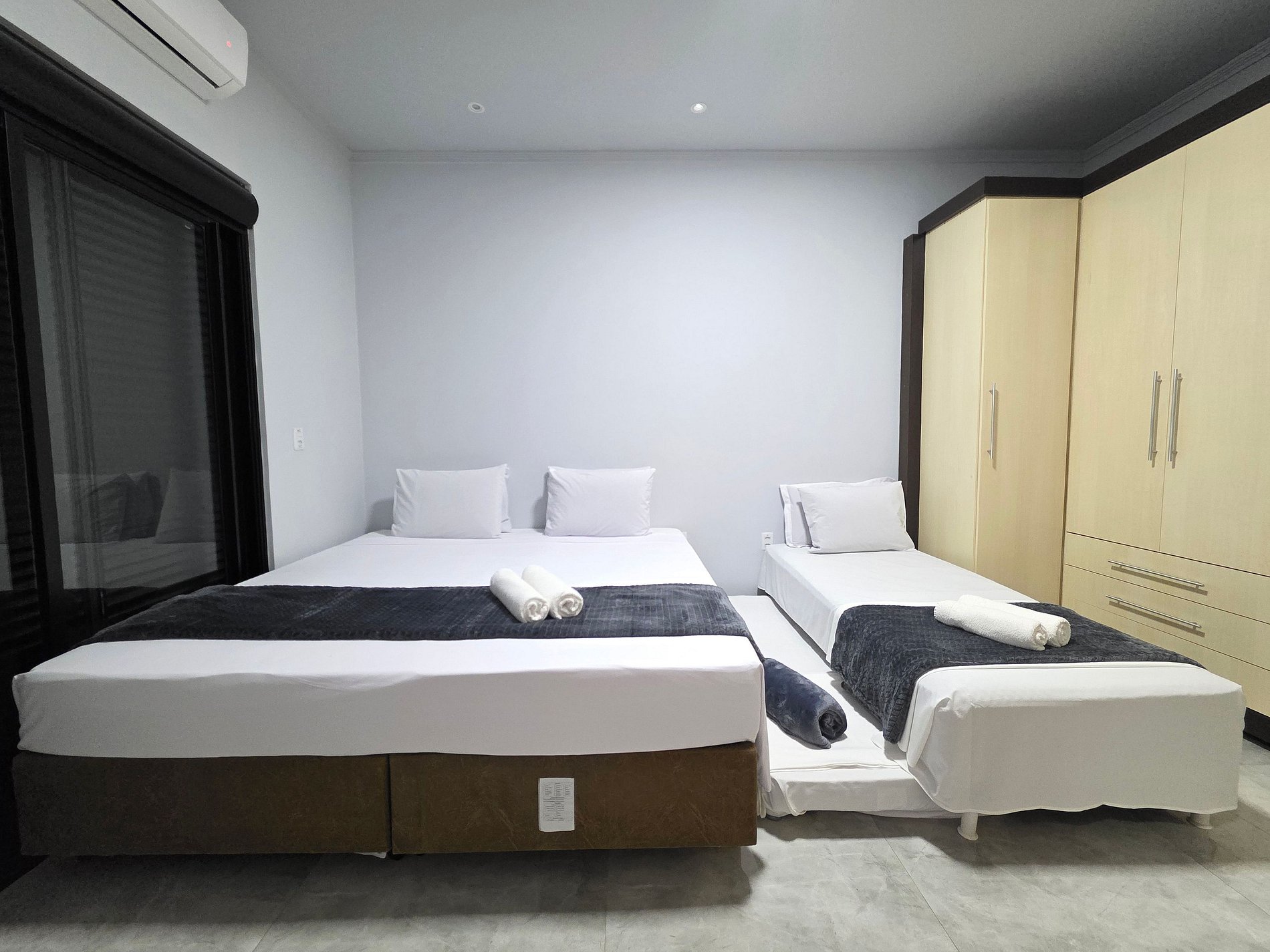 Suíte 01: 01 cama Queensize + 02 camas solteiro com ar condicionado e banheiro;