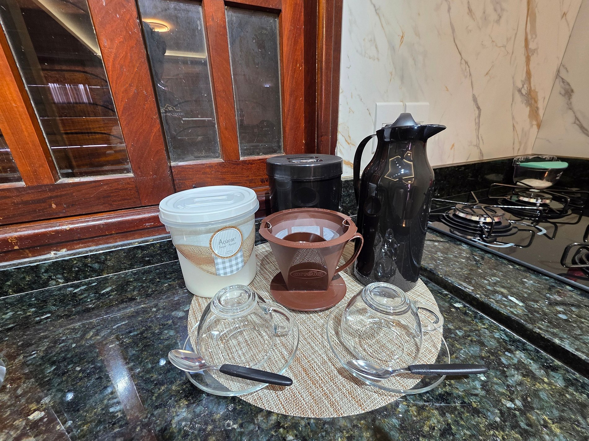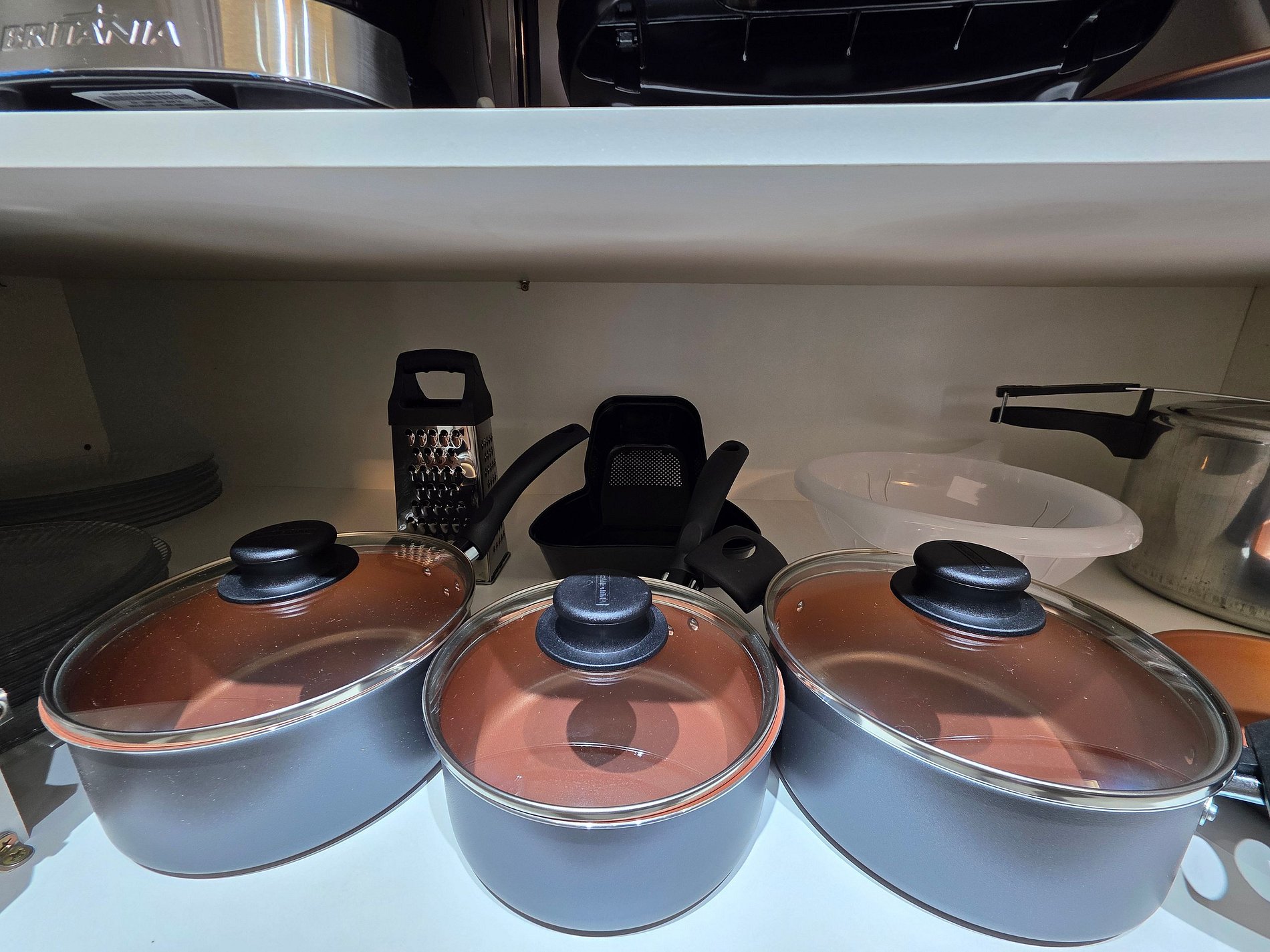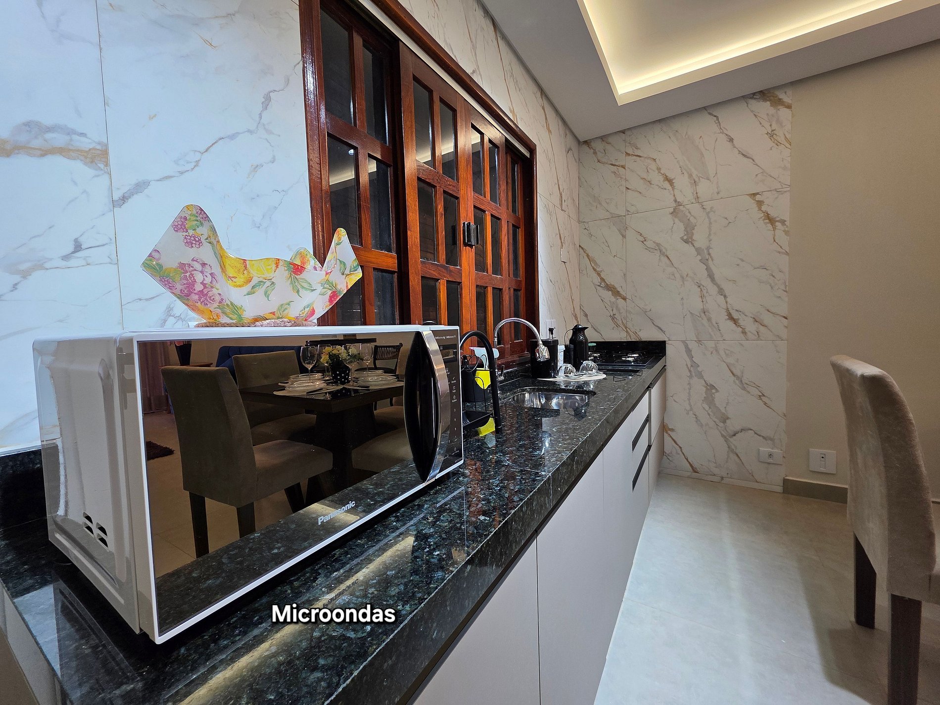 Cozinha completa com utensílios e louças para as refeições, microondas, liquidificador, sanduicheira.