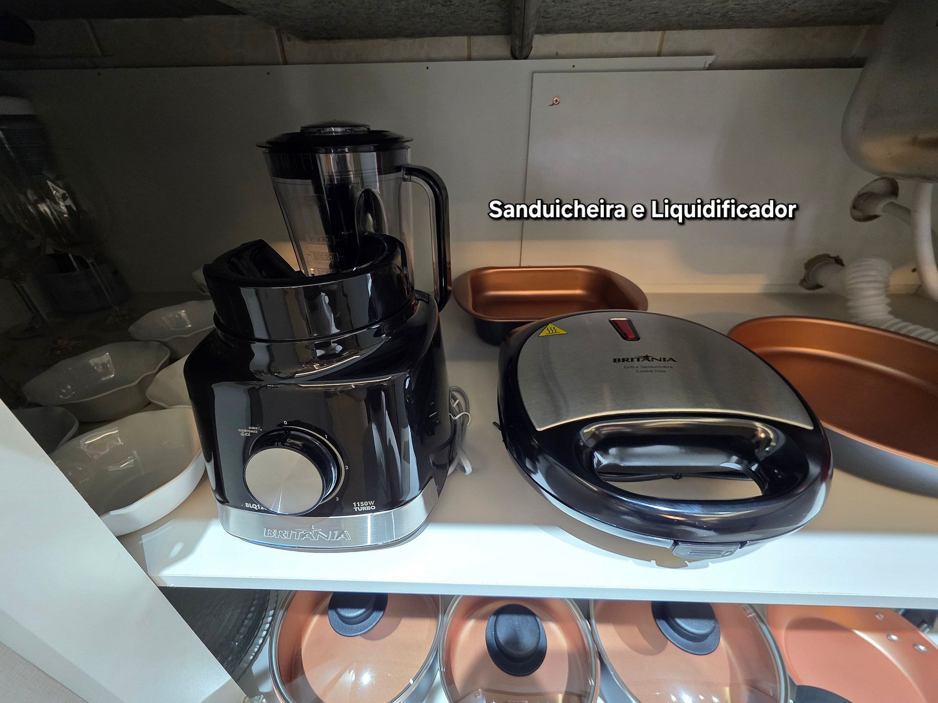Cozinha completa com utensílios e louças para as refeições, microondas, liquidificador, sanduicheira.