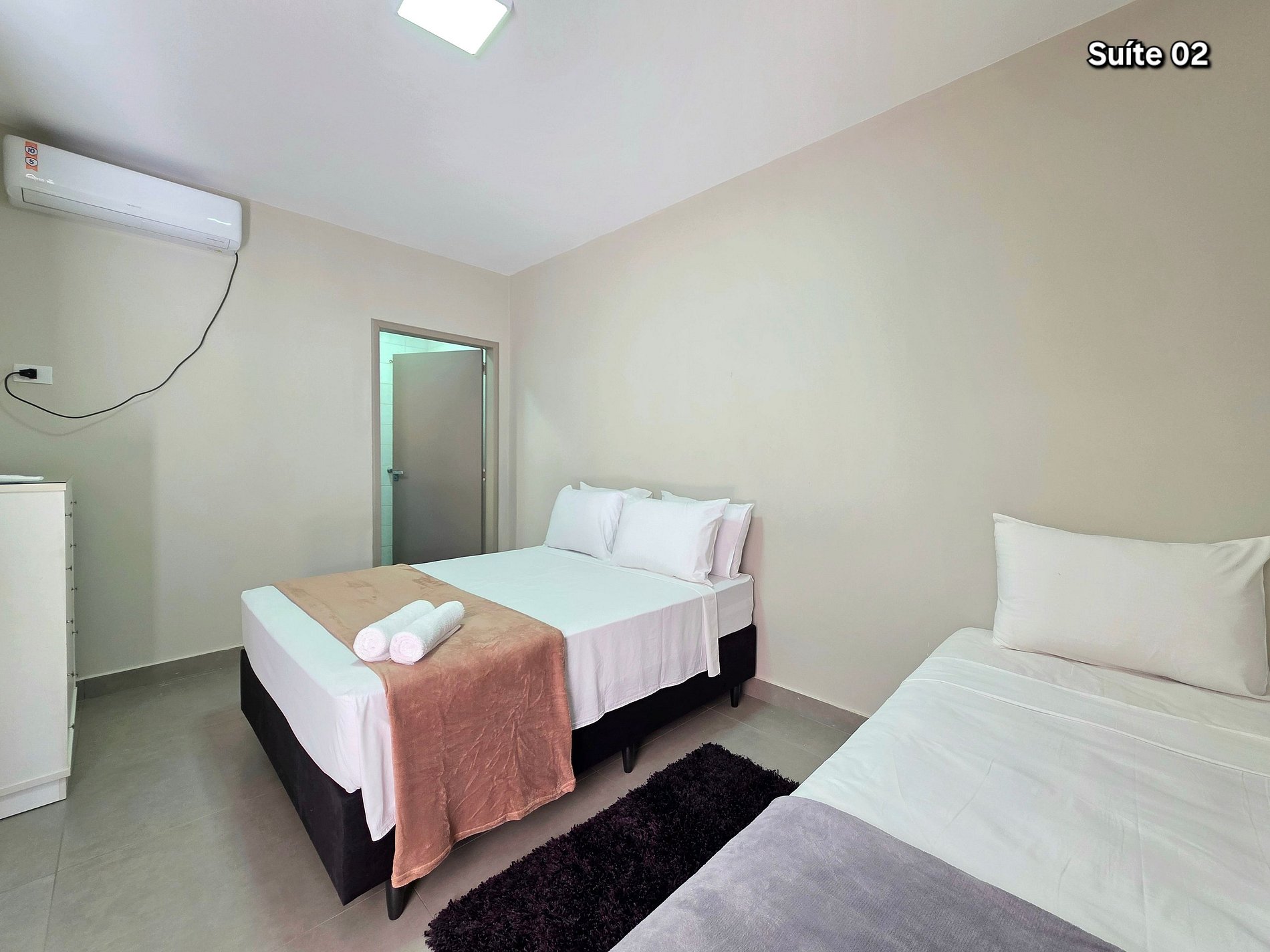 01 suíte com 01 cama de casal queensize + 01 cama de solteiro (com banheiro)
