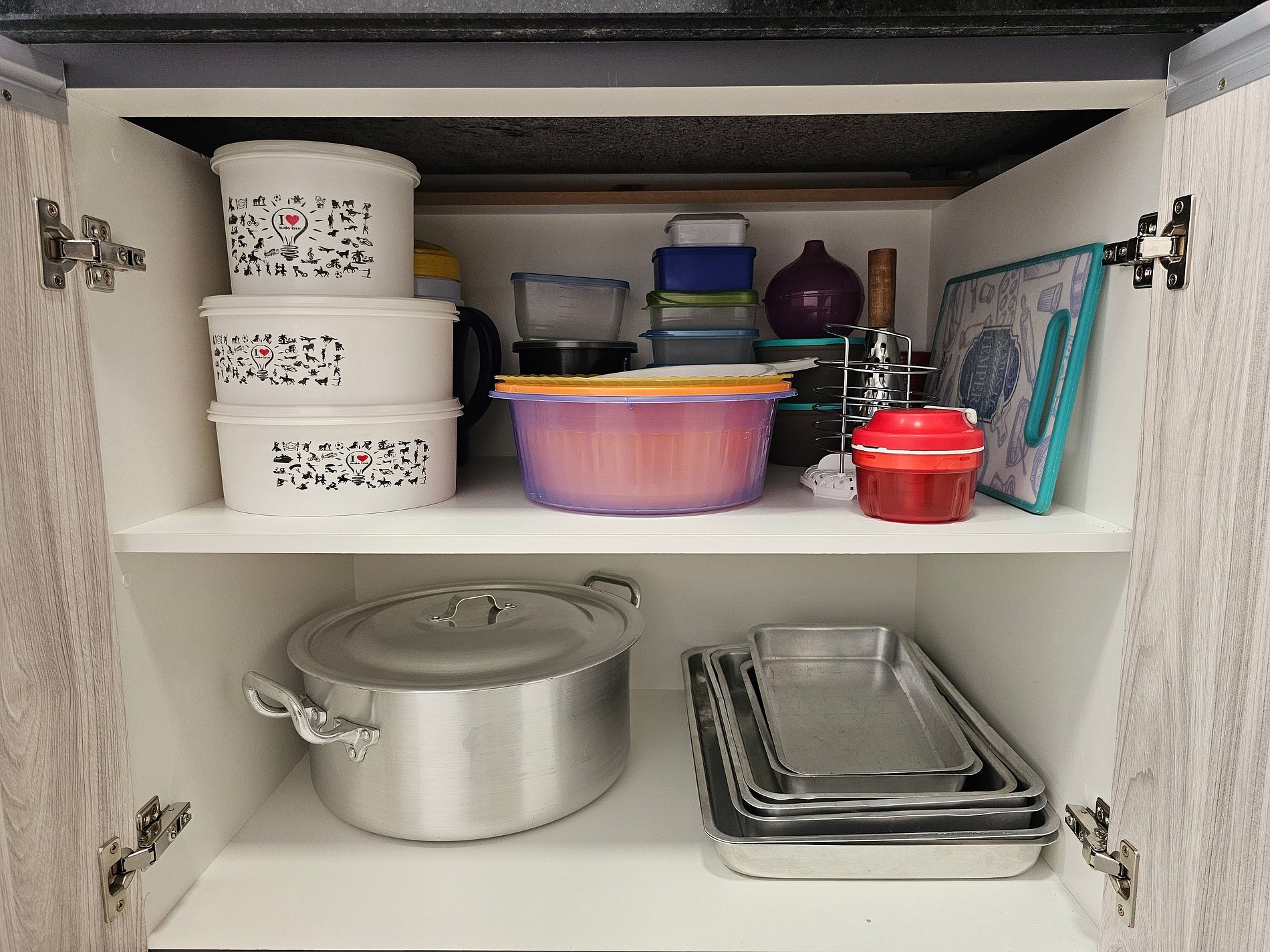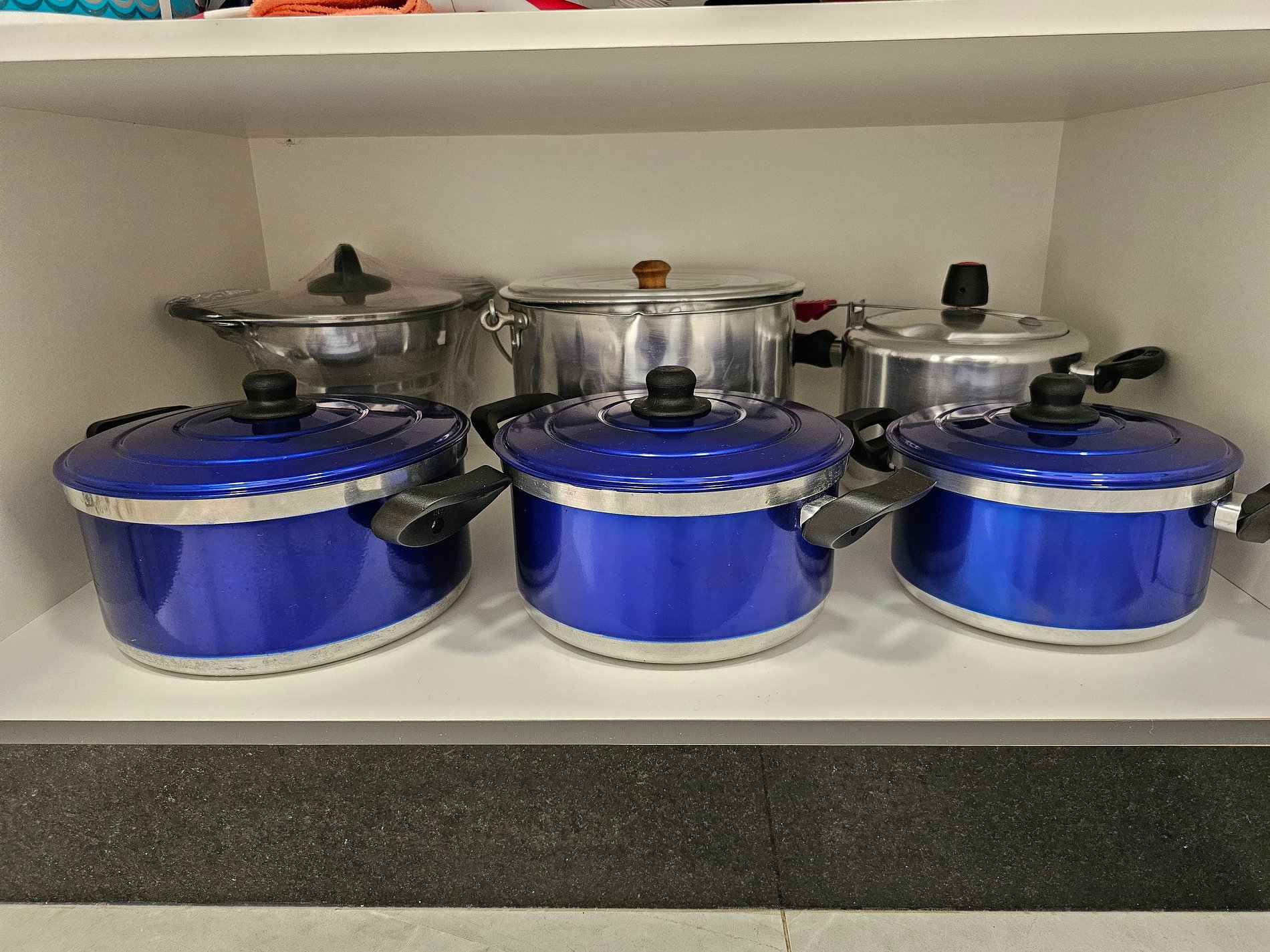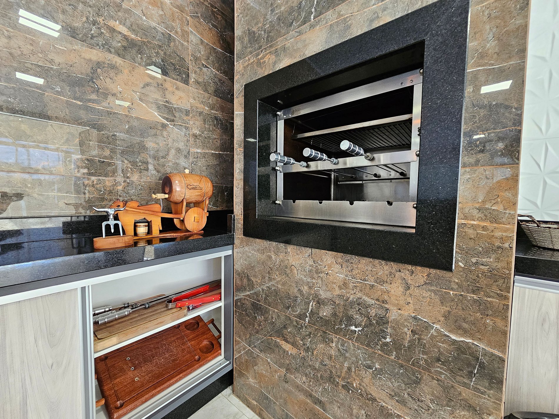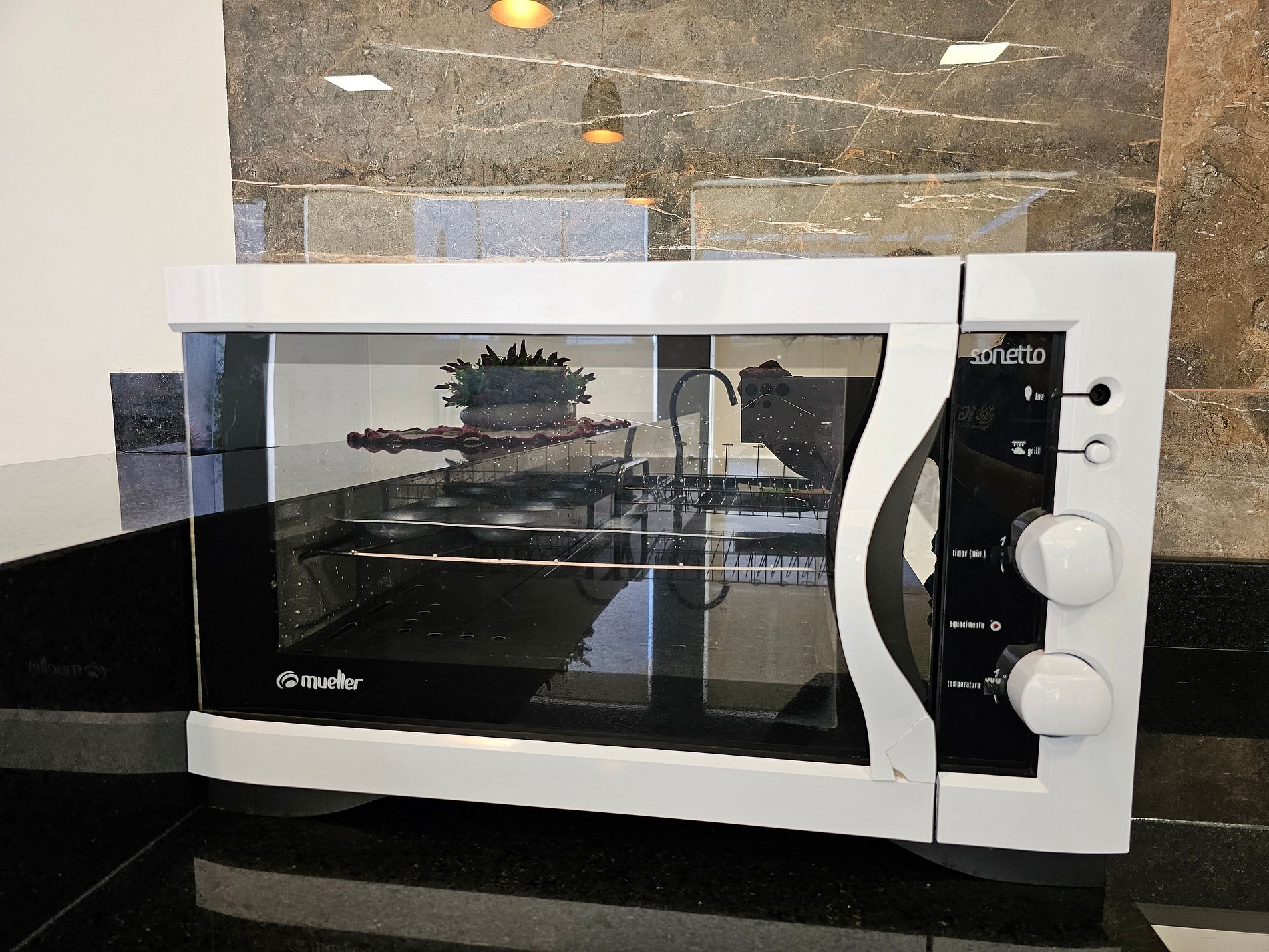 Cozinha completa com utensílios e louças para as refeições, microondas, forno, liquidificador, torradeira e cafeteira elétrica.