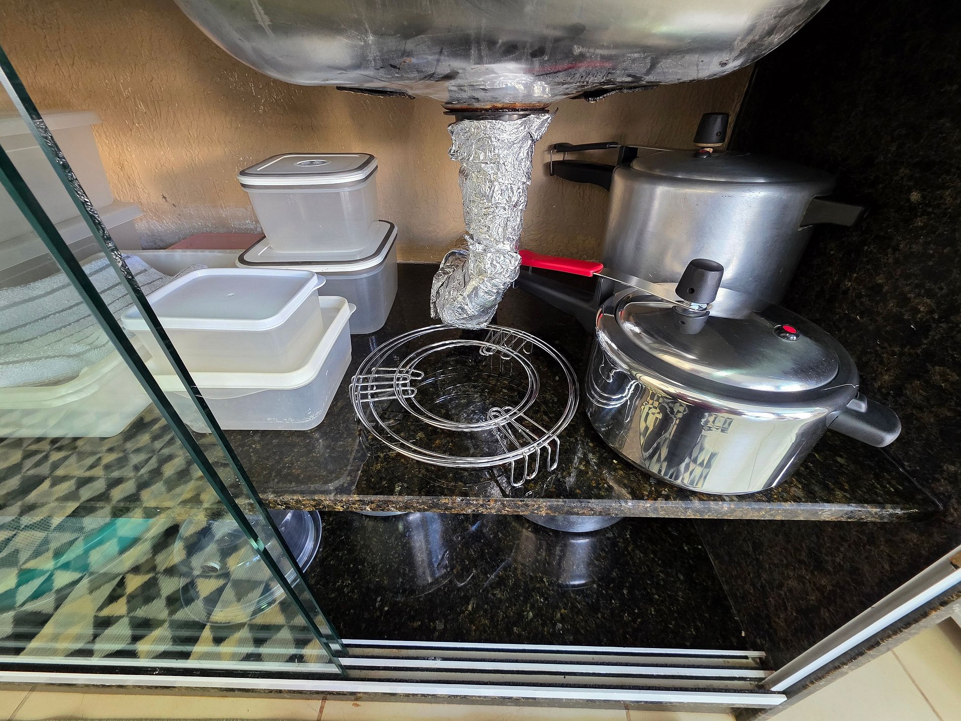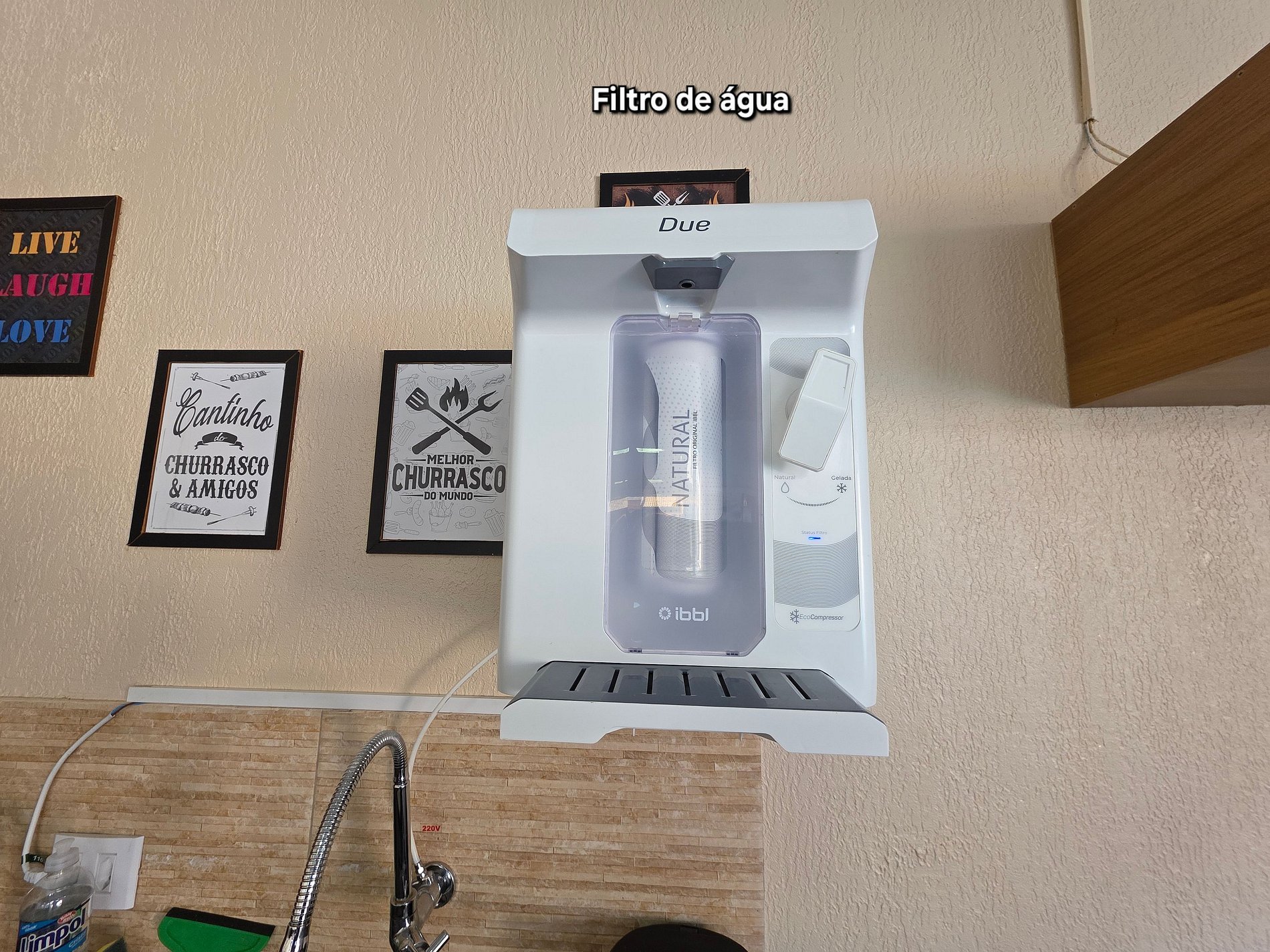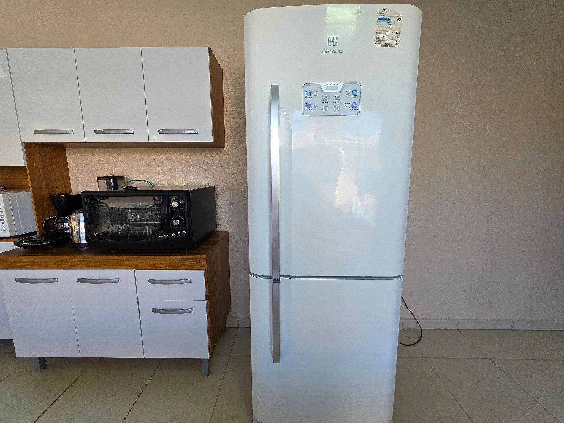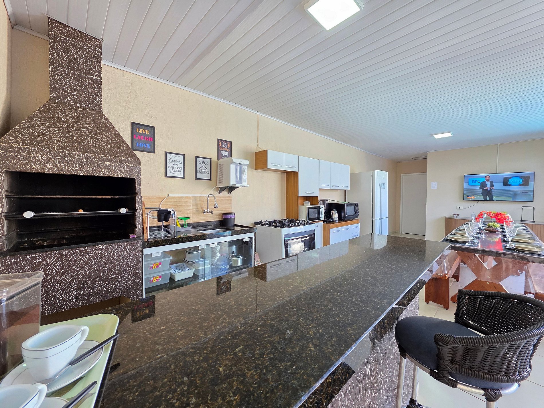 Area gourmet com piscina, equipada com utensilios e louças para as refeições, fogão com forno, microondas, liquidificador, sanduicheira, sanduicheira, cafeteira elétrica, chaleira elétrica e filtro de água.