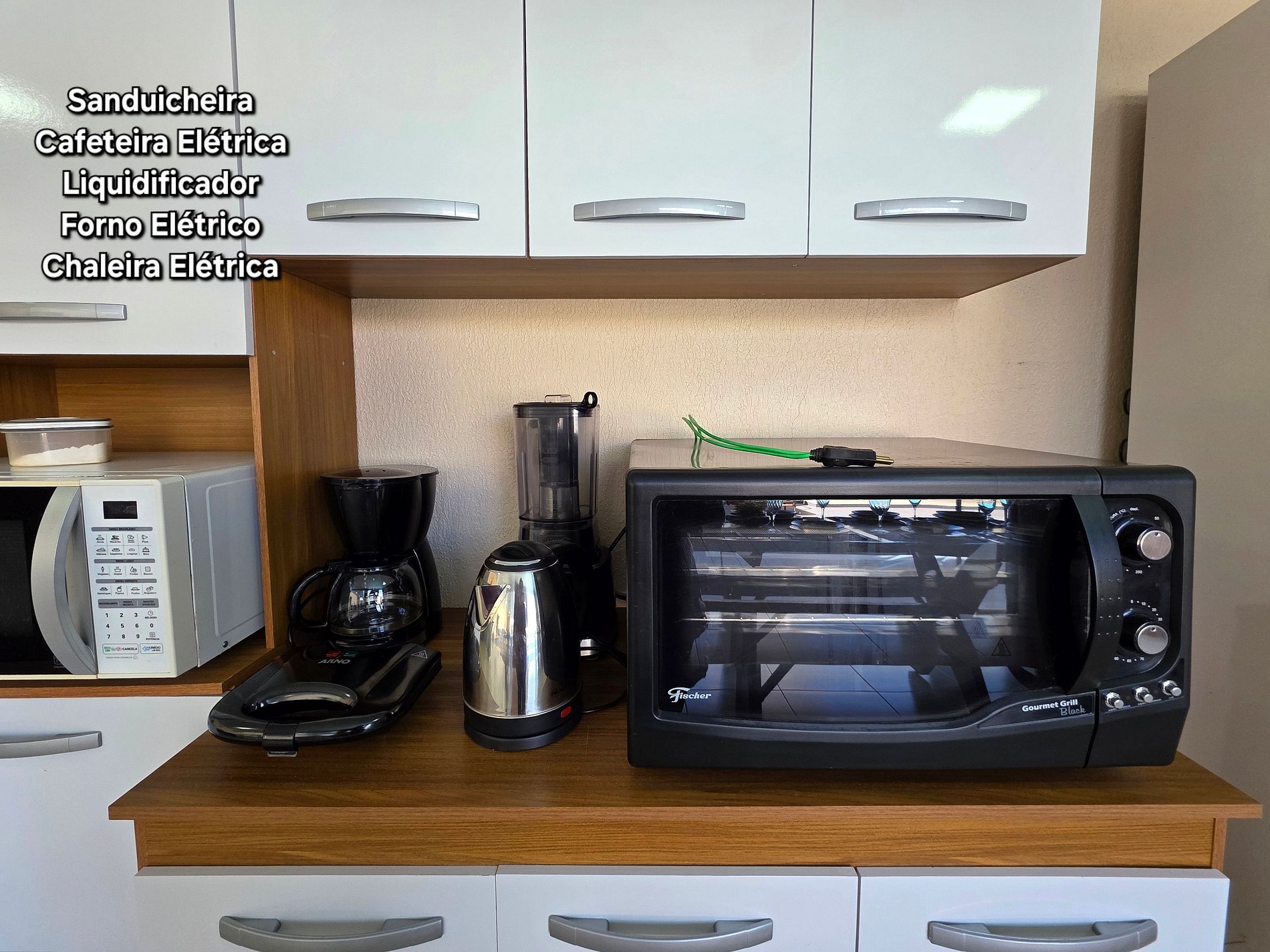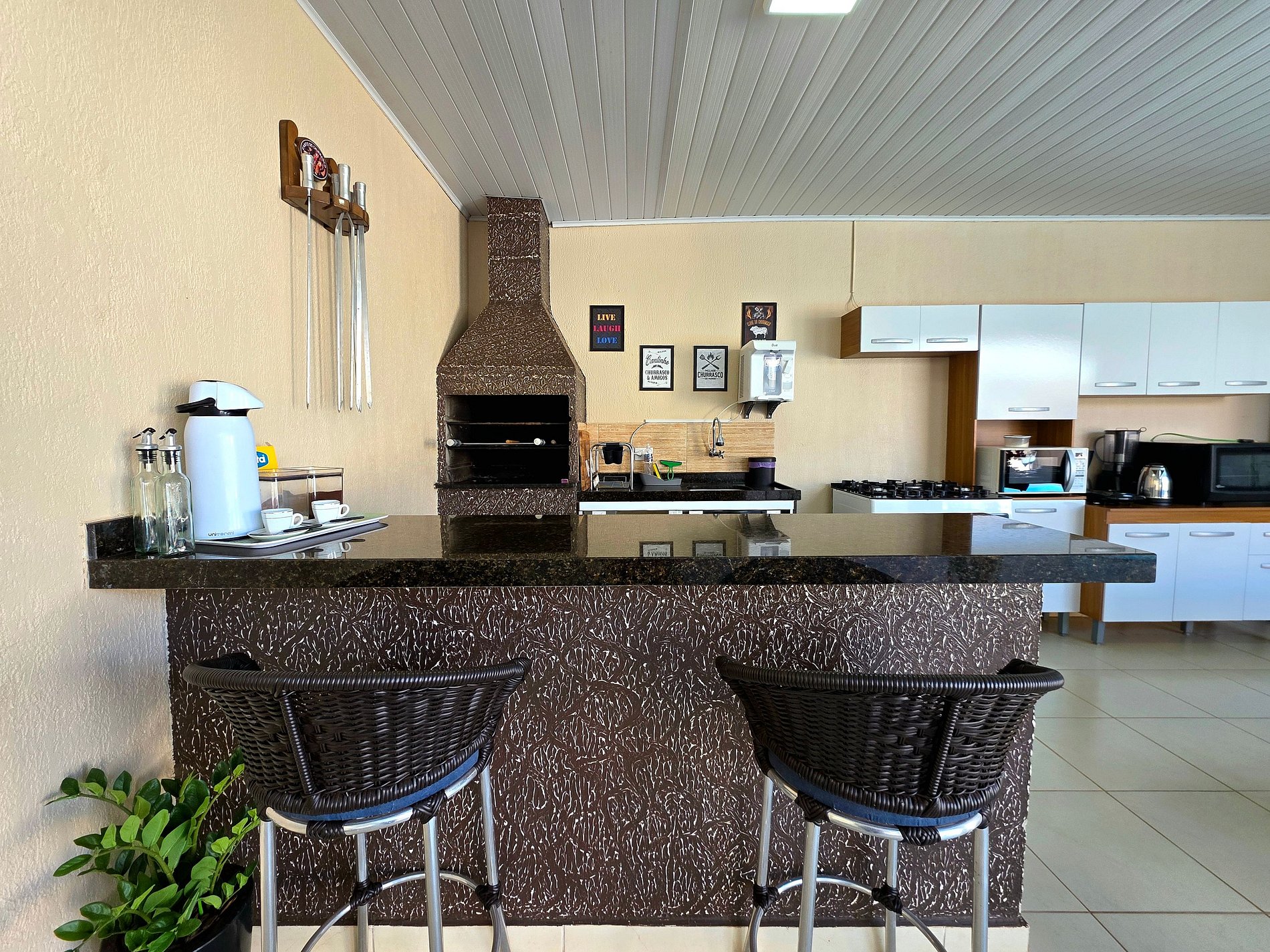 Area gourmet com piscina, equipada com utensilios e louças para as refeições, fogão com forno, microondas, liquidificador, sanduicheira, sanduicheira, cafeteira elétrica, chaleira elétrica e filtro de água.