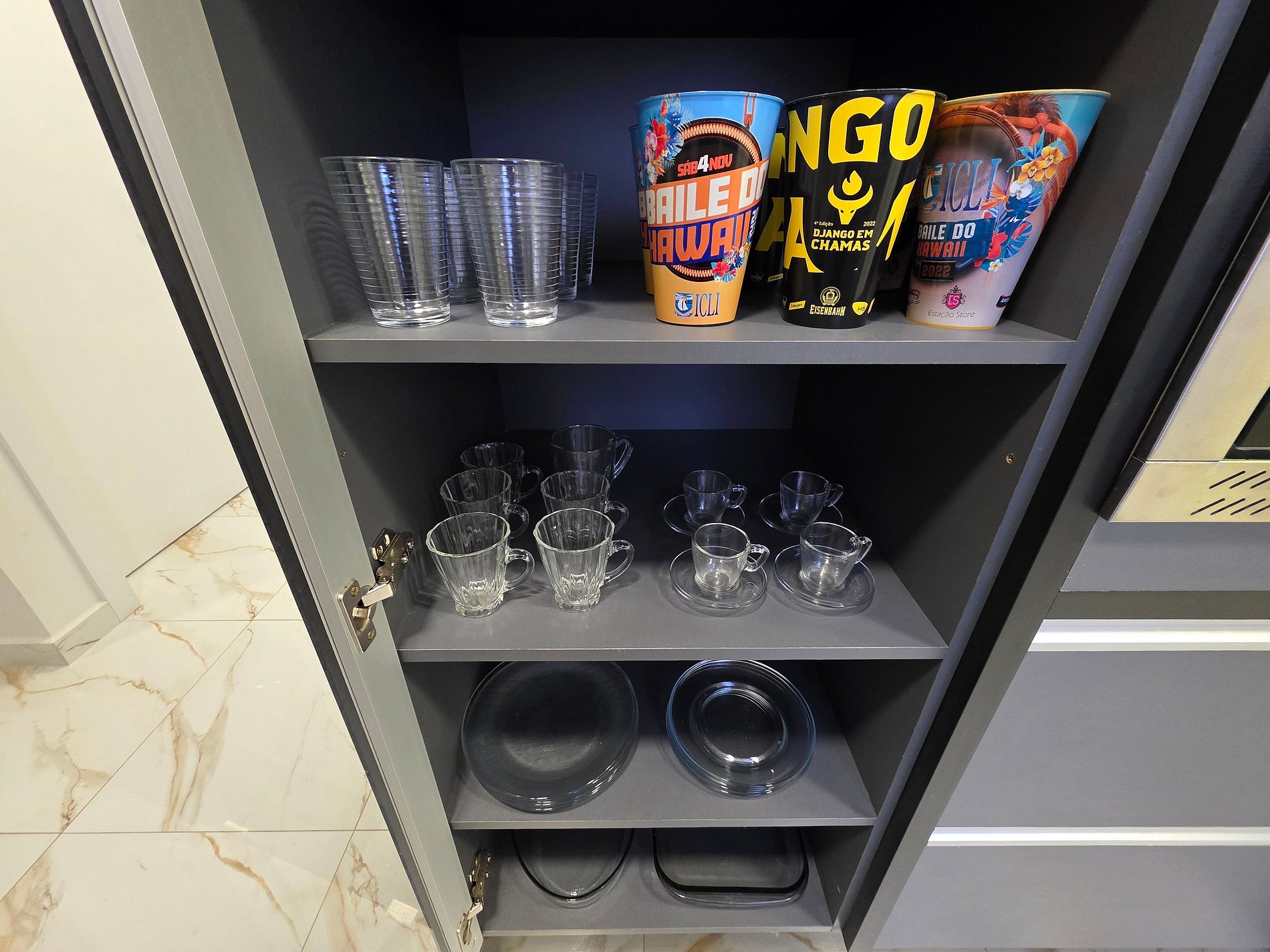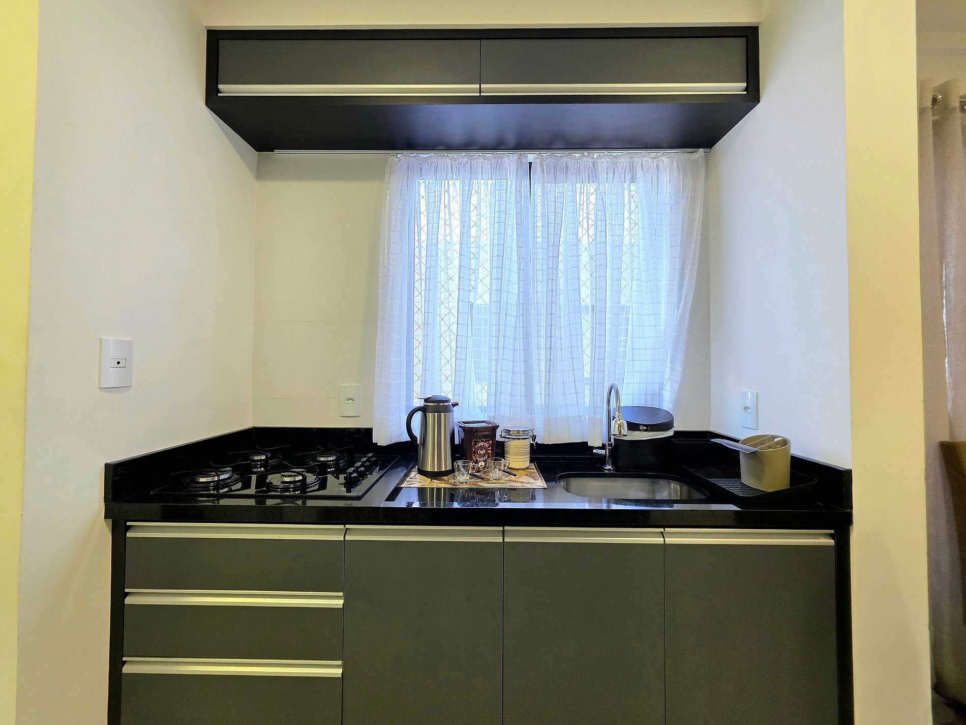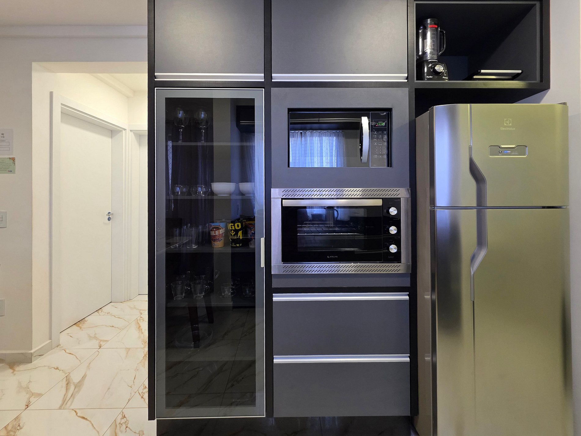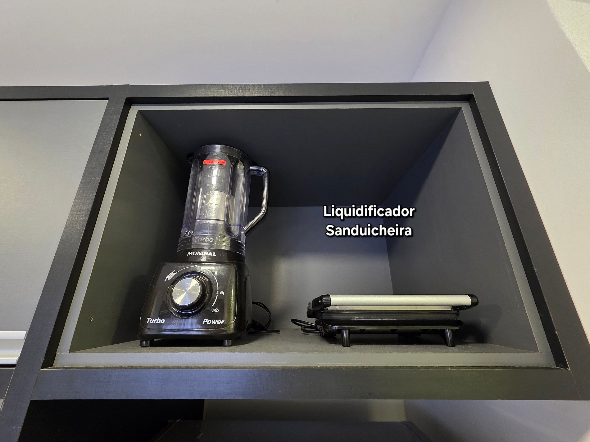 Cozinha completa com utensílios e louças para as refeições, microondas, liquidificador, sanduicheira.
