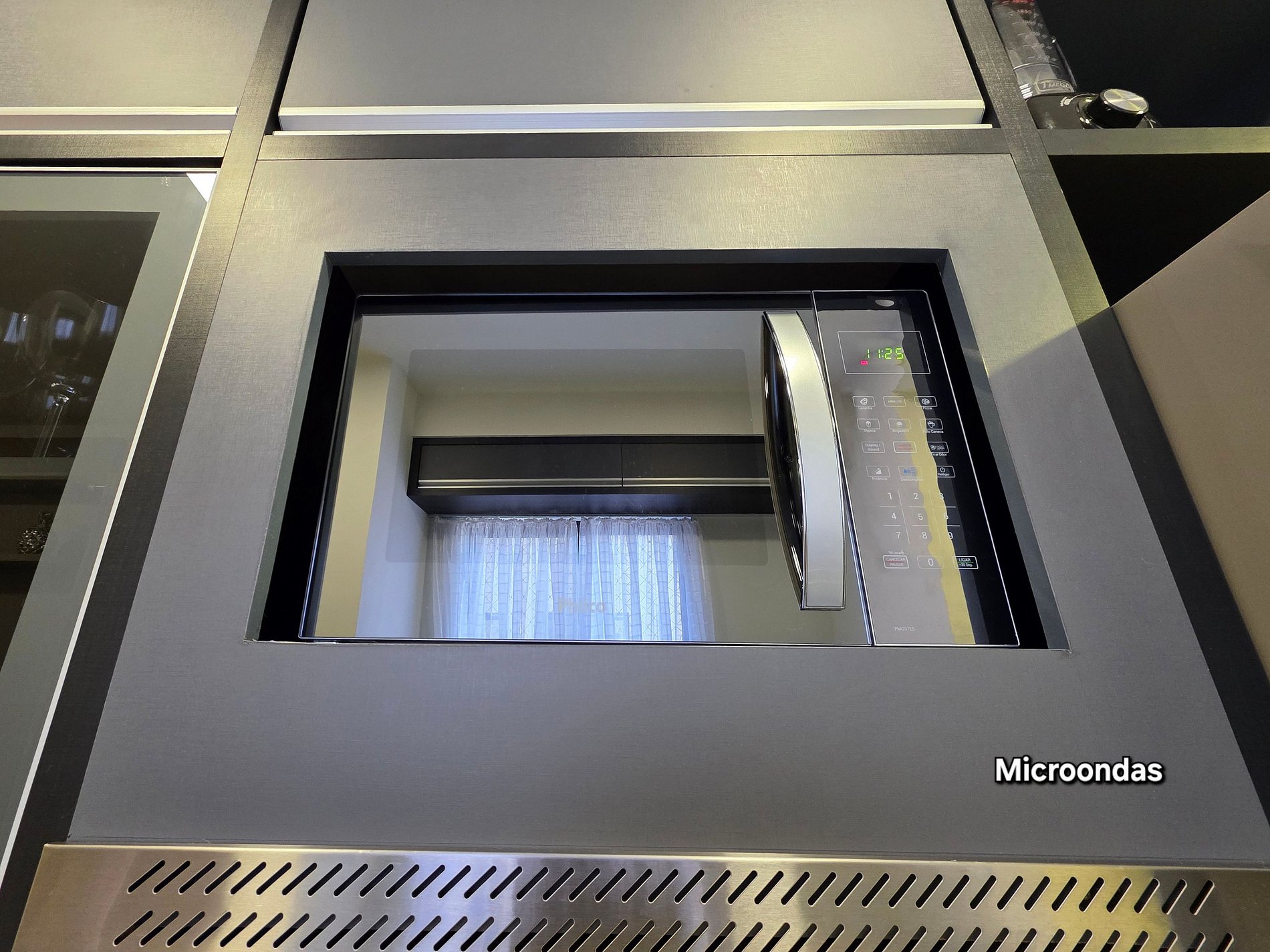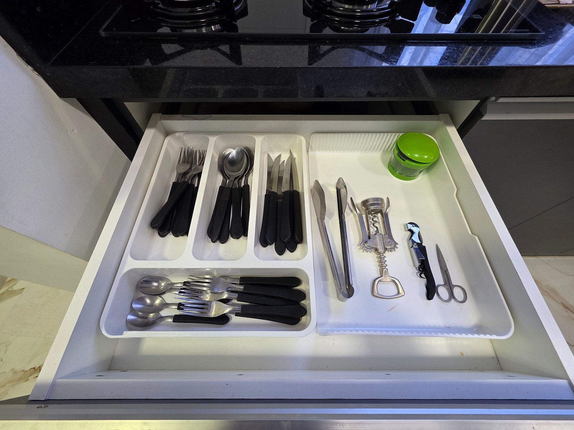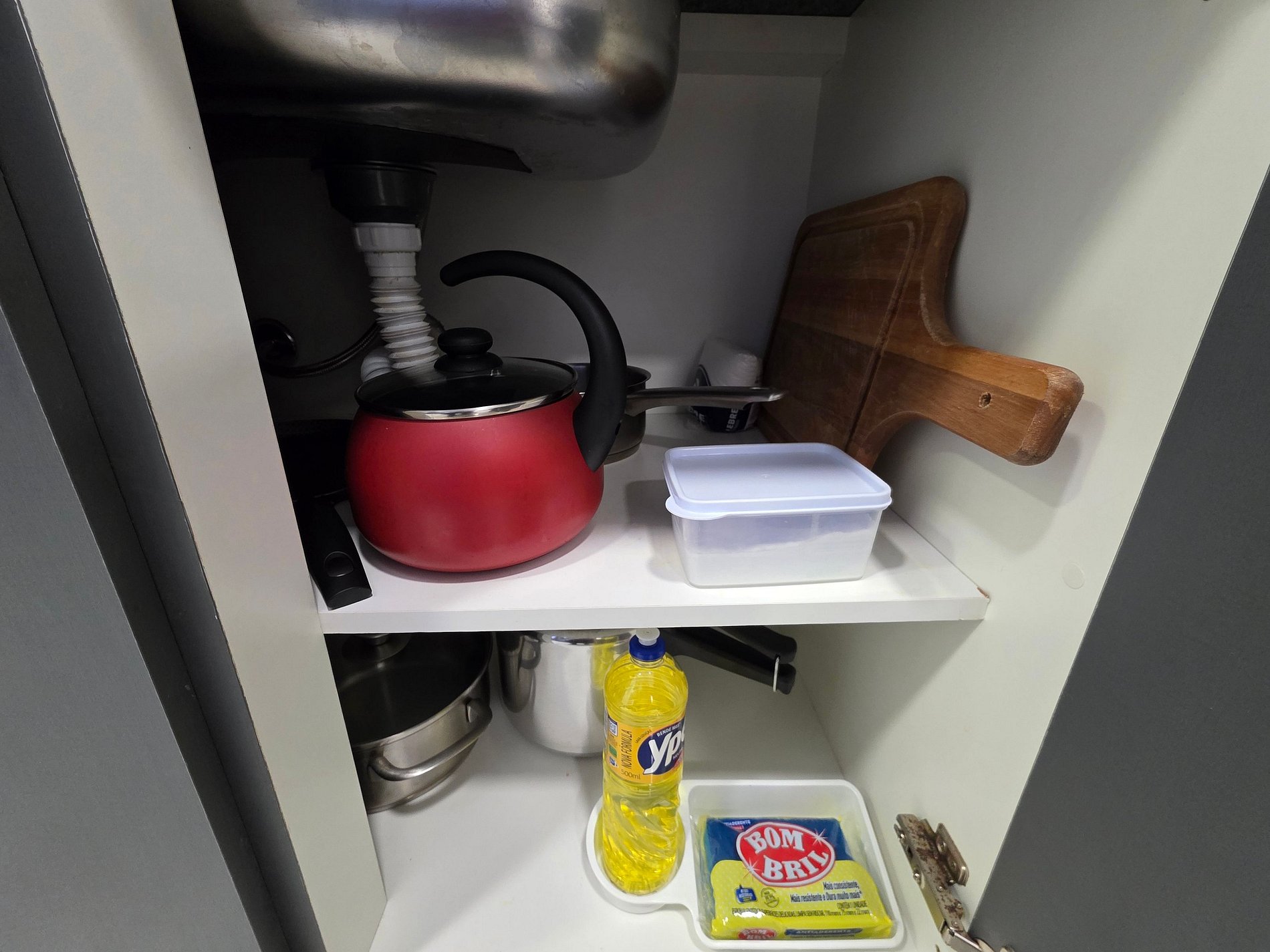 Cozinha completa com utensílios e louças para as refeições, microondas, liquidificador, sanduicheira.