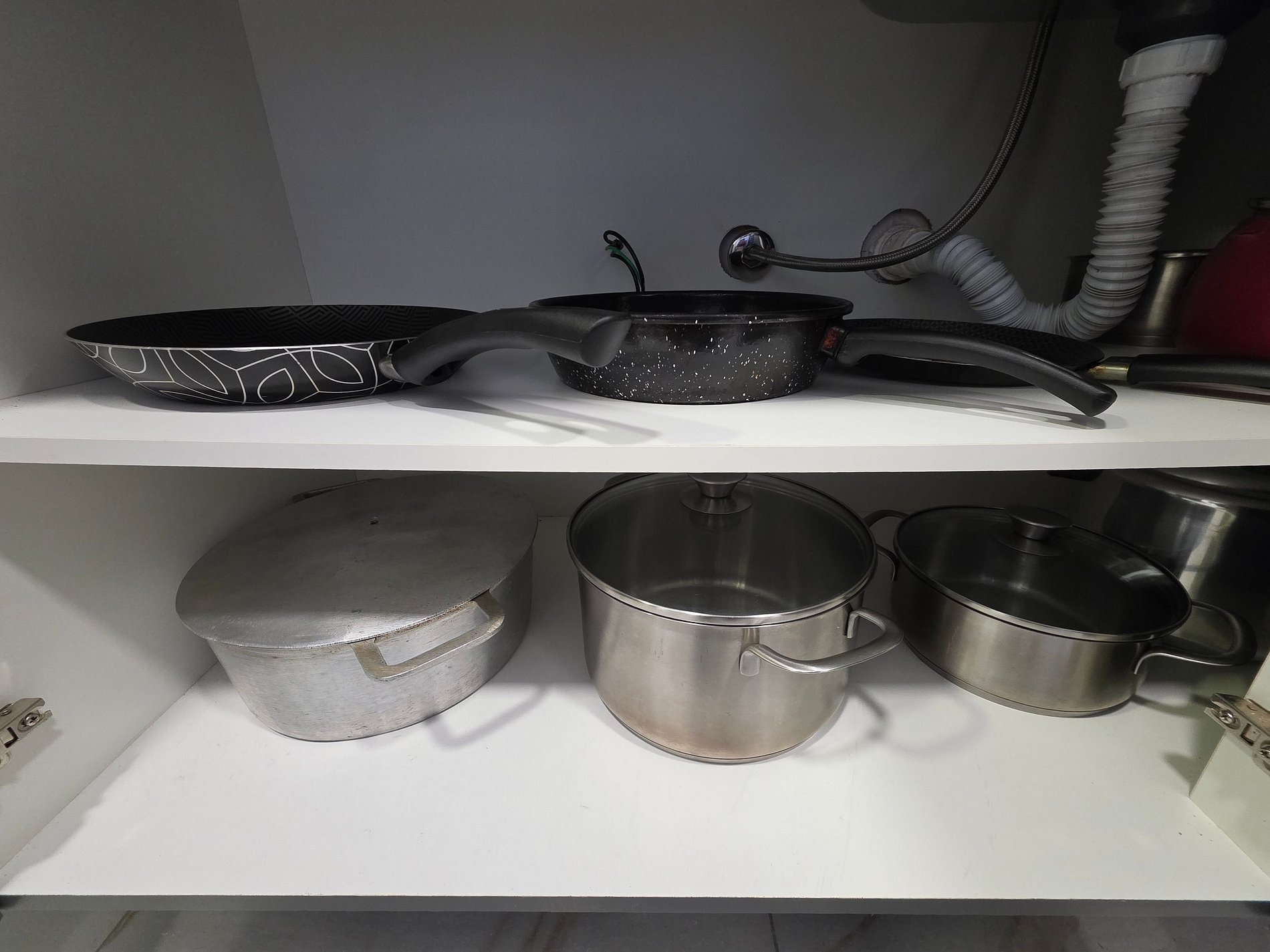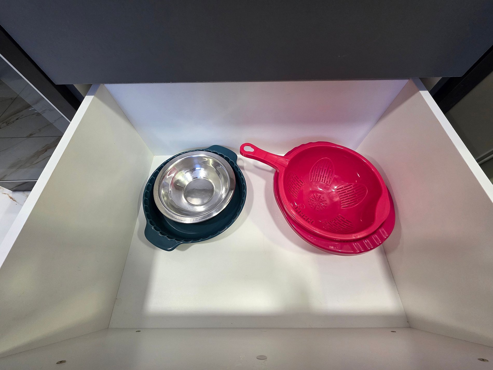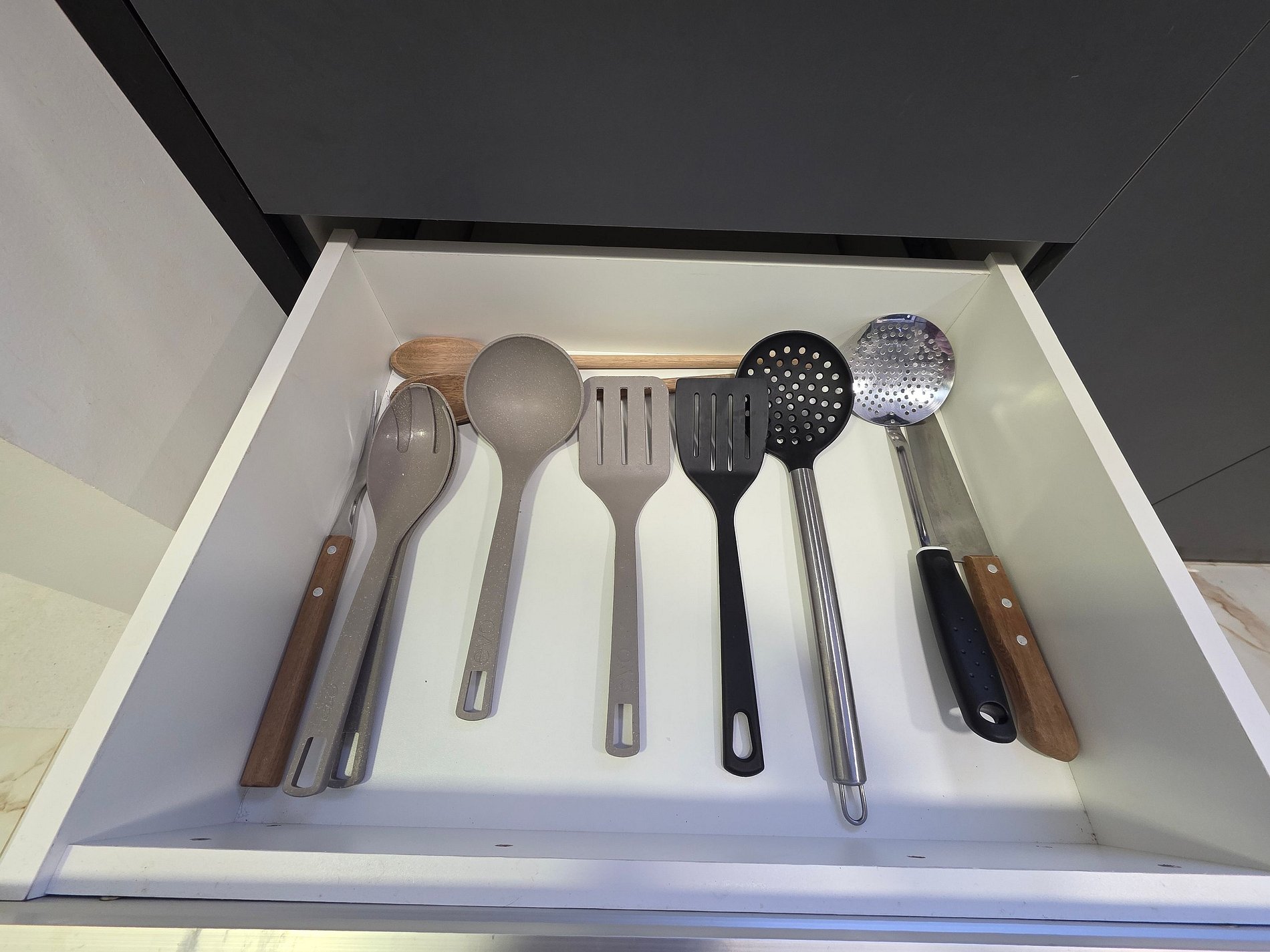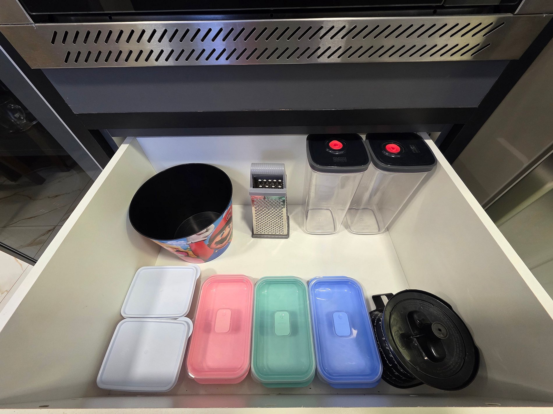 Cozinha completa com utensílios e louças para as refeições, microondas, liquidificador, sanduicheira.